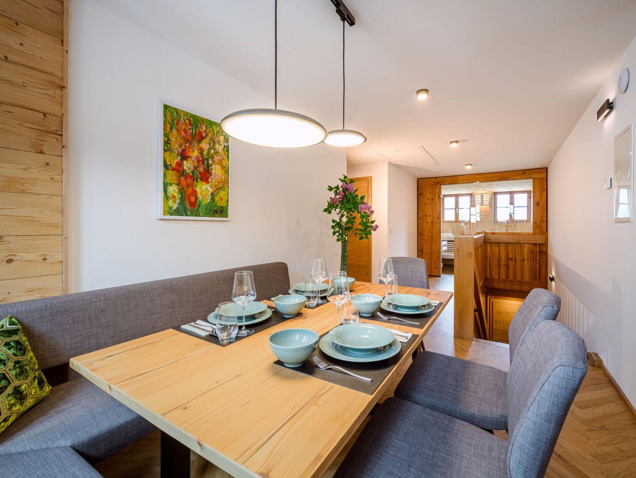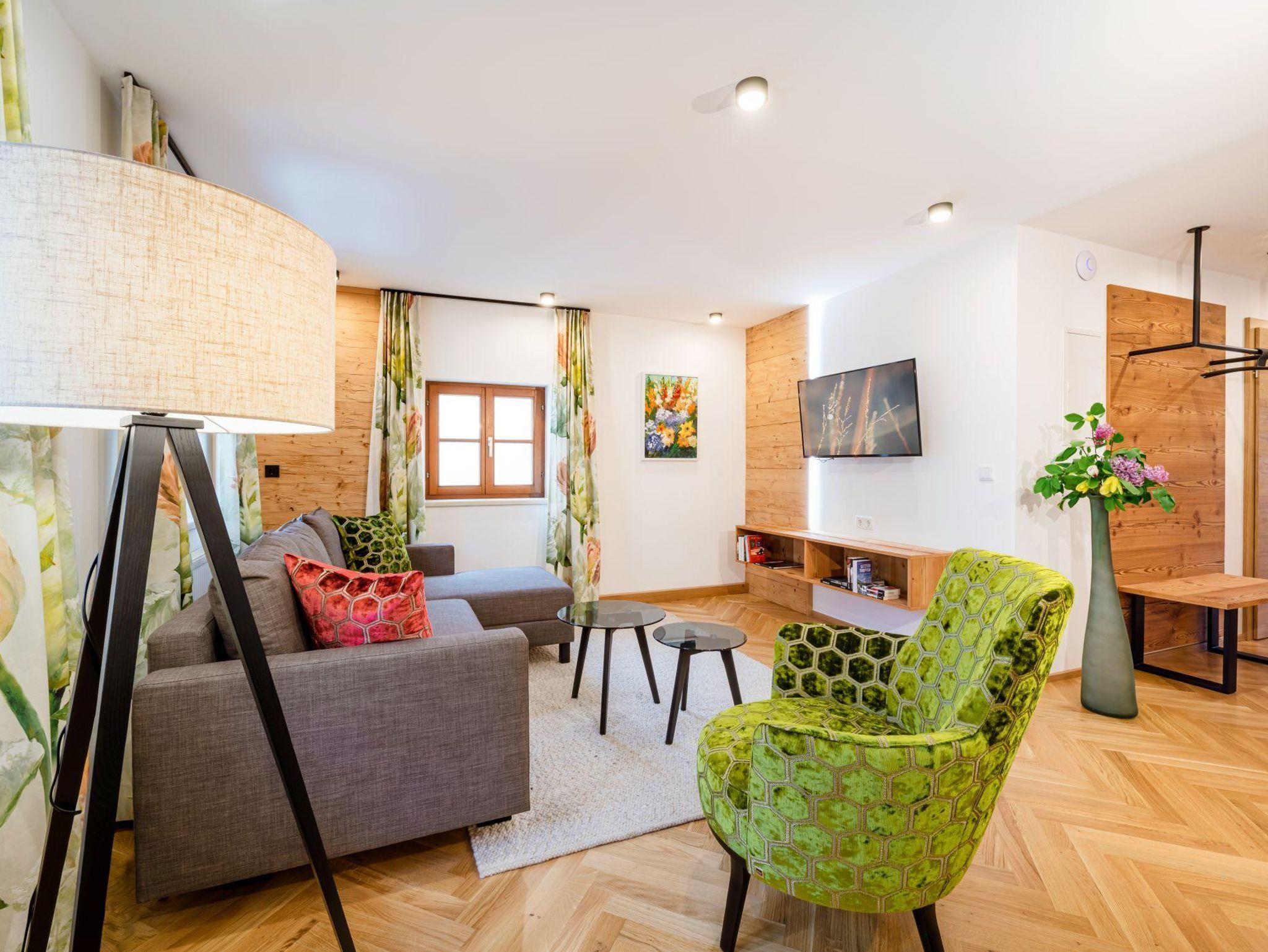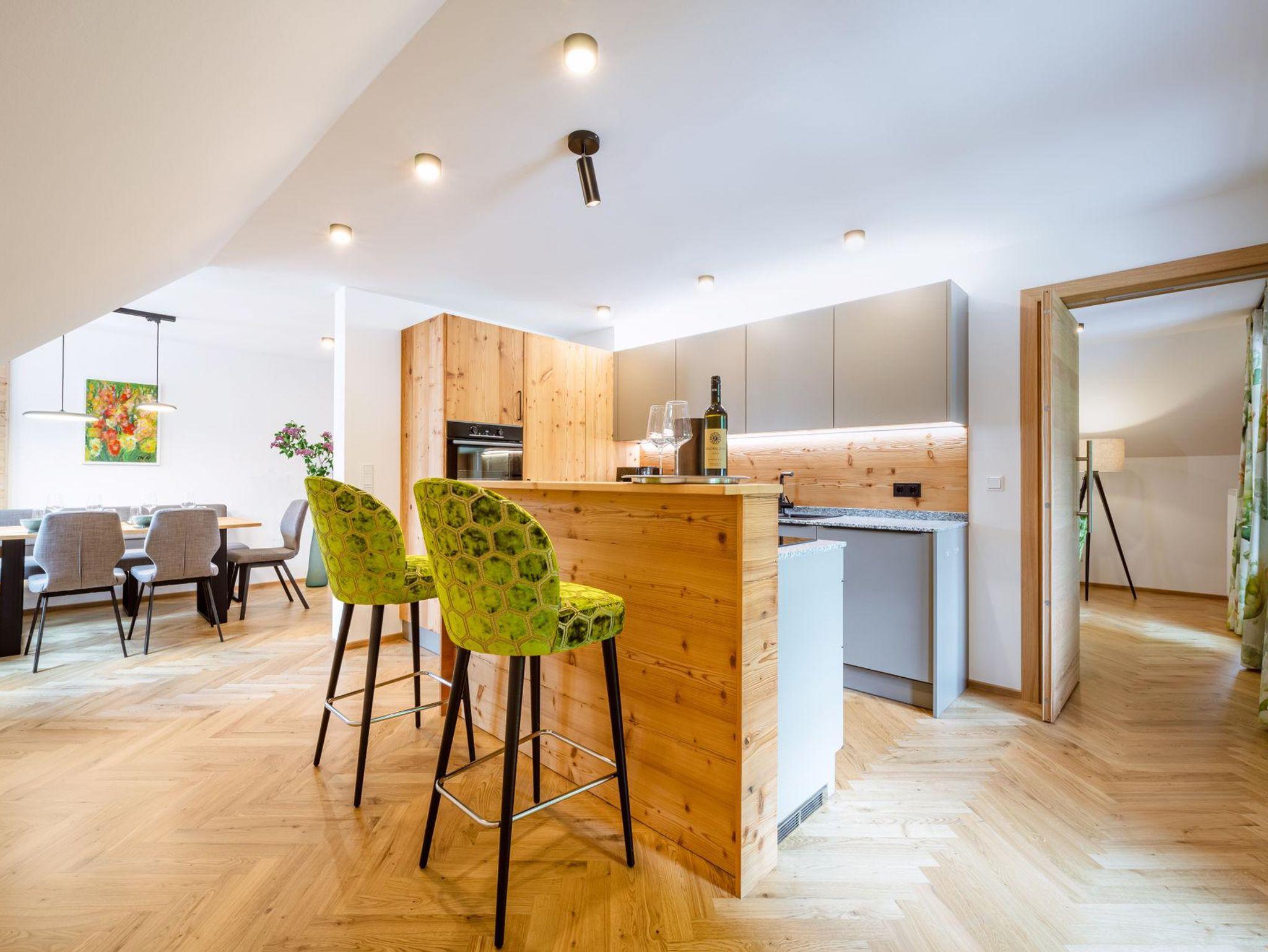 Sie wohnen in einer charmanten Haushälfte im 1. Stock mit einem herrlichen Balkon mit Blick auf den historischen Kirchplatz und den Grimming. Die Verwendung von natürlichen Materialien und regionale Handwerkskünste verleihen dem Interieur eine behagliche Atmosphäre. Eine ansprechende Auswahl an edlen Stoffen, Farben und Mustern verbindet stilvolles Design mit komfortablem Wohnen. Der hochwertige Parkettboden und das moderne Beleuchtungskonzept runden das luxuriöse Ambiente ab. Ein besonderes Highlight ist die eigene Sauna aus heimischem Fichtenholz, die für eine entspannte Auszeit sorgt.