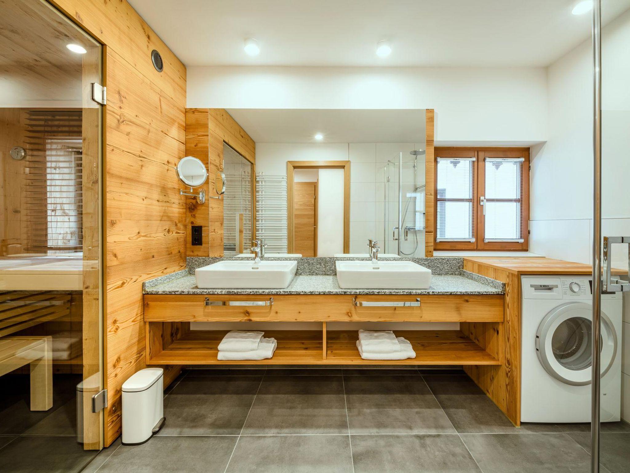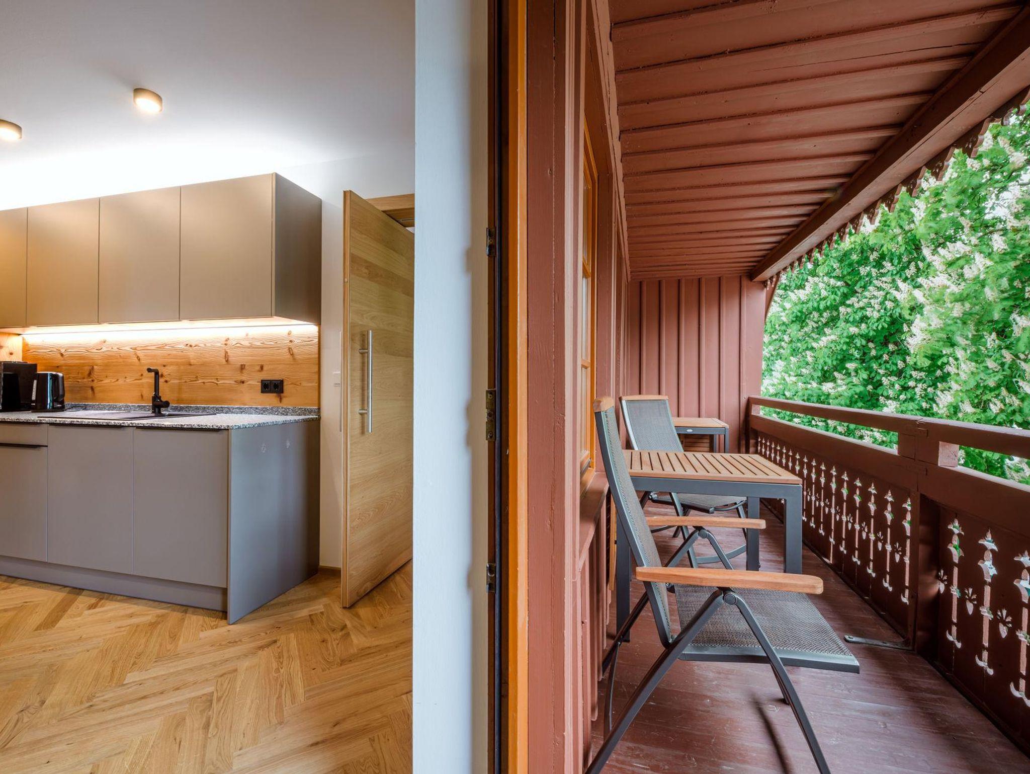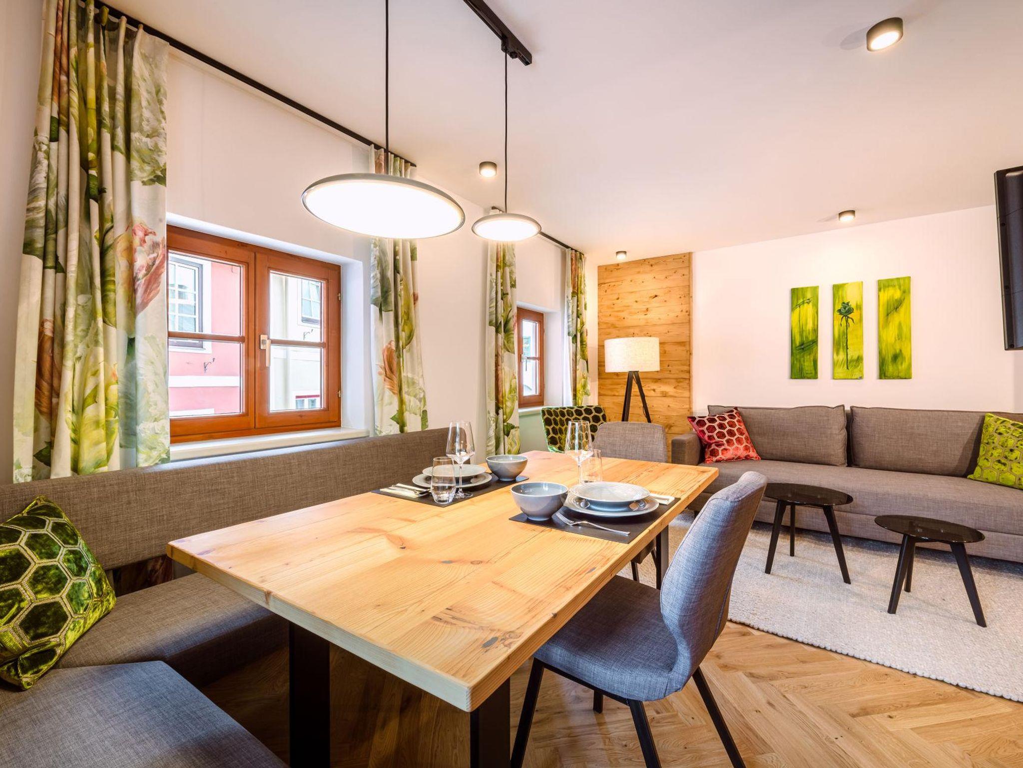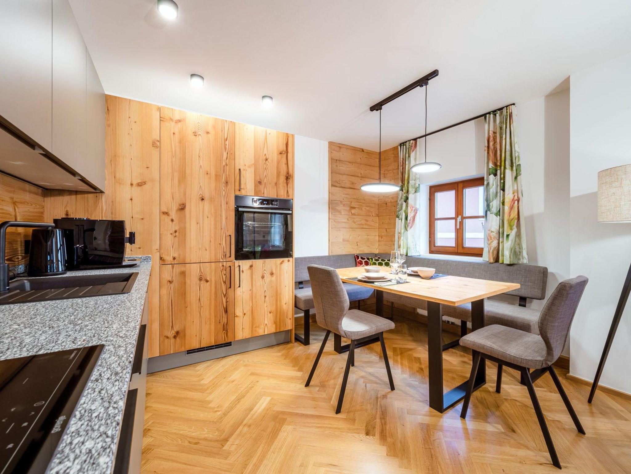 Sie wohnen in einer charmanten Haushälfte im 1. Stock mit einem herrlichen Balkon mit Blick auf den historischen Kirchplatz und den Grimming. Die Verwendung von natürlichen Materialien und regionale Handwerkskünste verleihen dem Interieur eine behagliche Atmosphäre. Eine ansprechende Auswahl an edlen Stoffen, Farben und Mustern verbindet stilvolles Design mit komfortablem Wohnen. Der hochwertige Parkettboden und das moderne Beleuchtungskonzept runden das luxuriöse Ambiente ab. Ein besonderes Highlight ist die eigene Sauna aus heimischem Fichtenholz, die für eine entspannte Auszeit sorgt.