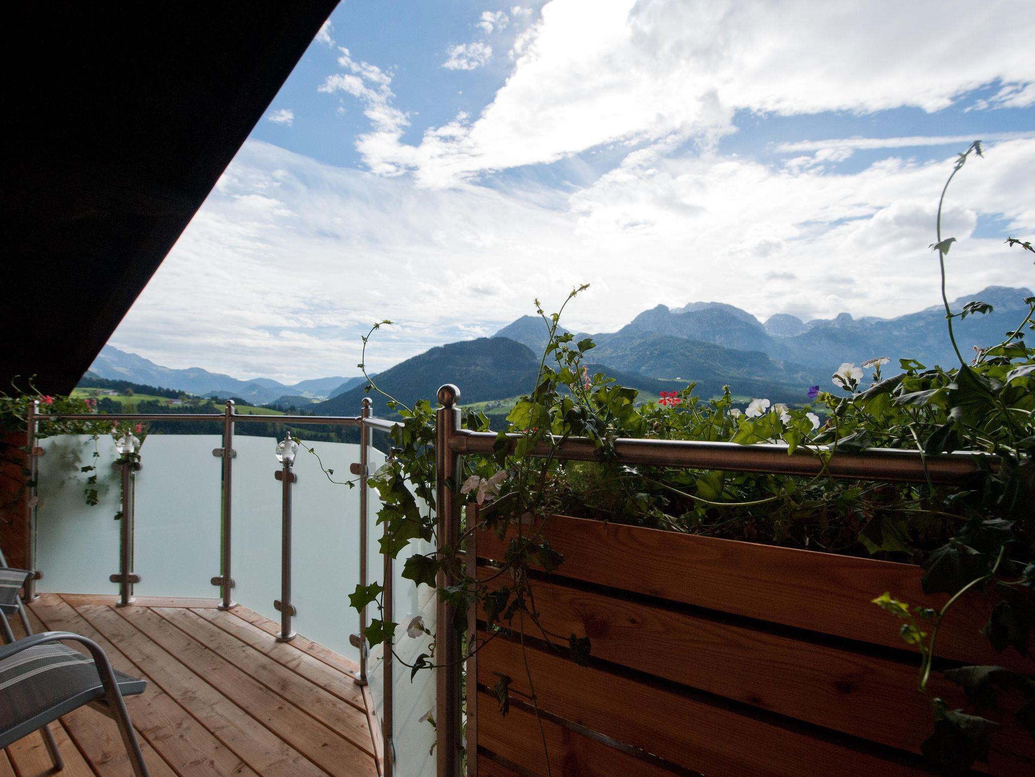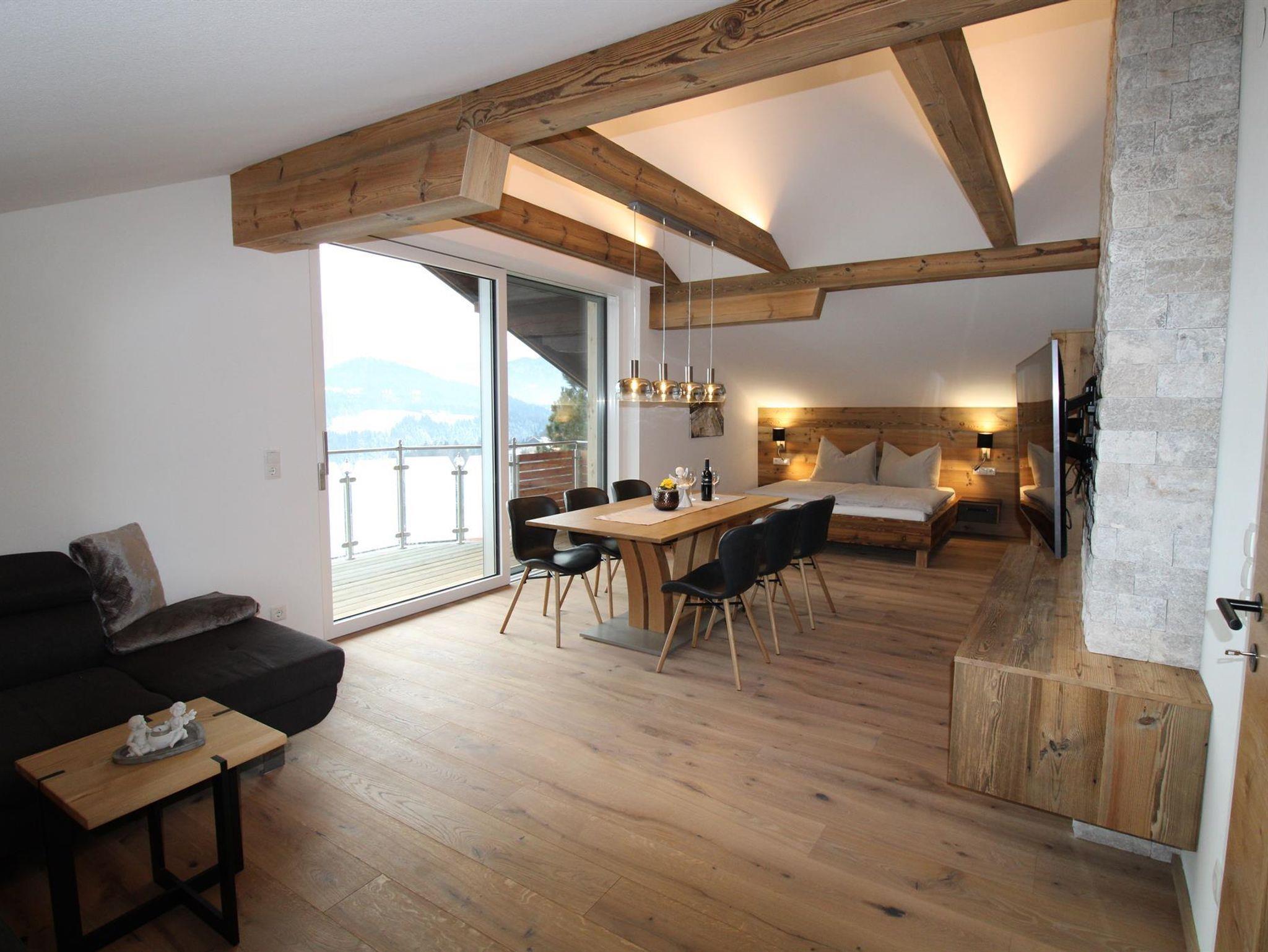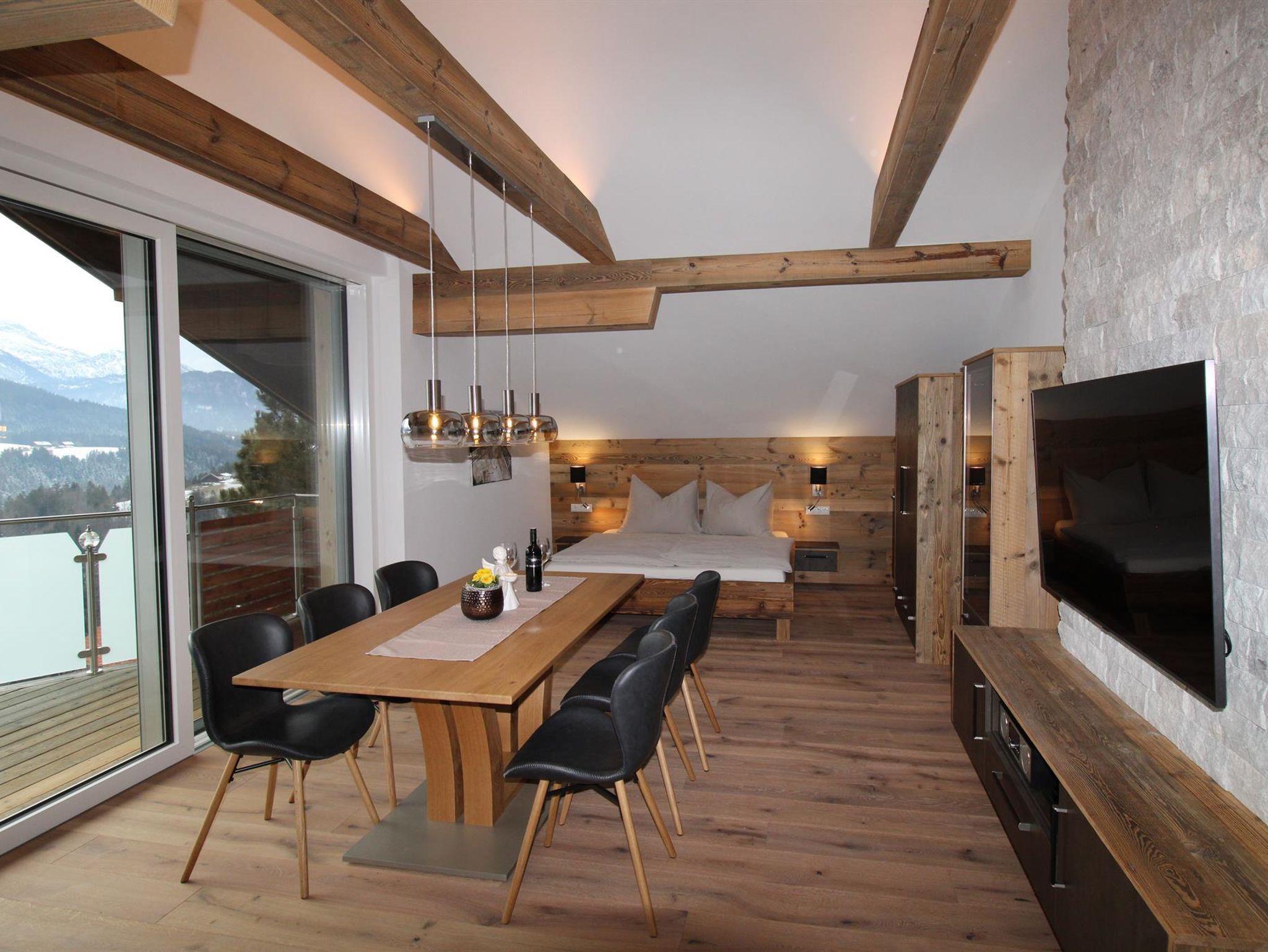 Unser Luxus-Appartment (75qm große, moderne Ferienwohnung im 3.OG mit Balkon) bietet sich besonders für Familien mit Kindern an. Sie verfügt über 2 getrennte Schlafzimmer (ein Wohn-Schlafraum mit Doppelbett, ein separates Schlafzimmer/Dreibettzimmer - 1 Einzelbett (90x200cm), 1 Doppelbett (180x200cm), Wohn-Schlafzimmer mit gemütlicher Couch und Esstisch mit 6 Stühlen, LED-TV, Radio, DVD, kostenl. W-LAN;, zwei Duschen mit WB, 2 WC´s (1 WC extra, 1 im Bad) und einer voll ausgestatteten Küchenzeile mit Besteck, Tischwäsche und sonst. Utensilien. Der Ausblick vom Balkon im dritten Stock vom PANORAMAFENSTER auf die Berge ist atemberaubend. Unser Garten mit Gartenhütte und Kinderspielplatz (Poolbenützung kostenlos/saisonal, Grillmöglichkeit).