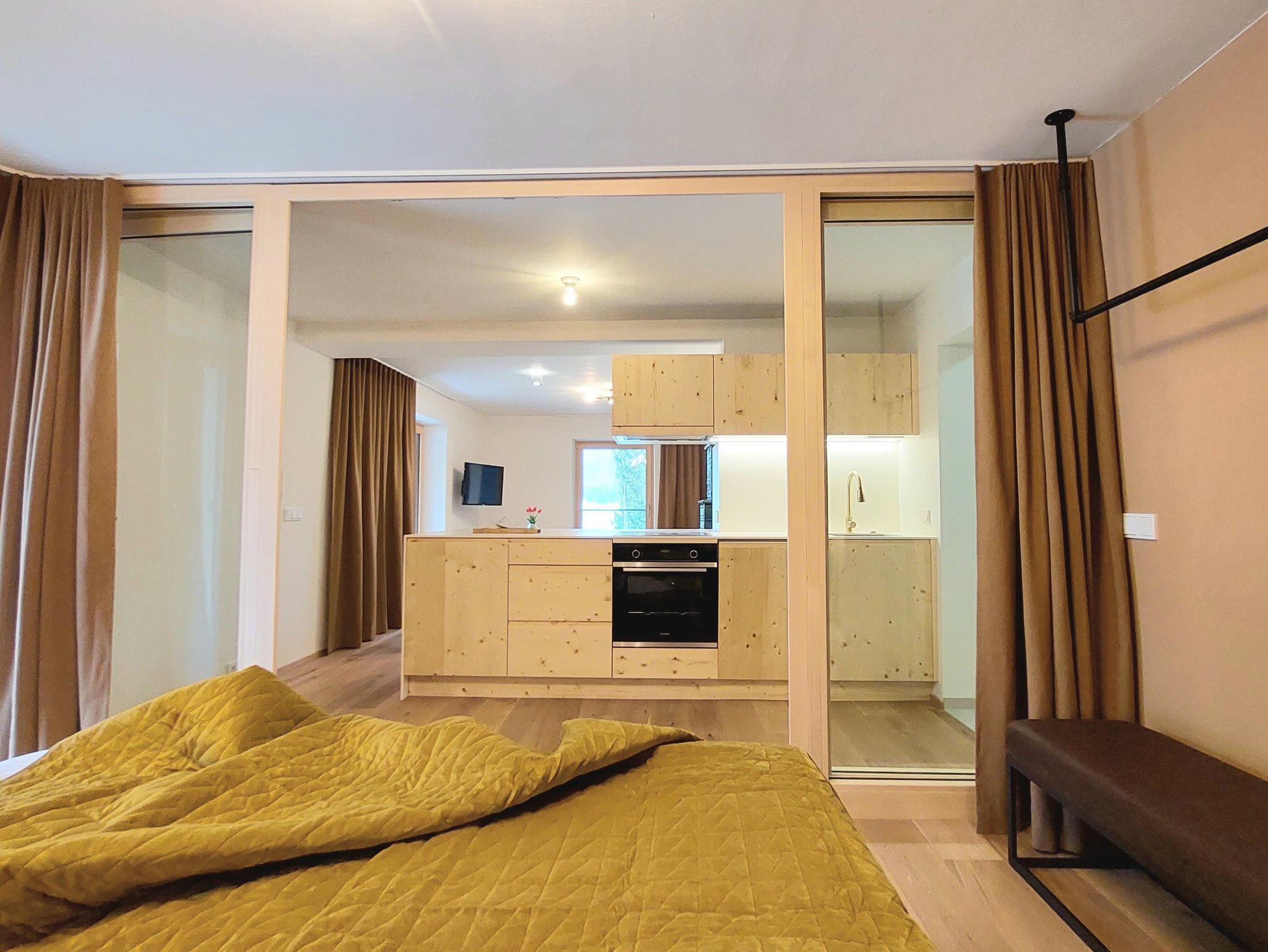 1 großzügiges Schlafzimmer mit Balkon-Zugang, abgetrennt vom Wohnbereich