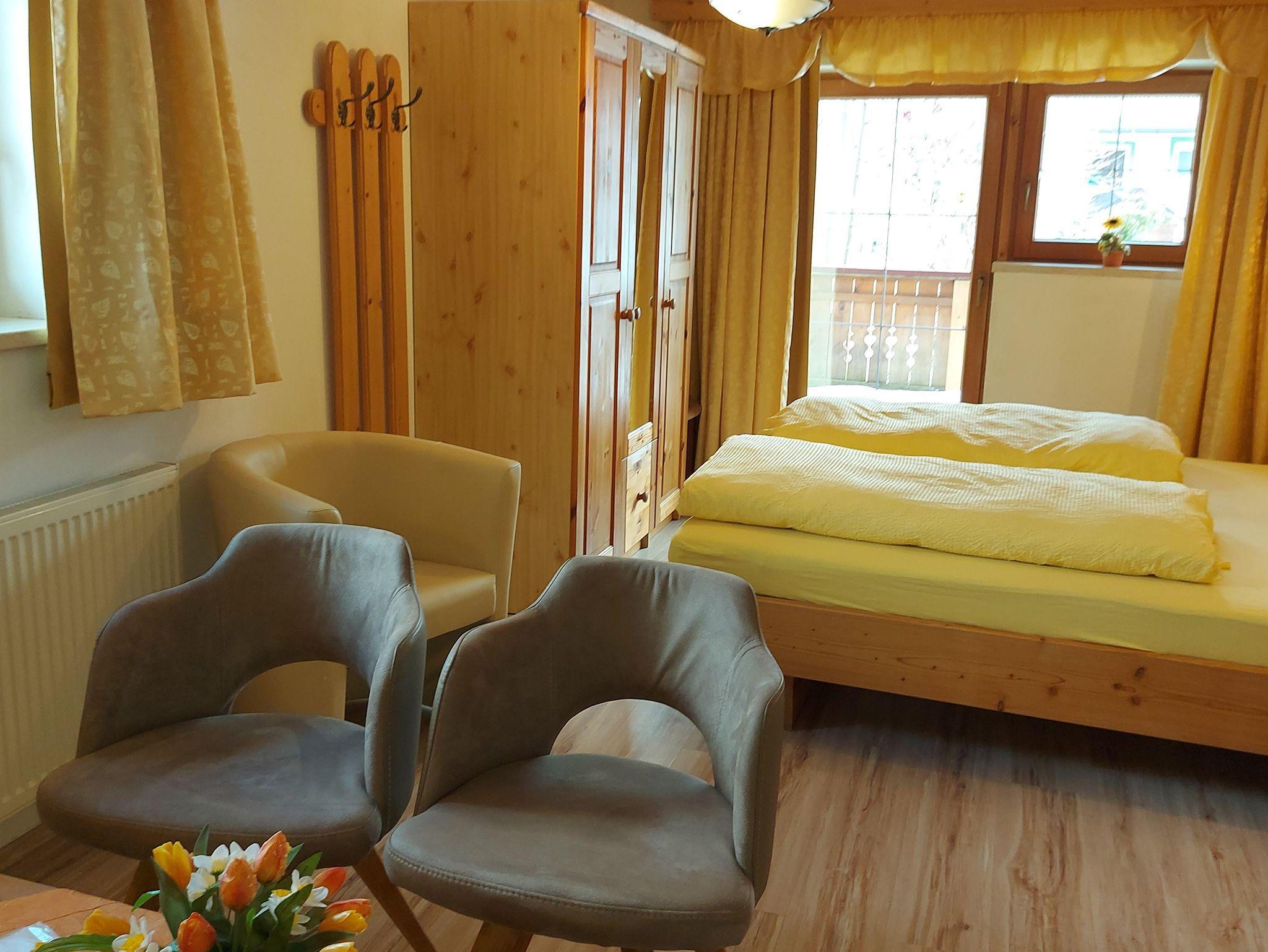 Die Ferienwohnung Bergblick ist ausgestattet mit einem Einzelzimmer mit Doppelcouch, einem Doppelzimmer mit Sitzecke und Sat-TV, einem großen Bad, einer kompletten Küche, einer Terrasse und Südbalkon.