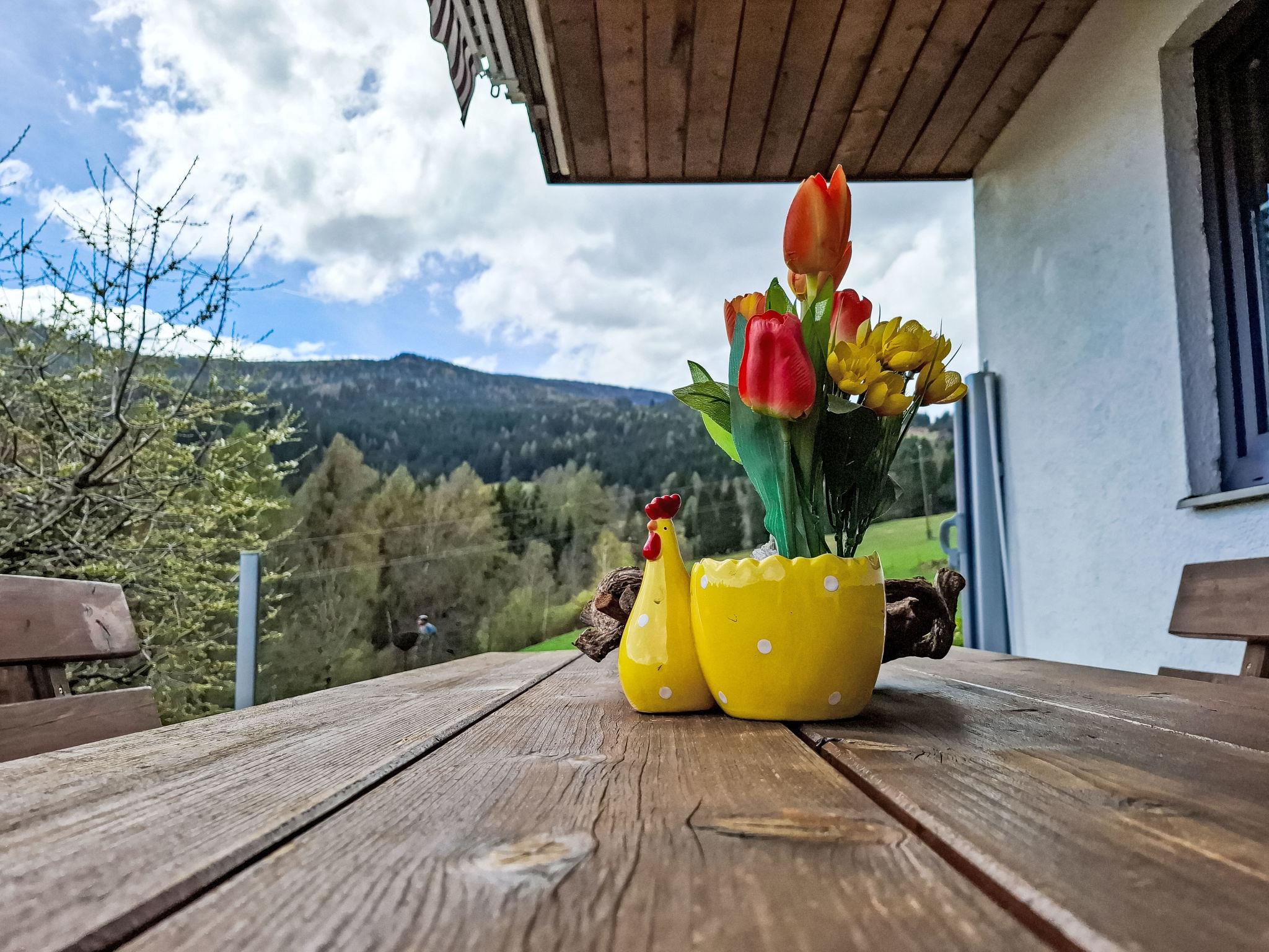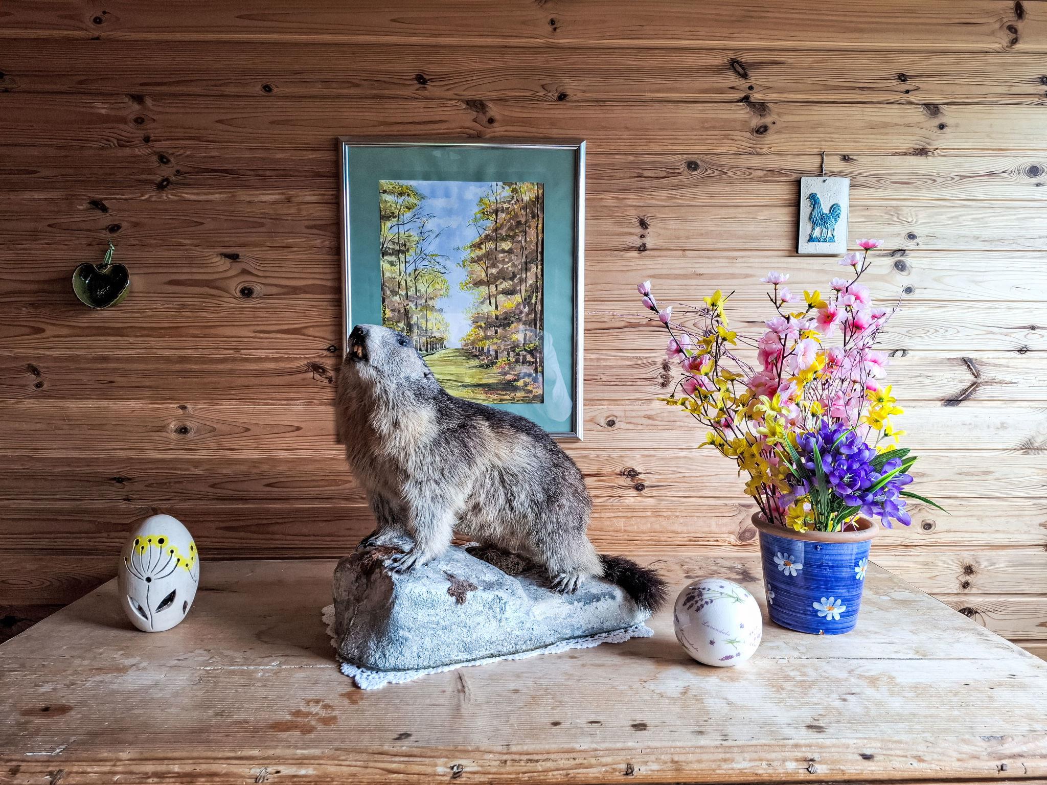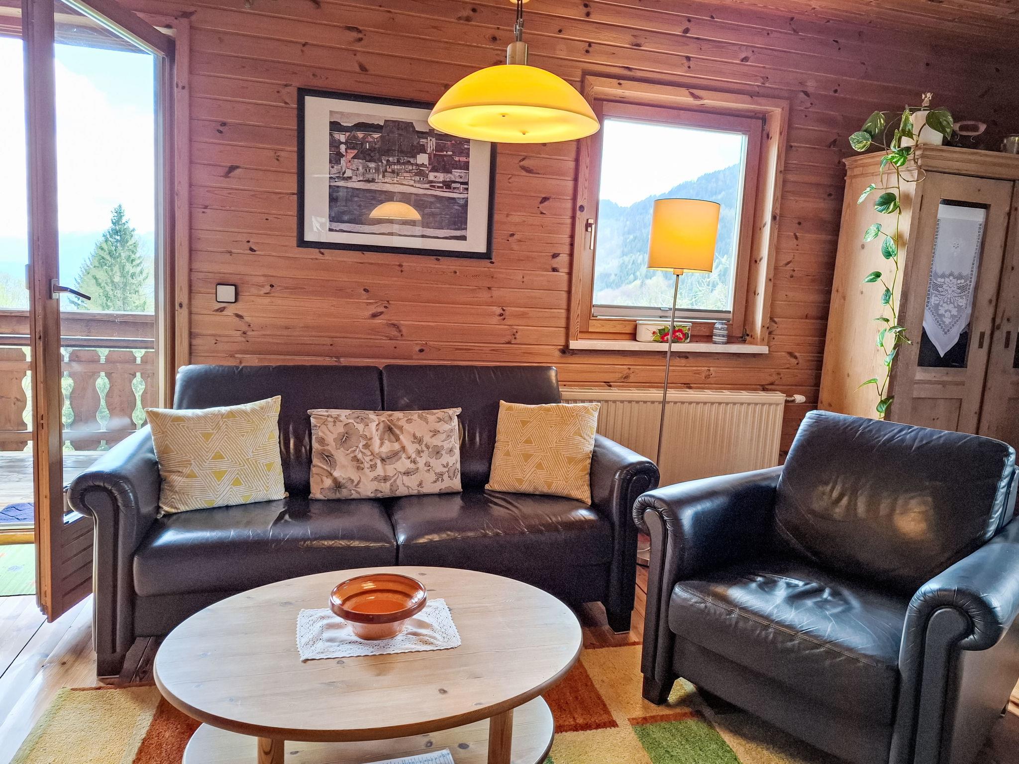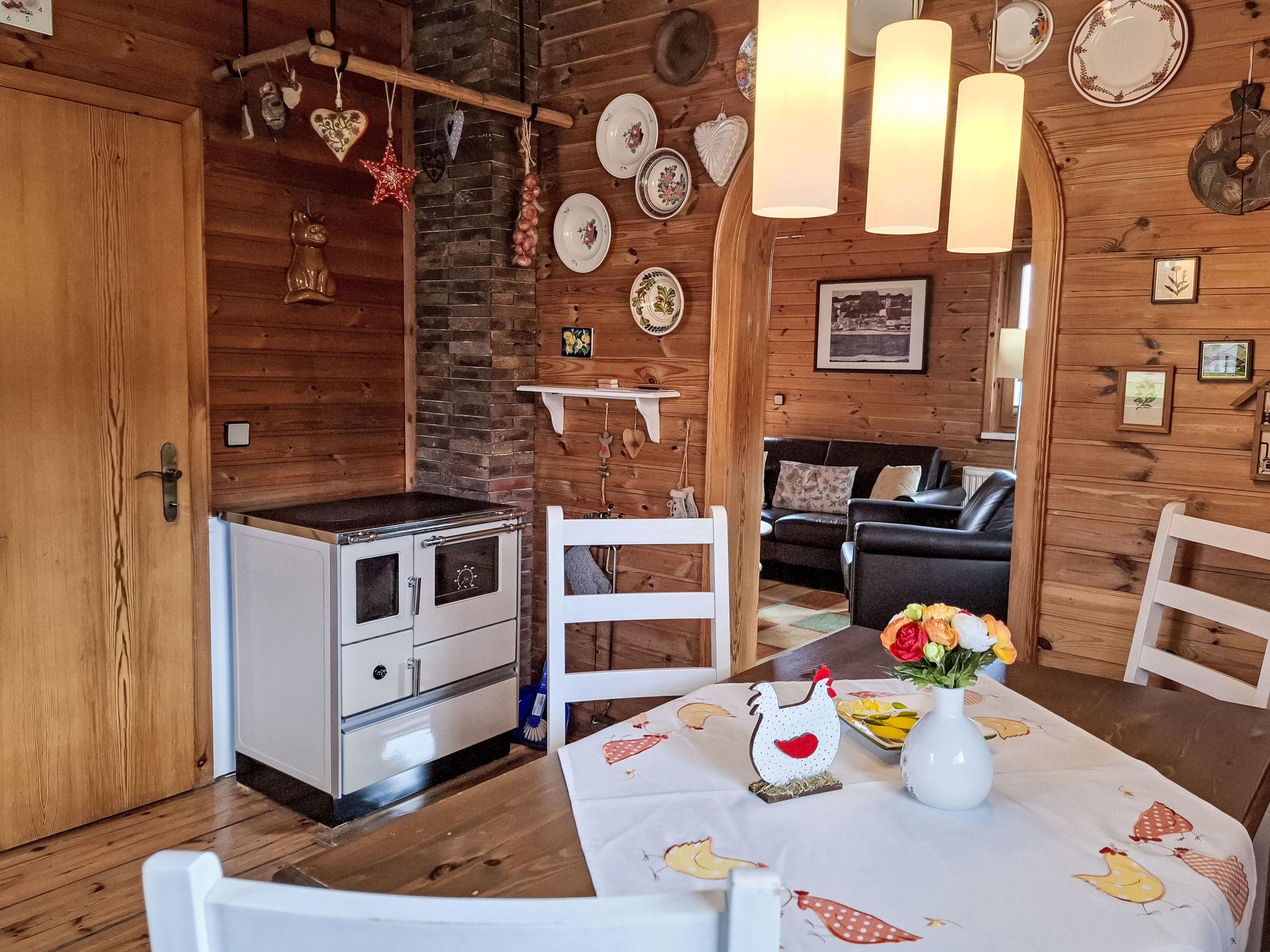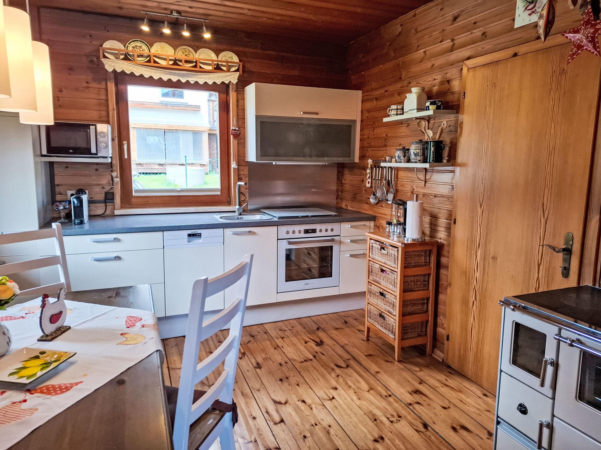 4-room house. Object suitable for 6 adults. Cosy and wooden furniture furnishings: living room with satellite TV. Exit to the balcony. 1 double bedroom with Dressing room. 1 room with 1 bed (120 cm, length 200 cm). Kitchen (oven, dishwasher, 4 ceramic glass hob hotplates, toaster, kettle, microwave, electric coffee machine, Capsules for coffee machine (Nespresso)) with dining table and wood-burning stove. Bathroom, sep. WC. Heating. Solar power. On the lower ground floor: living/sleeping room with 1 sofabed (90 cm, length 200 cm), 1 double sofabed (160 cm, length 200 cm), Scandinavian wood stove, dining nook, kitchen corner and flat screen. Exit to the terrace. Kitchenette (2 hot plates, electric coffee machine, Capsules for coffee machine (Nespresso)). Shower/WC. Wooden floors. Comfortable furnishings in the country house style. Balcony furniture. Beautiful panoramic view of the mountains. Facilities: washing machine, dryer. Internet (WiFi, free). Please note: suitable for families. Fridge without freezer, non-smoking house. Smoke alarm, fire extinguisher.