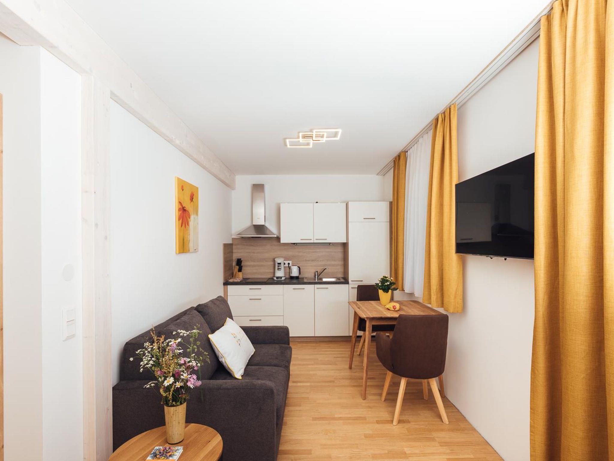 Modern eingerichtetes Appartement für 2 bis 4 Personen, Wohnzimmer mit Schlafcouch, Schlafzimmer, Badezimmer und Küchenzeile