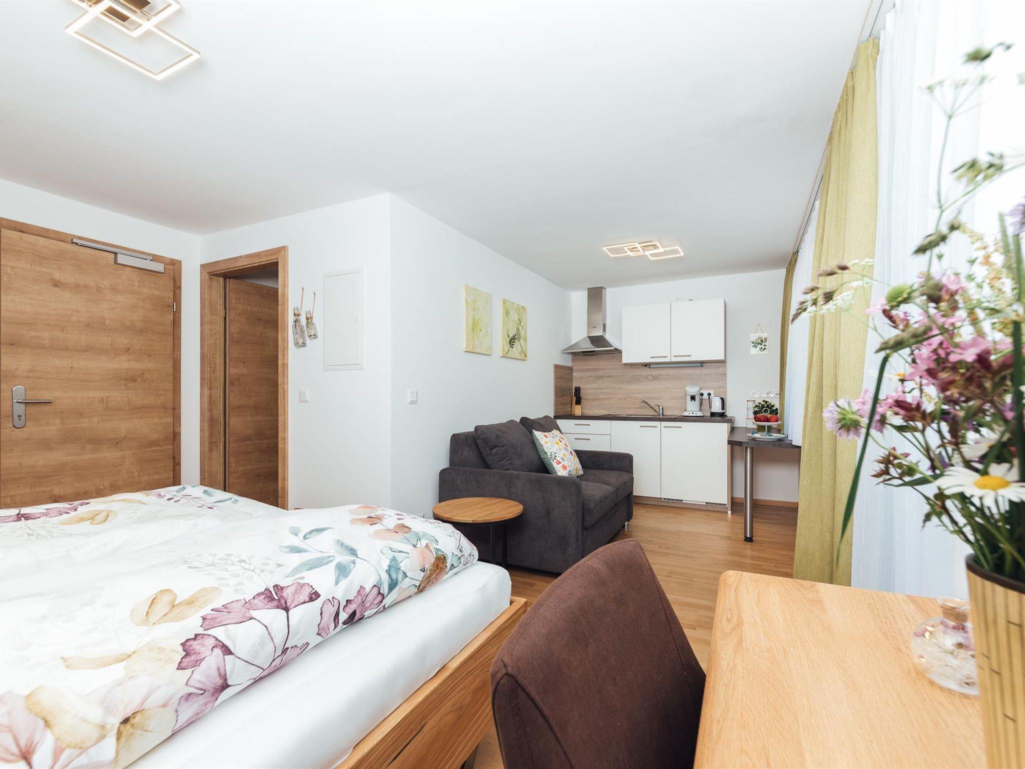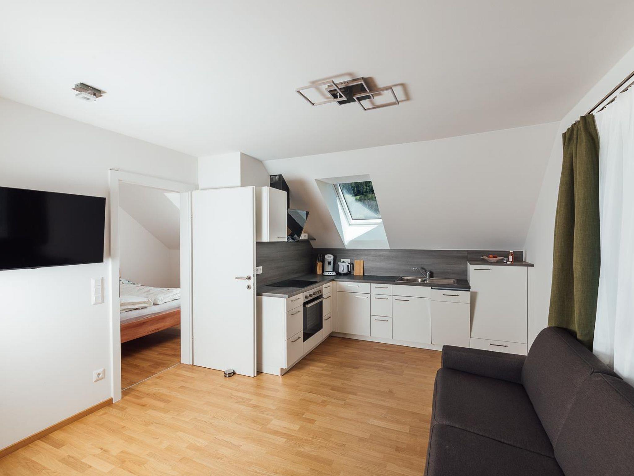 Modern eingerichtetes Appartement für 2 bis 4 Personen, Wohnzimmer mit Schlafcouch, Schlafzimmer, Badezimmer und Küchenzeile