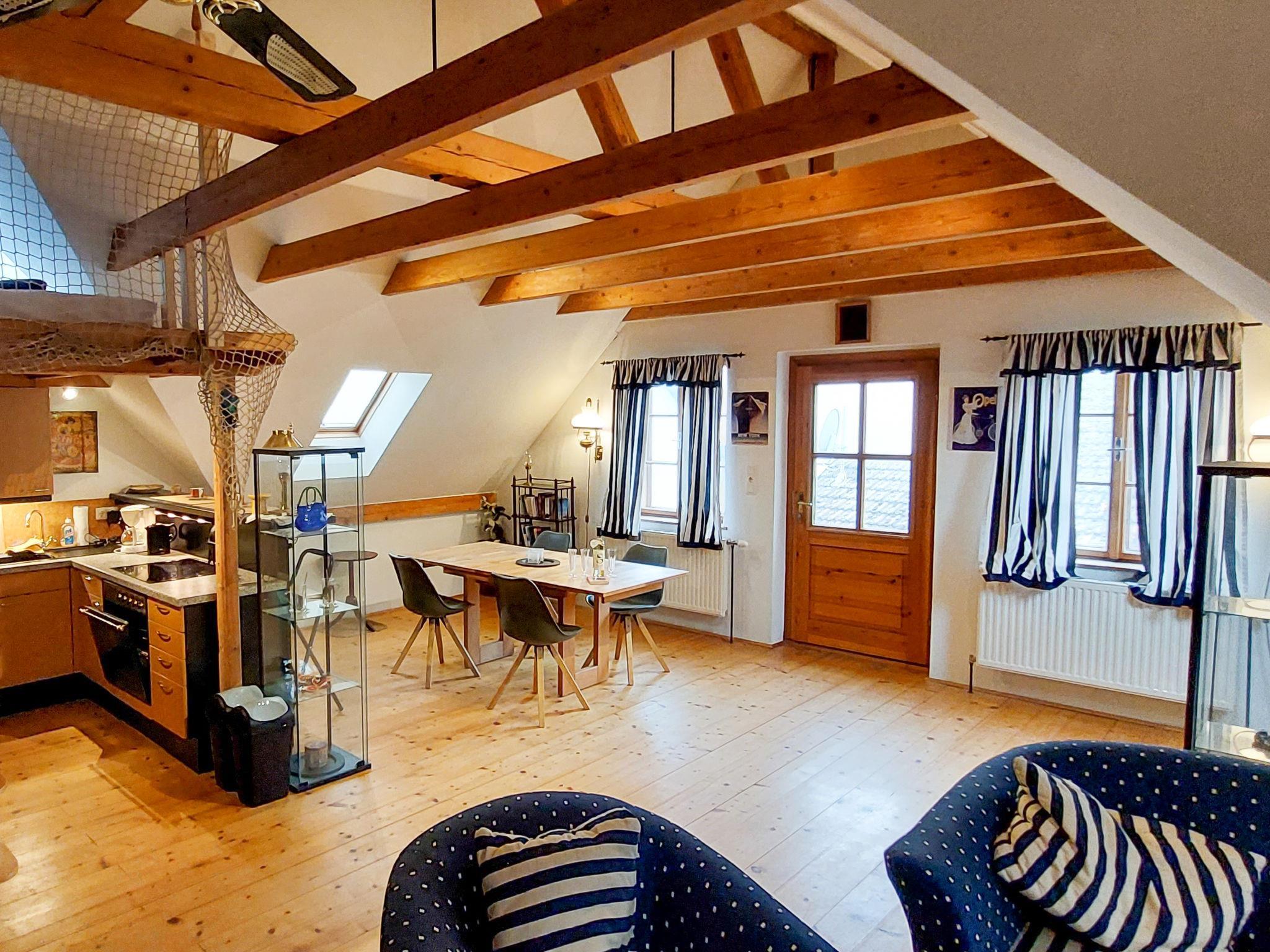 1-room Loft 70 m2, on the upper floor. Object suitable for 2 adults. Rustic and tasteful furnishings: open living/dining room with sloping ceilings with rooflight with 1 x 1 bunk beds (180 cm, length 200 cm). With sloping ceilings, open kitchen (4 hot plates, oven). Bath/WC. Heating. Wooden floors. View of the garden. Please note: non-smokers only. Private entrance.