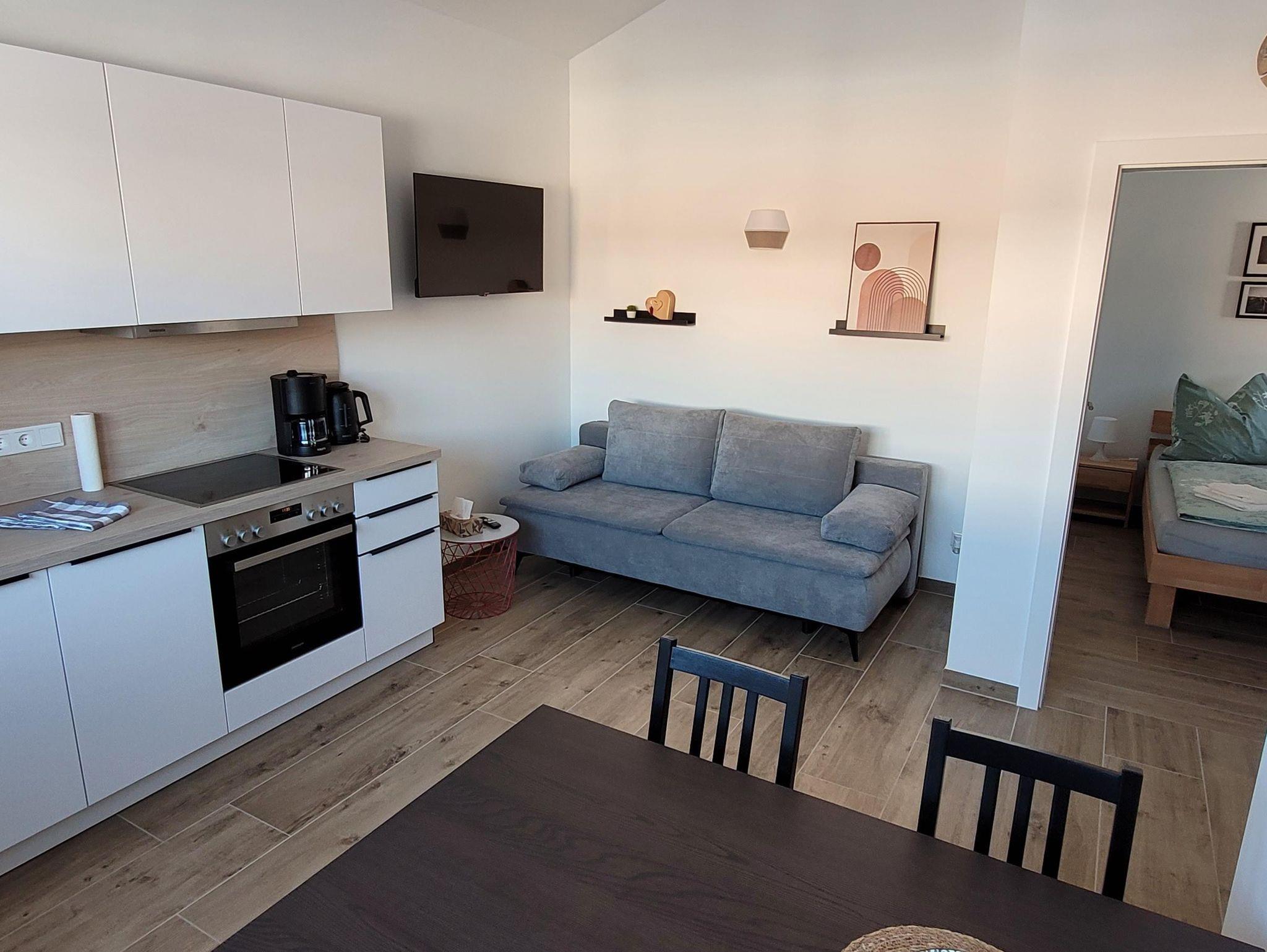 Unser Appartement verfügt über ein Schlafzimmer und einen Wohn-Schlafraum mit einem ausziehbaren Schlafsofa, Fernseher, WLAN, Ess-Sitzgruppe und eine Küchenzeile. Das kleine aber feine Badezimmer ist mit einer Dusche, Waschtisch mit Spiegel und WC ausgestattet
