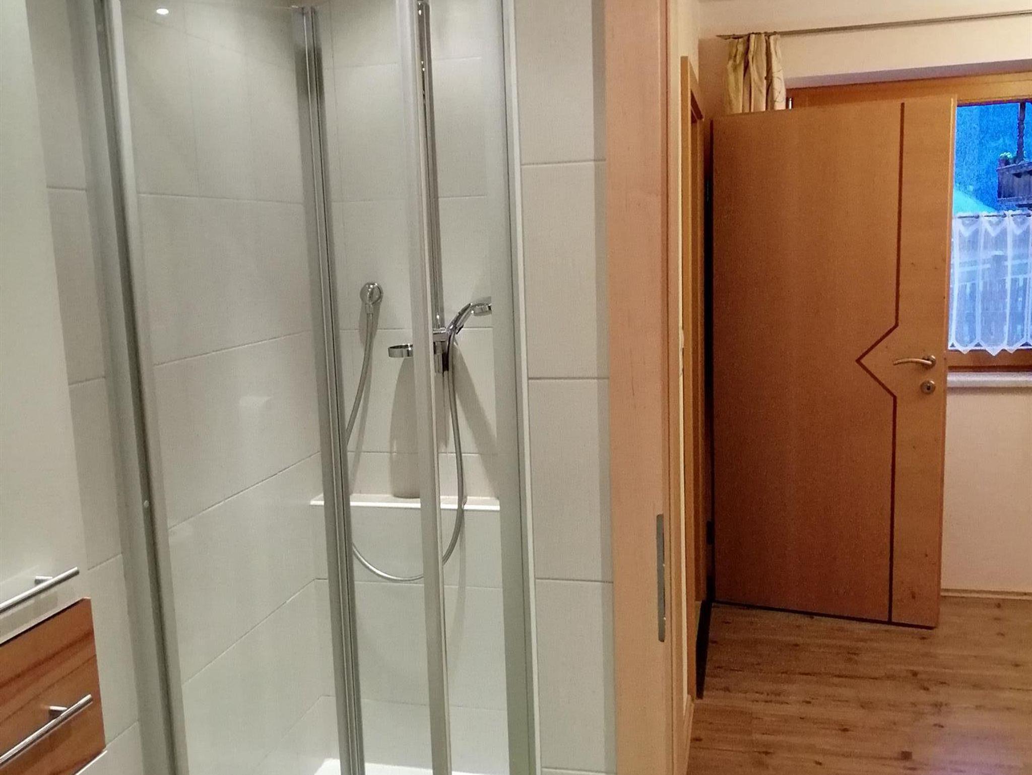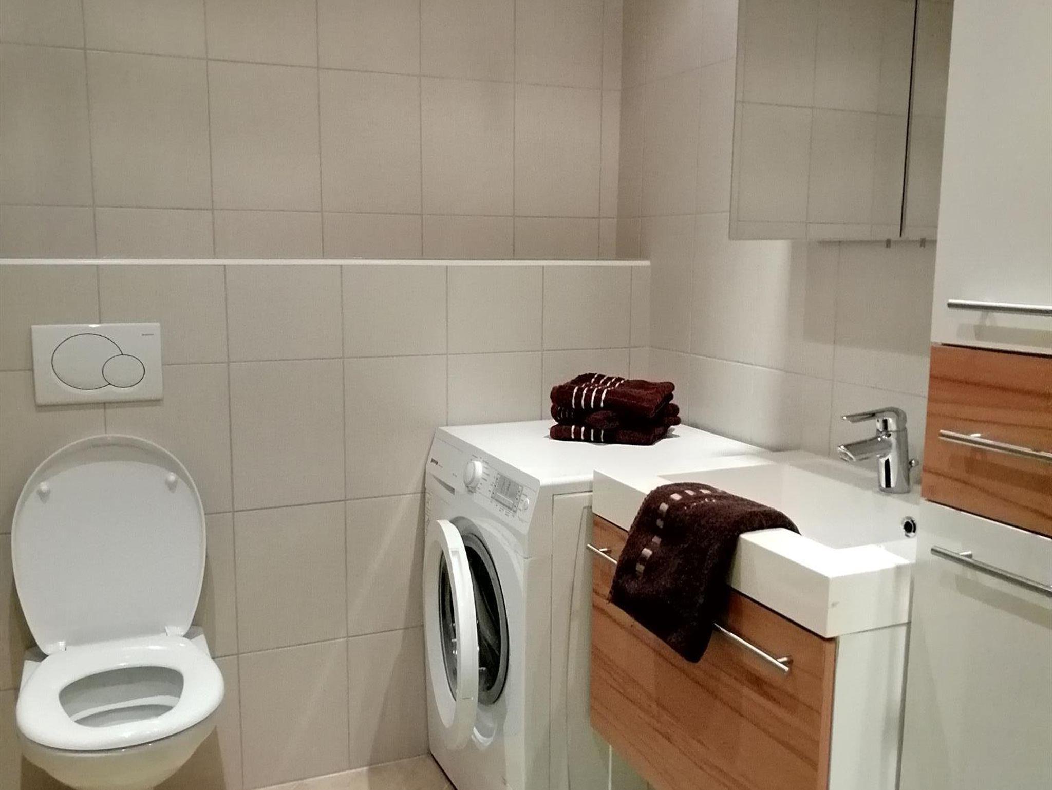 1 Bad mit Dusche und WC, Waschmaschine, Eingangsbereich.