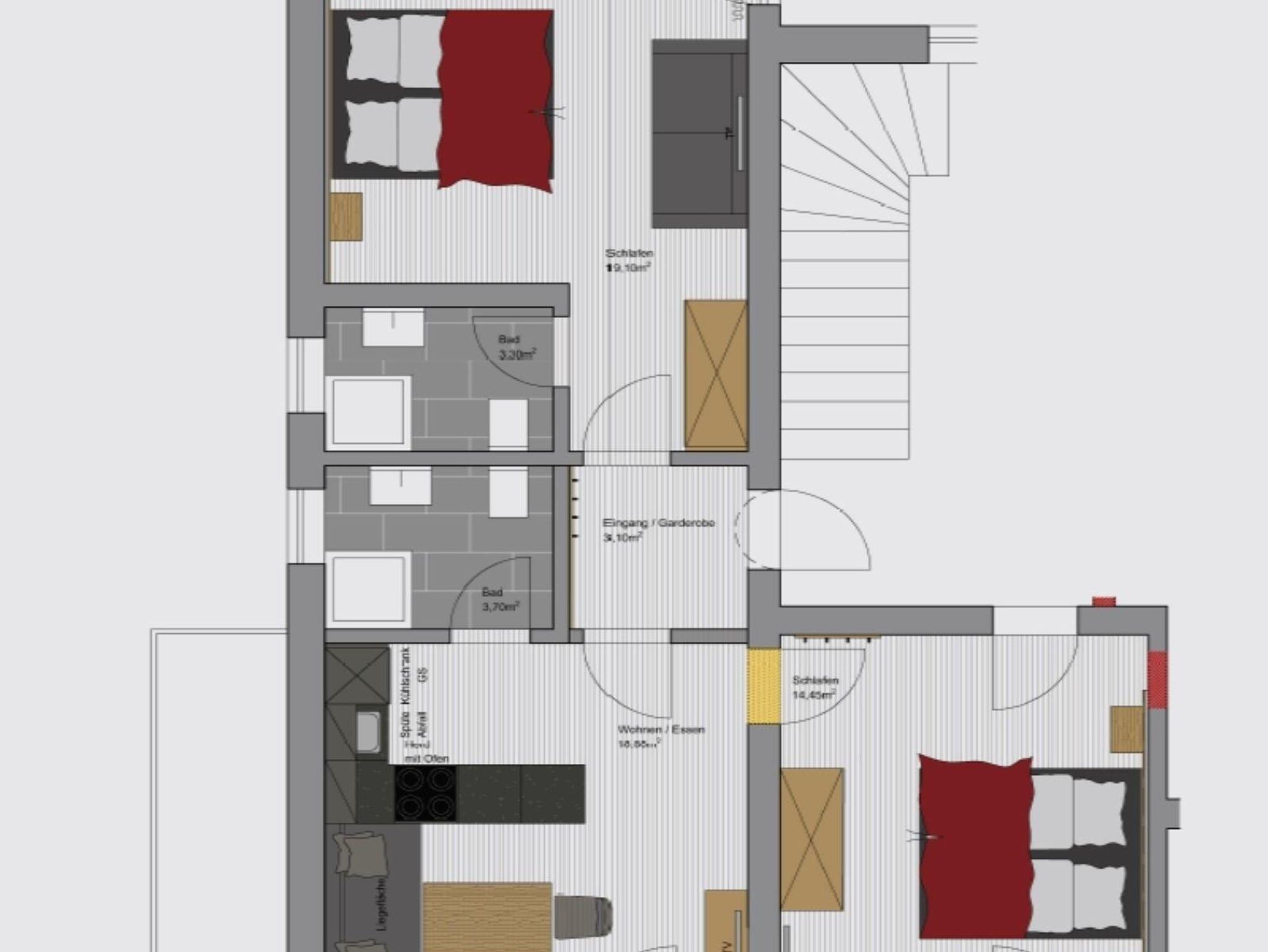 2 getrennte Schlafzimmer mit je 1 Doppelbett (Aufbettung 1 Extrabett für 1 Kind möglich)