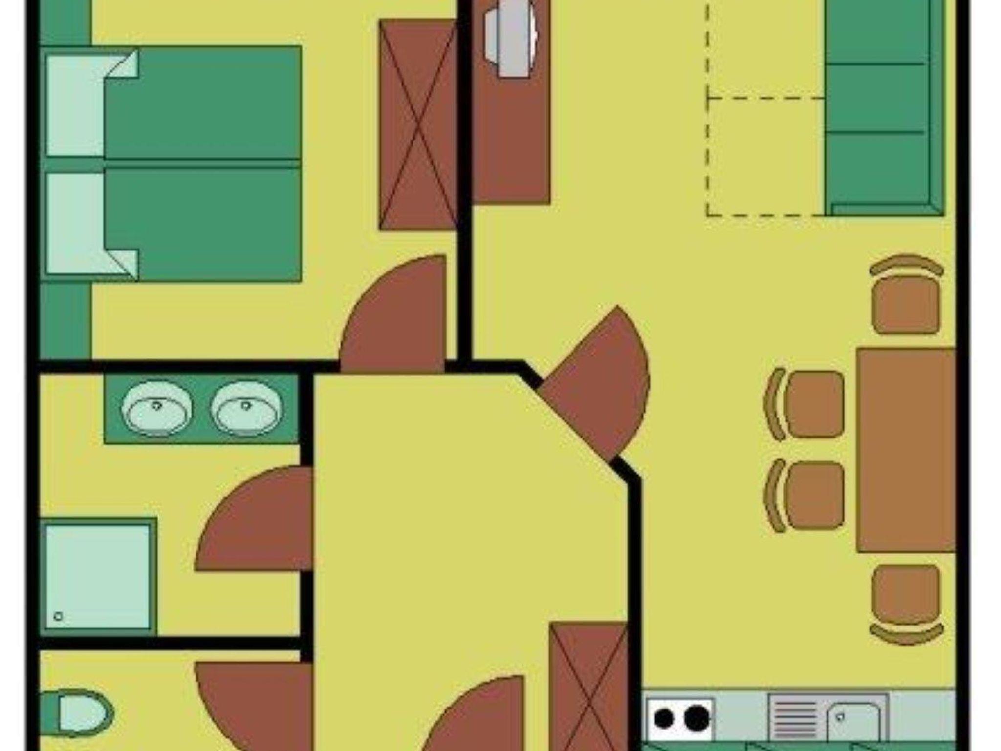 Ein 2-Raum-Appartement: Appartement für 4 Personen (30 qm), Wohnraum mit Küchenzeile, Esstisch und Schlafcouch für 2 Personen, Vorraum, Schlafraum für 2 Personen, DU/WC, Doppelwaschtisch.