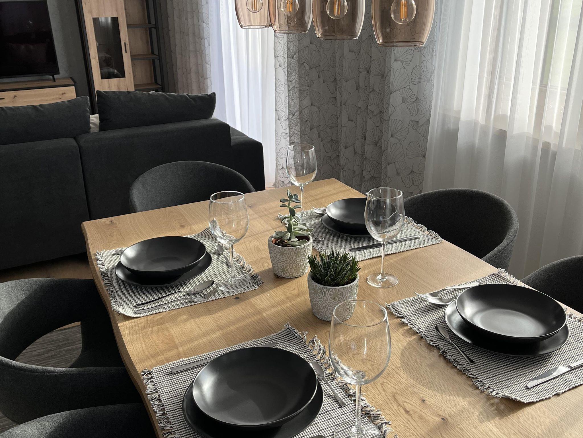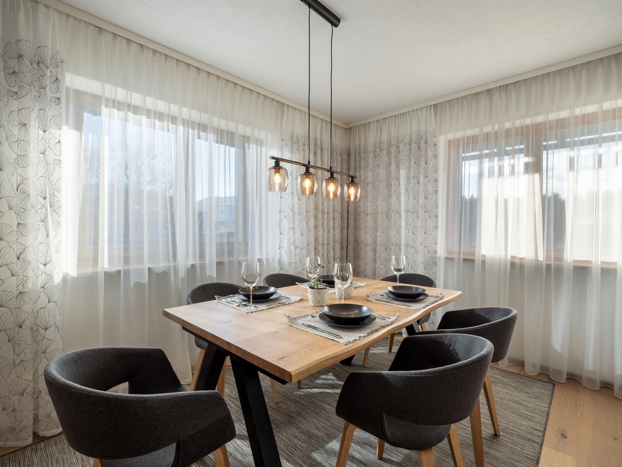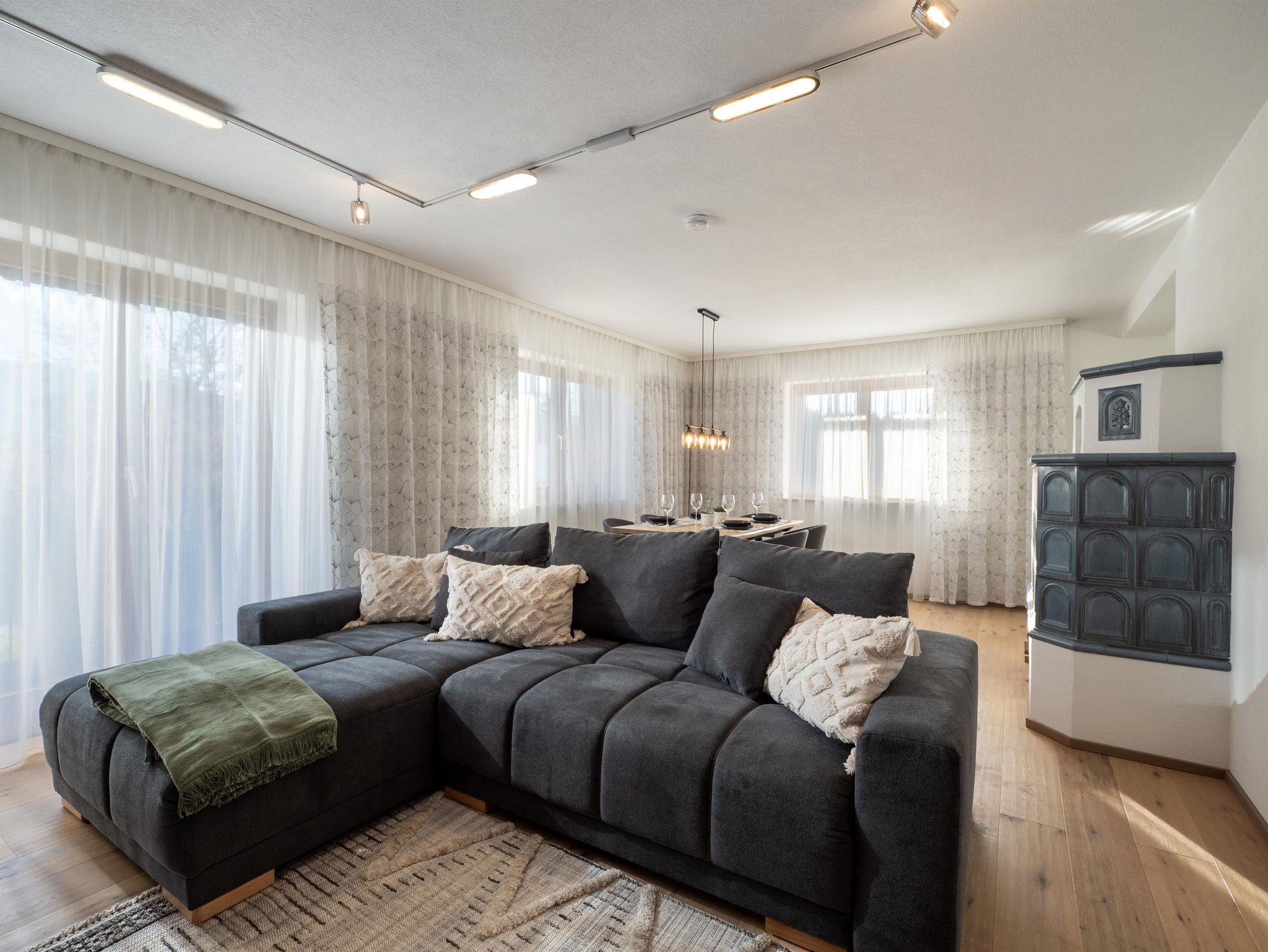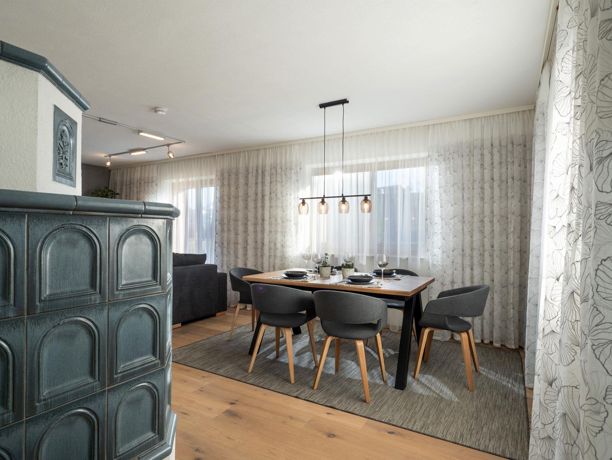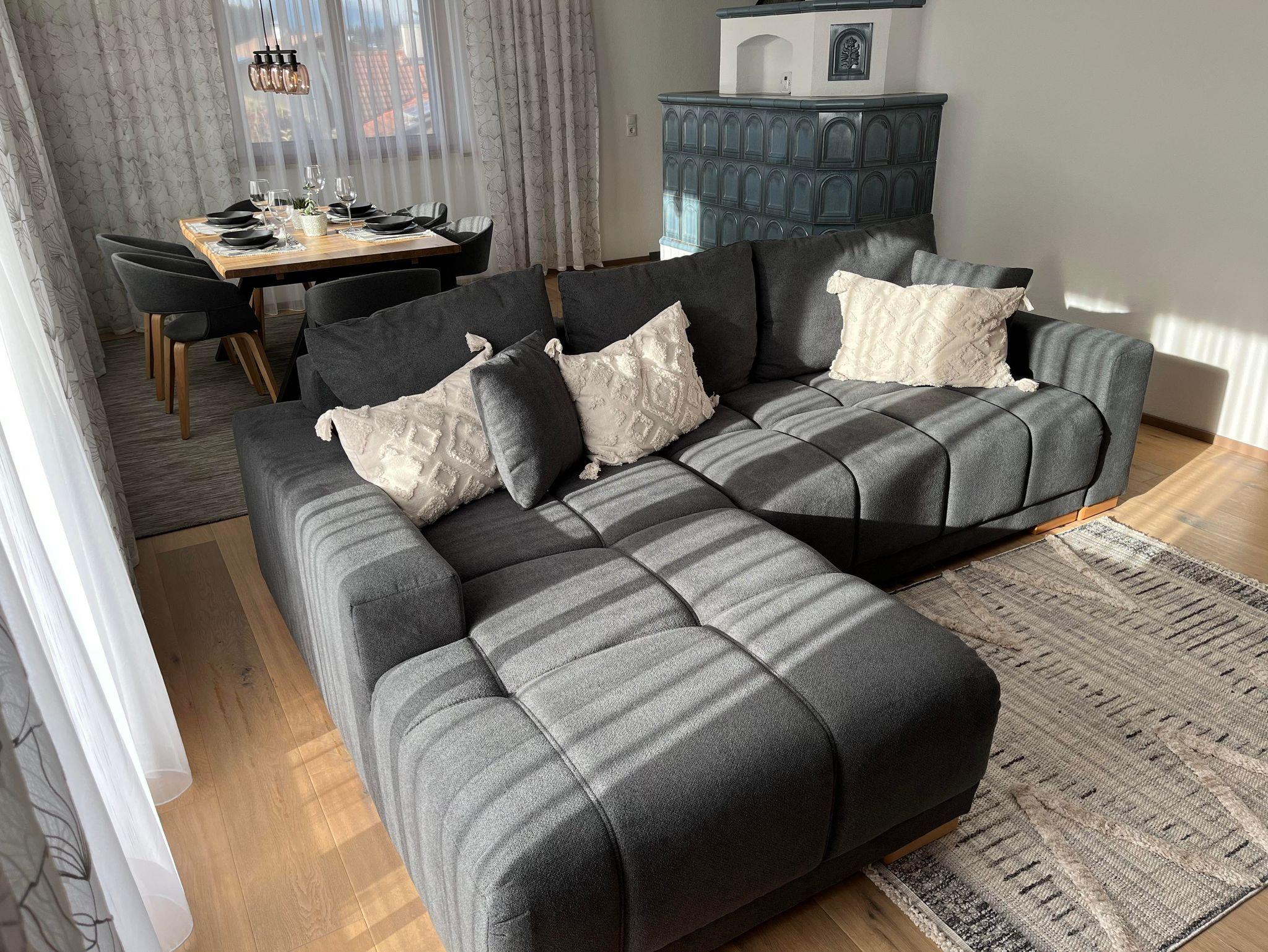 Der Wohn- und Essbereich umfasst eine große Sitzecke, die sich in ein gemütliches Schlafsofa verwandeln lässt. Der Essbereich hat genügend Platz um den Tag bei kuscheliger Kachelofenwärem ausklingen zu lassen.