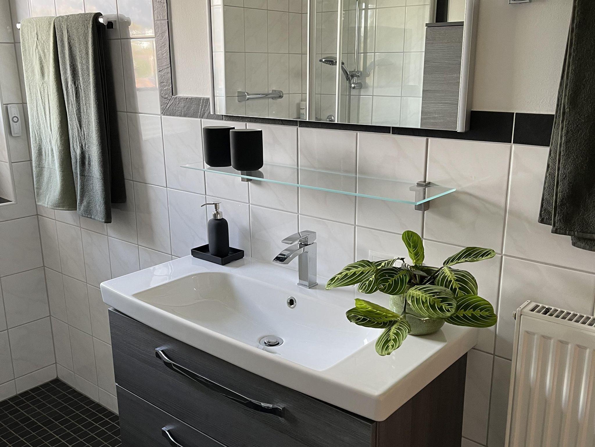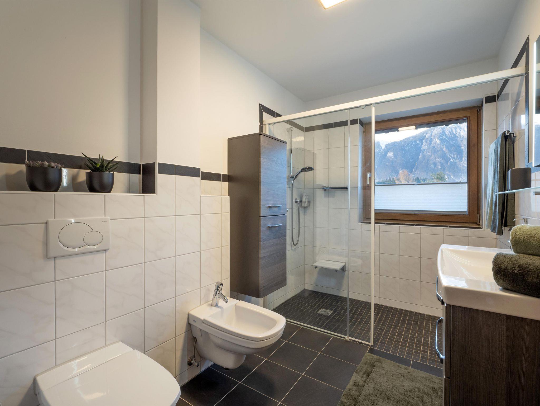 Das Badezimmer verfügt über einen großen Duschbereich, WC, Bidet, Föhn und genügend Stauraum.