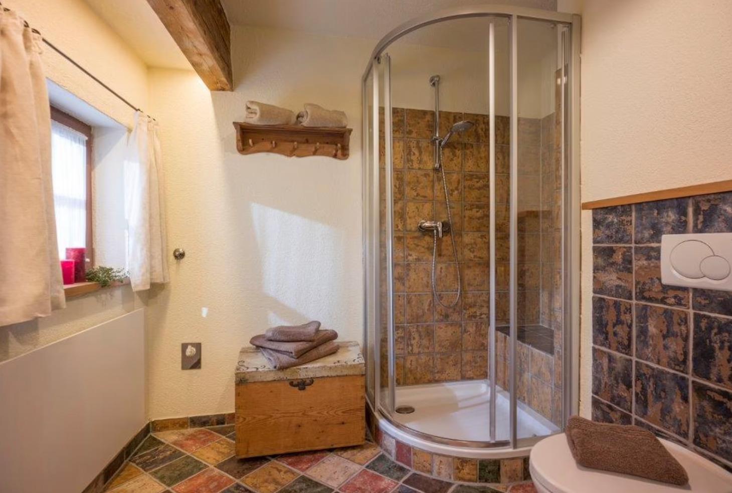 1 Badezimmer mit Dusche, Haarföhn und WC