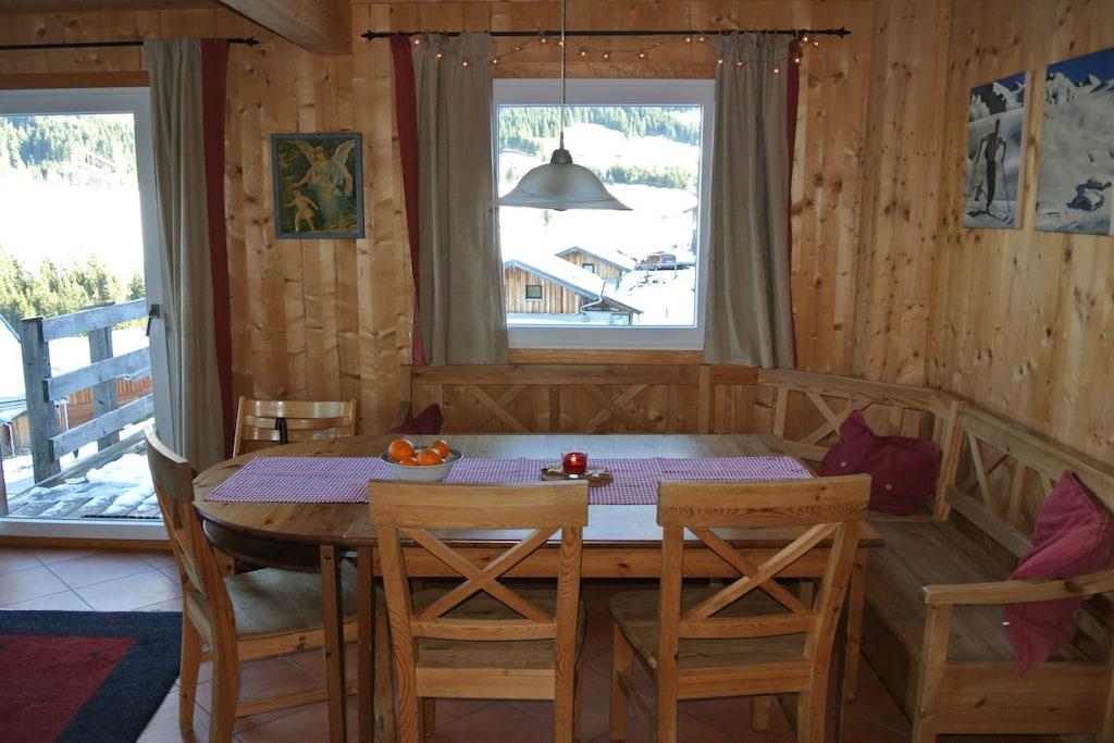 Dette charmerende feriehus, udført i ubehandlet, lyst naturtræ, tilbyder en særlig afslappende og hyggelig hytteatmosfære med sin brændeovn og komfortable siddepladser. Terrasse med grill, gynge, rutsjebane og sandkasse. Fælles indendørs pool, sauna, wellness-område og restaurant. Adgang til husets trappe er mulig selv om vinteren. Huset ligger i en højde af 1000 meter i den alpine ferieby Dachstein-West (et UNESCO-verdensarvssted), et paradis for skiløb, mountainbiking, trekking og vandreture. Indrammet af Dachstein-massivet med Gosaukamm, Bischofsmütze ("Salzburg Dolomitterne") og Tennengebirge-bjergene, ligger det i hjertet af skiområdet med 70 lifter, 160 km fantastiske pister, 14 "fun pister" og freeride-sne og funparker; 215 km langrendsløjper, nogle med projektørlys. Huset ligger cirka 80 meter fra skipisten.
