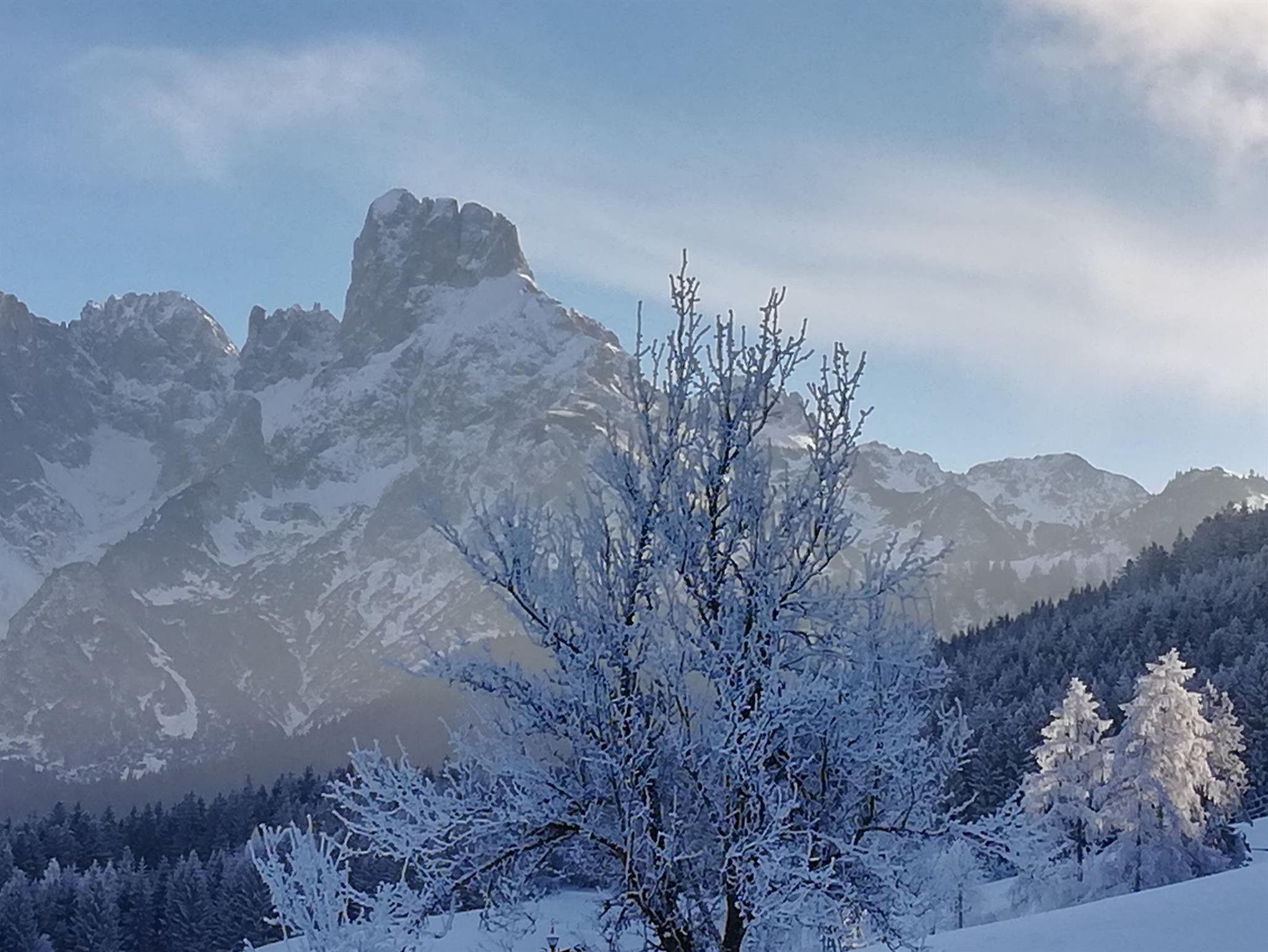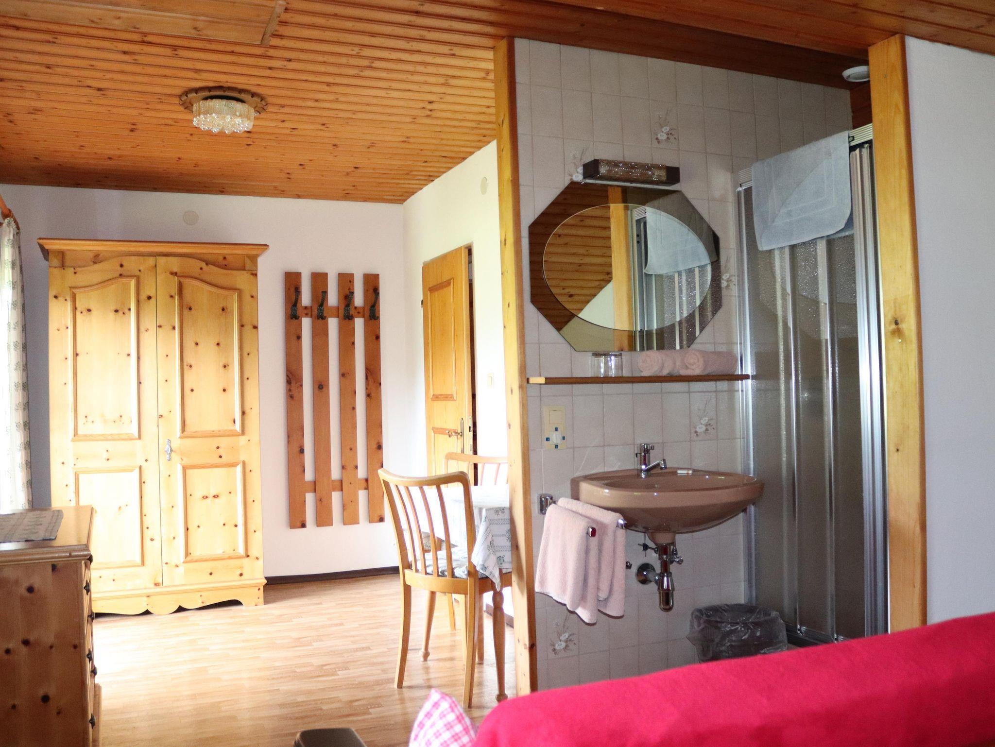 Gemütliches Doppelzimmer im zweiten Stock zur Ostseite mit Blick auf Gosaukamm mit Bischofsmütze. Ausstattung: Waschbecken, Dusche und Schlafbereich in einem Zimmer Etagen-WC Balkon Couch