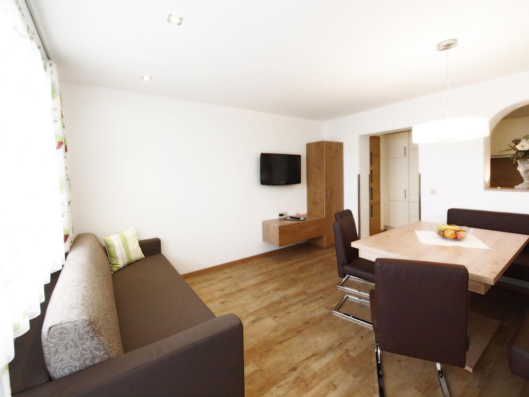 Wohnraum mit Esstisch und gemütlicher Sitzecke, kuschelige Ausziehcouch mit Matratze für 2 Personen sowie SAT-TV mit Radioanlage.