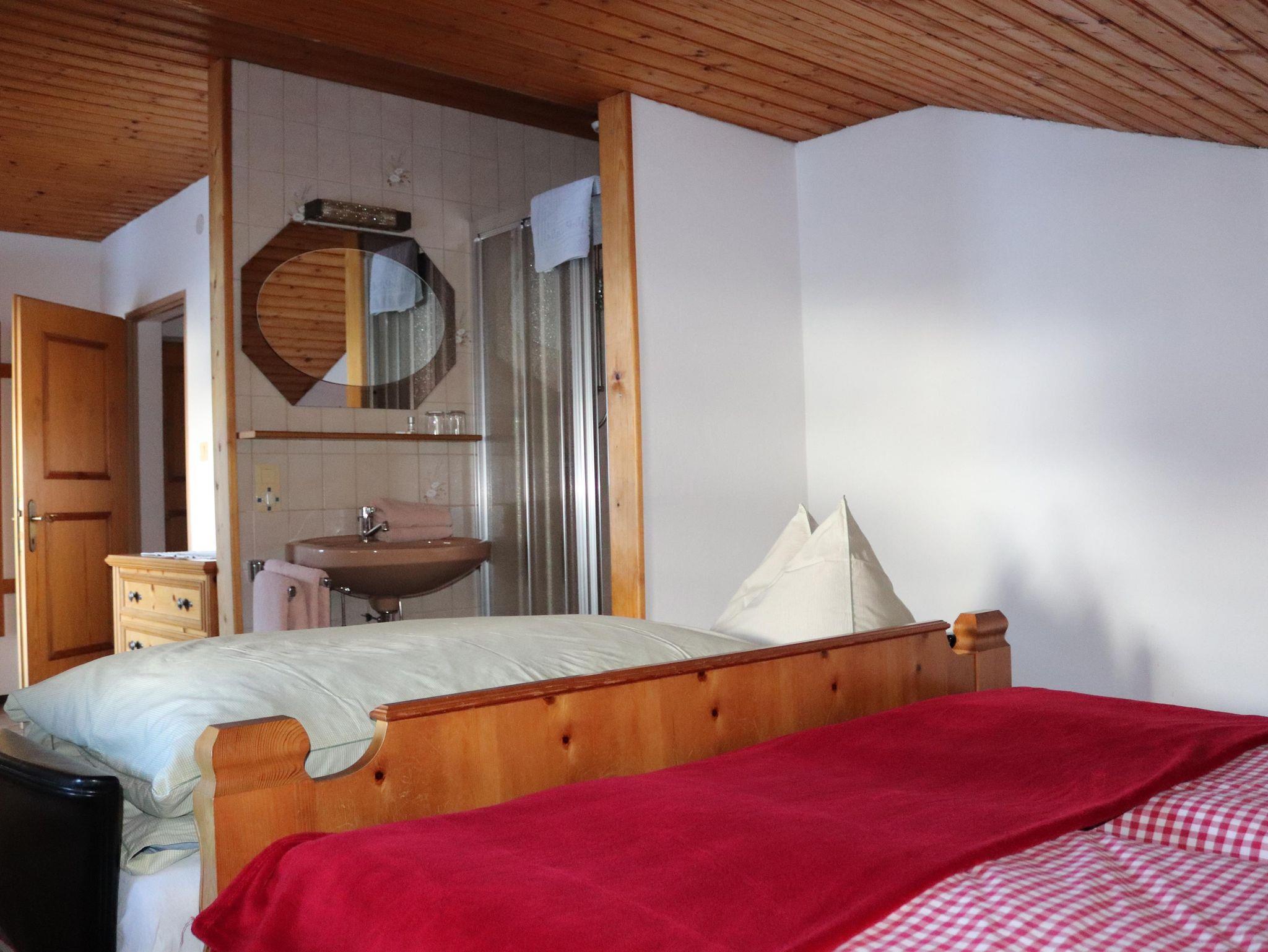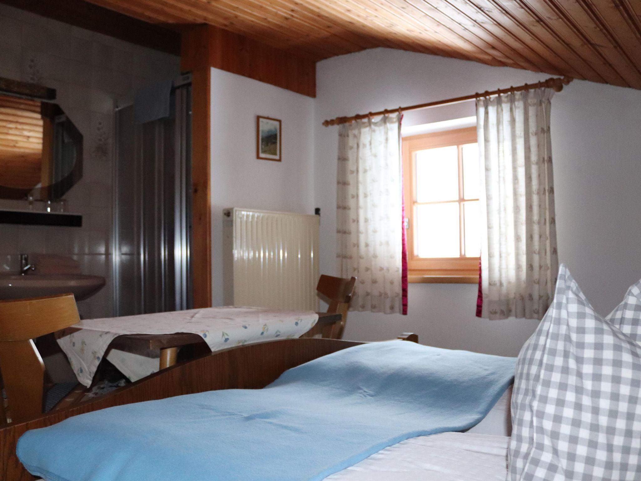 Gemütliches Doppelzimmer im zweiten Stock zur Ostseite mit Blick auf Donnerkogel. Ausstattung: Waschbecken, Dusche und Schlafbereich in einem Zimmer Etagen-WC