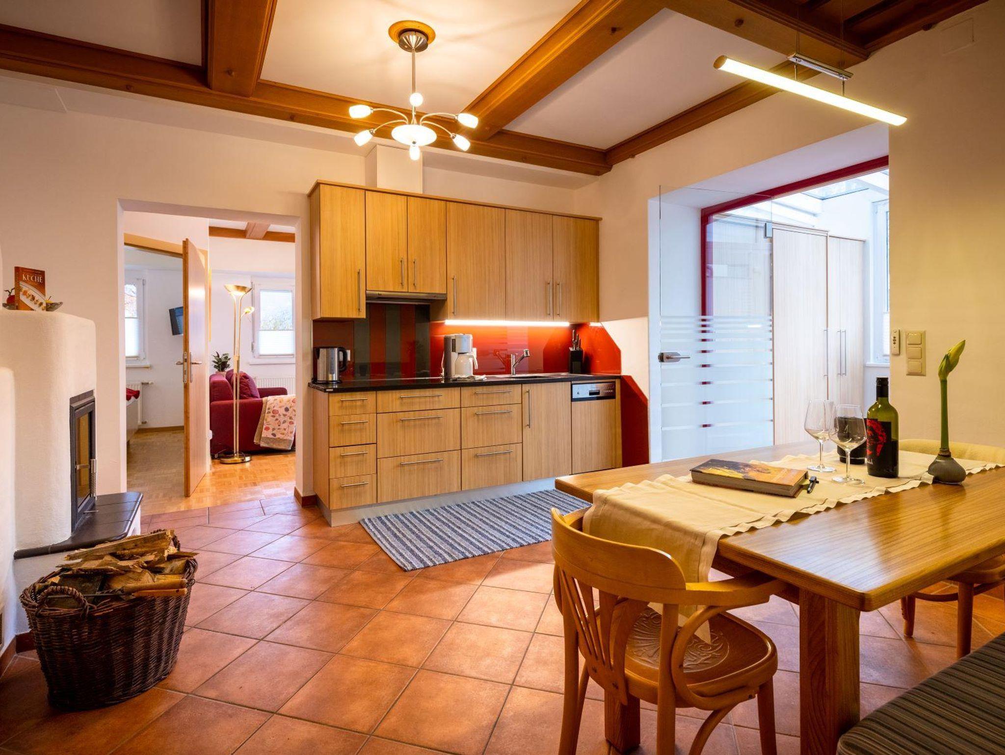 Neben der vollausgestatteten Wohnküche mit Kachelofen, dem Bad mit WC und Dusche, stellt der großzügige Wintergarten das Highlight des Apartments dar. Er lädt zum gemeinsamen Essen und Verweilen ein.