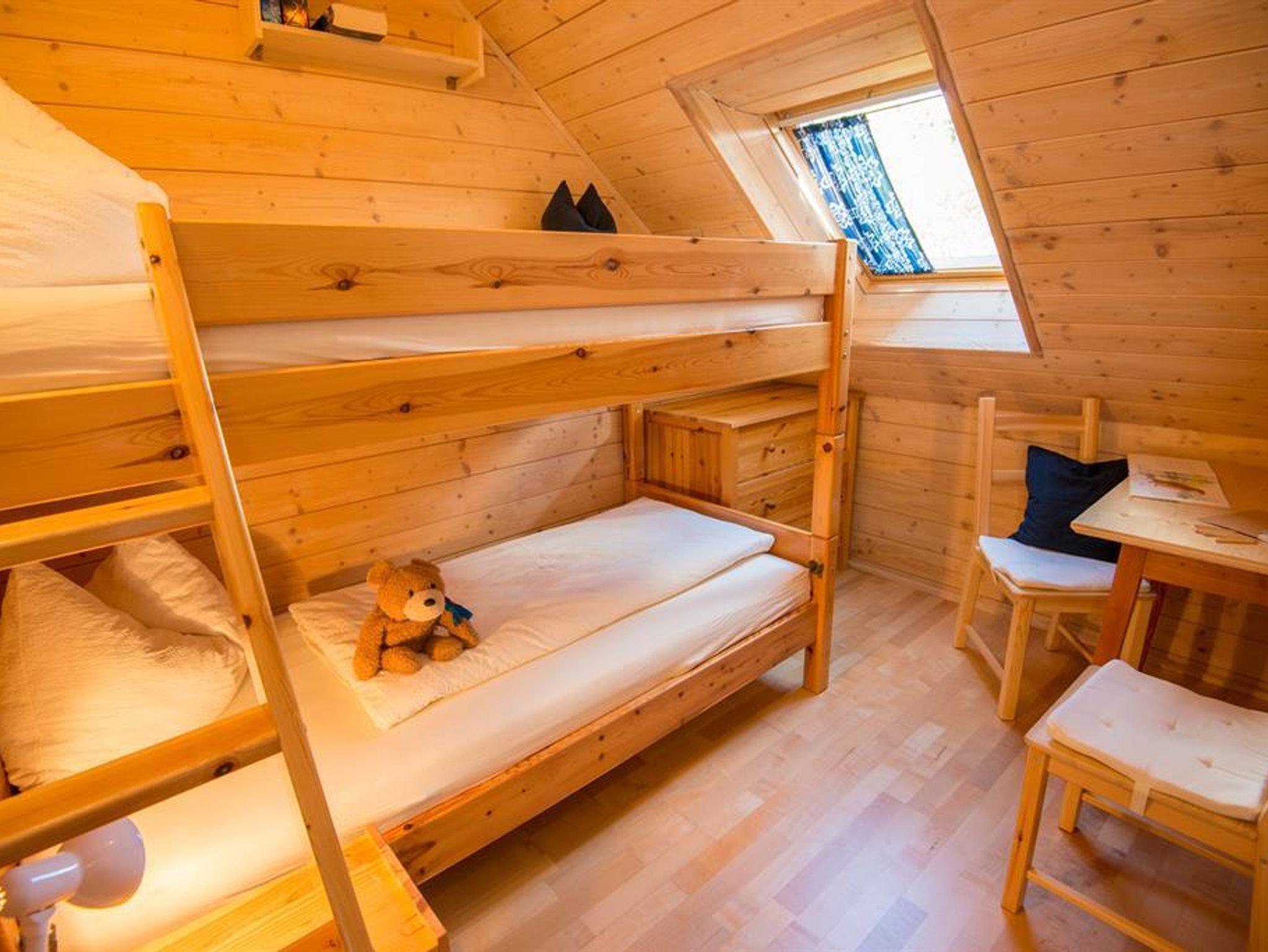 Großes Familienzimmer mit Doppelbett und Schlafsofa. Kleines Kinderzimmer mit Stockbett. Dazwischen die Küche: Herd mit Backrohr, Kühlschrank, Kaffeemaschine, Wasserkocher, Geschirrspüler.