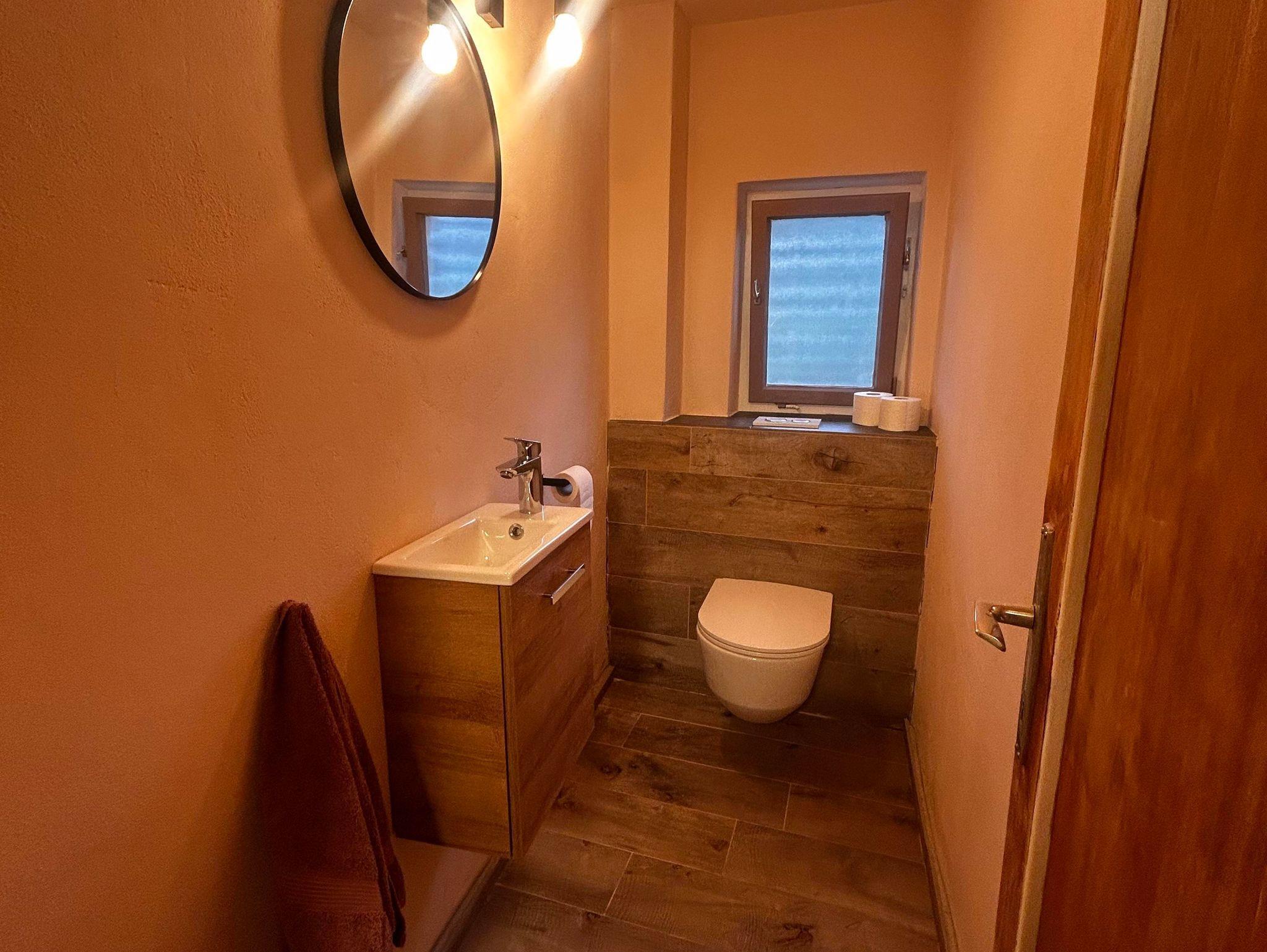Im Erdgeschoss befindet sich ein Duschbereich mit drei Kabinen und zwei Waschbecken. Zwei Toiletten liegen im Untergeschoss (in einem separaten Raum neben der Wohnküche), eine weitere im Obergeschoss. Für längere Aufenthalte gibt es auf Anfrage eine Waschmaschine mit Trocknerfunktion.
