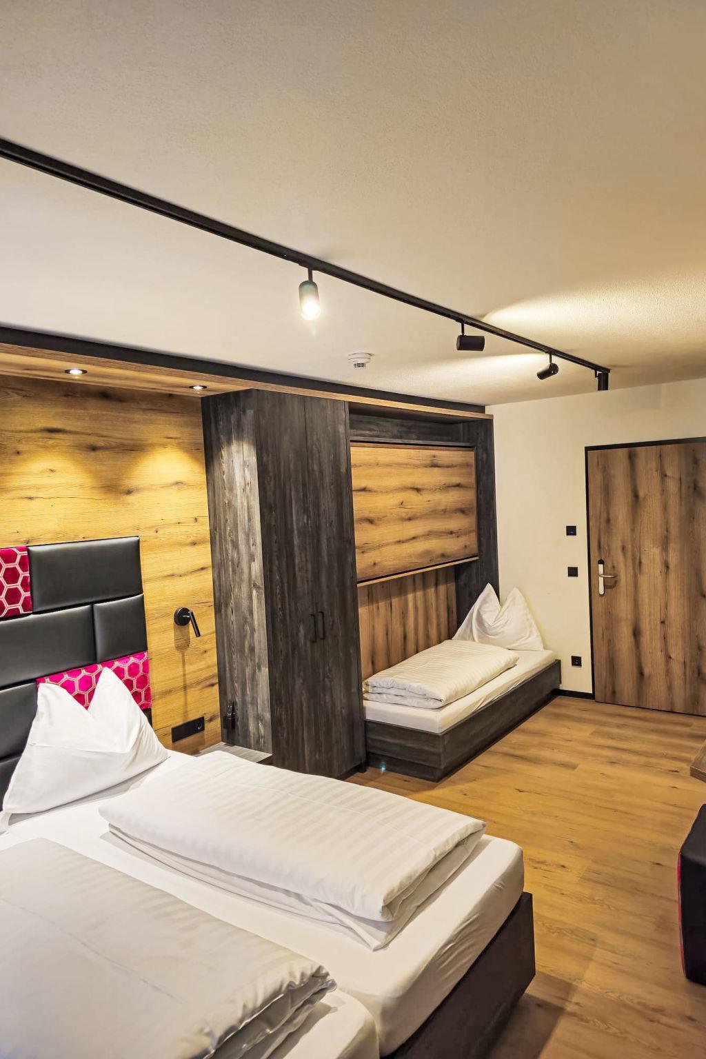 "Rocking home", 10-room chalet 350 m2 on 5 levels. Luxurious and tasteful furnishings: entrance hall. 2 double bedrooms. 2 rooms, each room with 1 double sofabed, 1 double bed and shower/WC. Shower/WC. On the lower ground floor: shower, sep. WC, Sauna. Upper floor: entrance hall. 2 rooms, each room with 1 double sofabed, 1 double bed and shower/WC. 2 double bedrooms. Shower/WC. 2nd upper floor: large living/dining room with open-hearth fireplace, dining table and satellite TV (flat screen). Living/sleeping room. Open kitchen (oven, dishwasher, 4 ceramic glass hob hotplates, microwave, electric coffee machine). Underfloor heating. Parquet floors. Balcony, large terrace 42 m2. Terrace furniture, barbecue, deck chairs. Very beautiful view of the countryside. Facilities: washing machine, dryer, hair dryer. Please note: non-smokers only. Maximum 1 pet/ dog allowed. The luxurious chalet has its own wellness area with hydro massage bath and relaxation room.