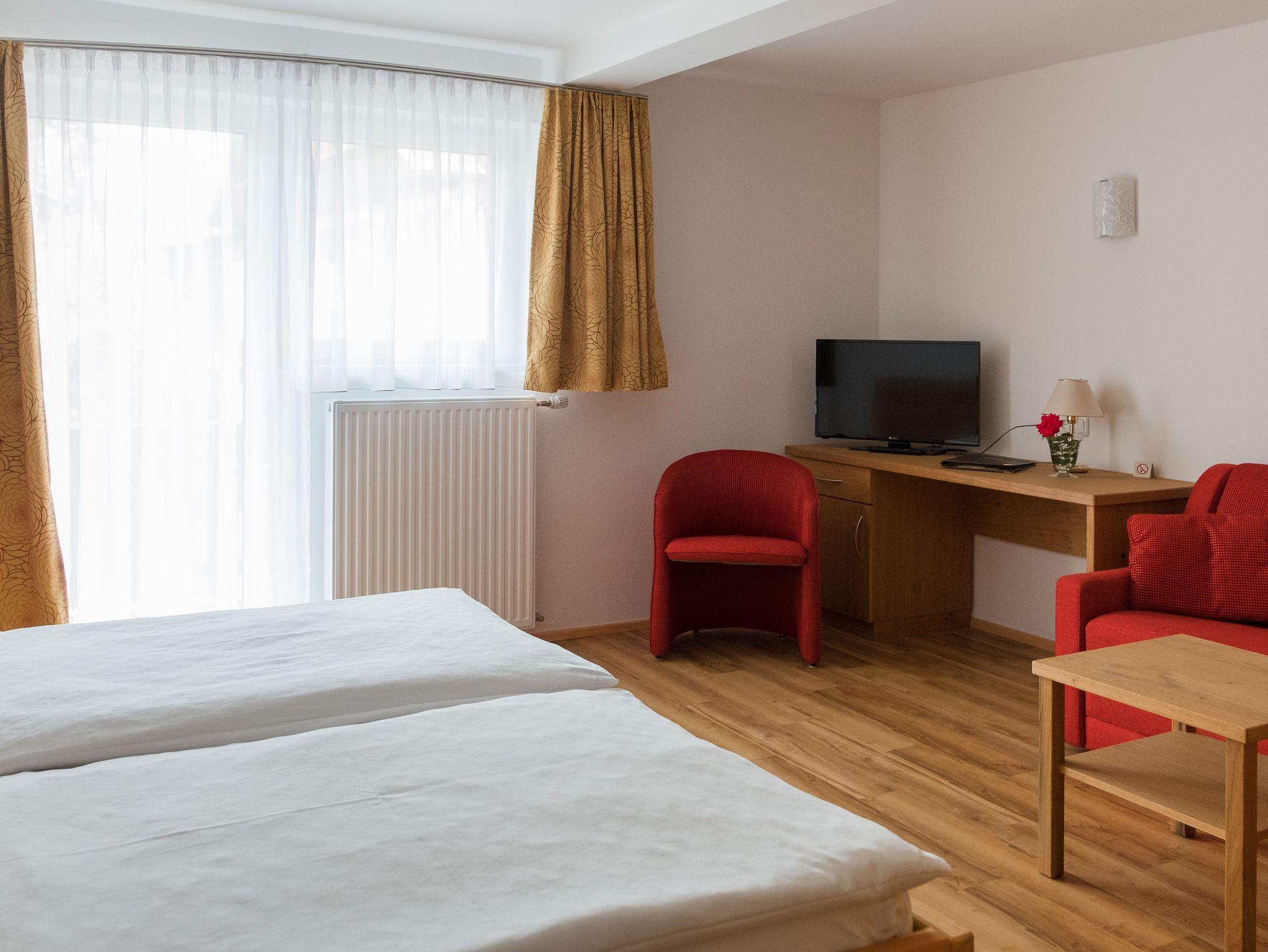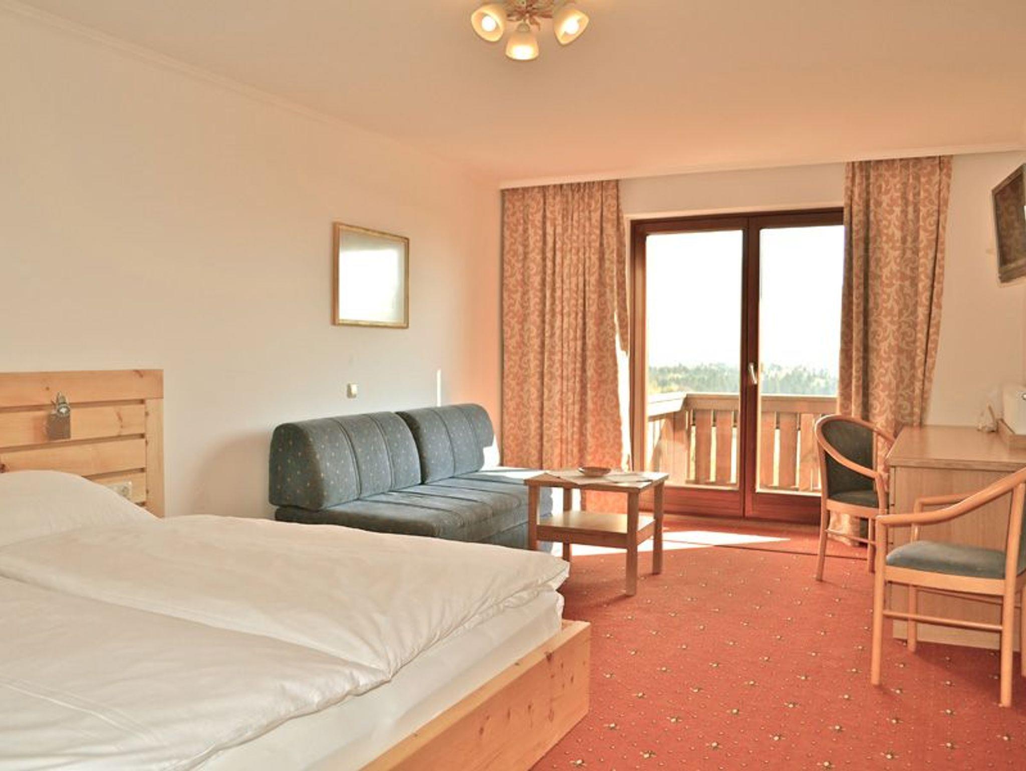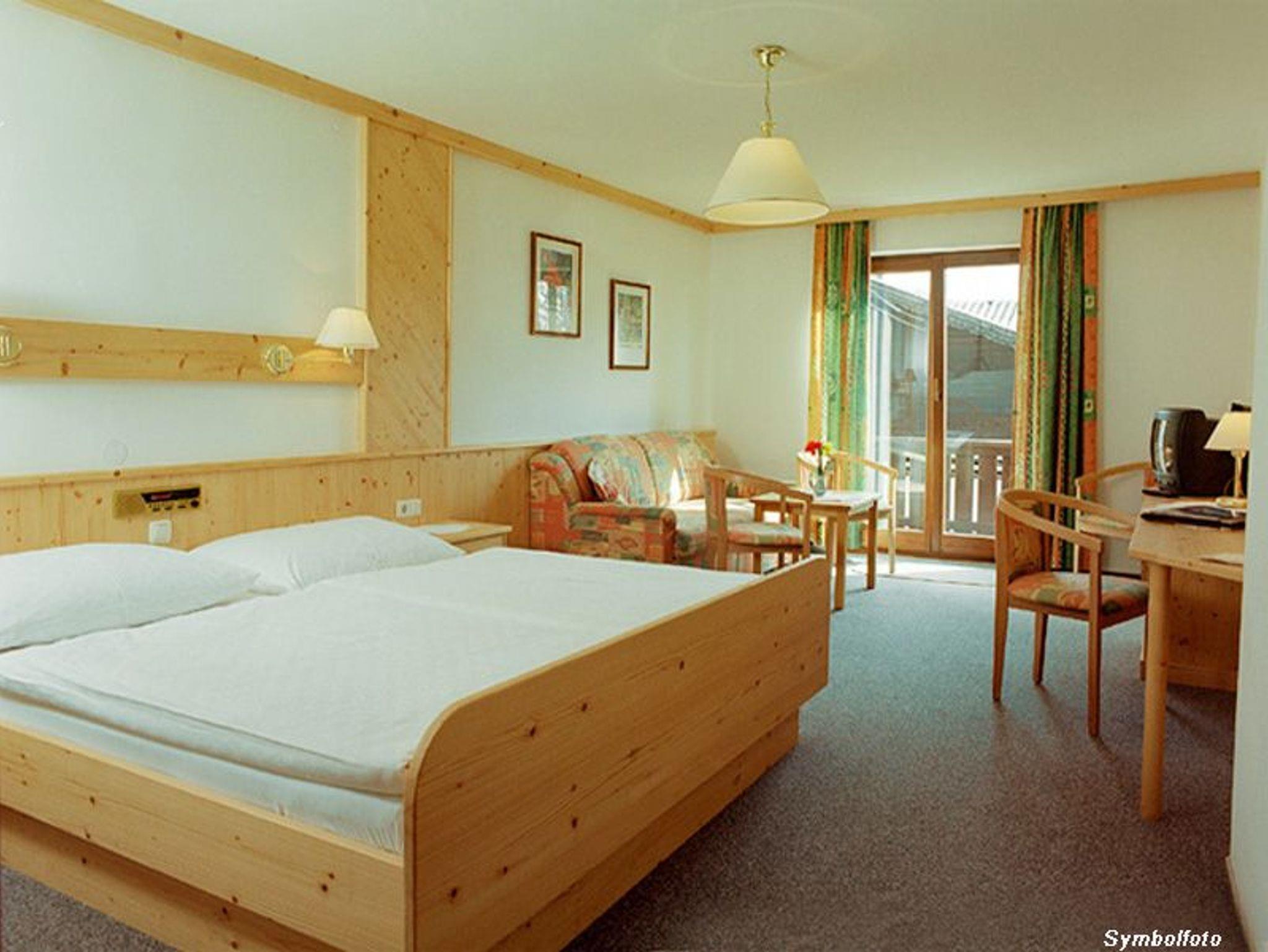Hell eingerichtetes Doppelzimmer mit Zirbenmöbel, kein Teppichboden, mit Dusche/WC, TV, WLAN, Safe und Haarföh, Balkon, straßenseitig gelegen mit Nachmittagssonne. Dieser Zimmertyp verfügt über eine ausziehbare Couch für Kinder - nur auf Anfrage möglich.