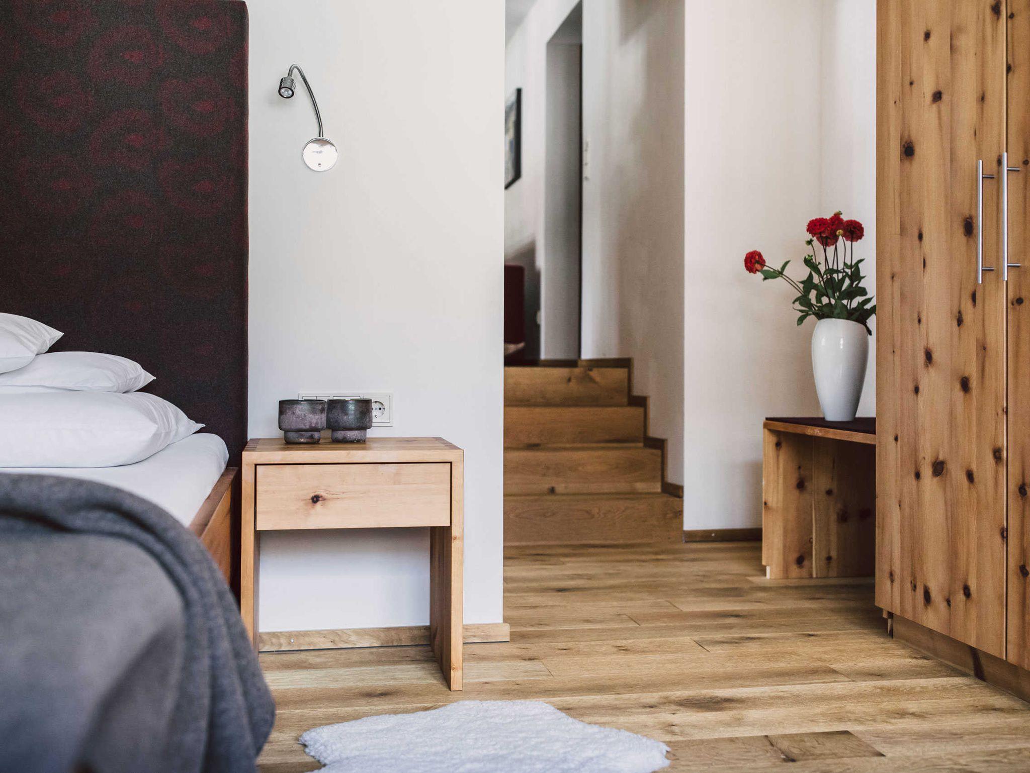 Freuen Sie sich auf exklusive, liebevoll eingerichteten Doppelzimmer mit Südbalkon oder unsere Apartments , alle mit Balkon, mit Liebe zum Detail und zur Natur eingerichtet, die Möbel aus Zirbenholz, feinen Loden- und Filzstoffen gefertigt ... und mit modern eingerichteten Küchen, falls Sie auch im Urlaub Ihrer Koch-Leidenschaft nicht widerstehen können!