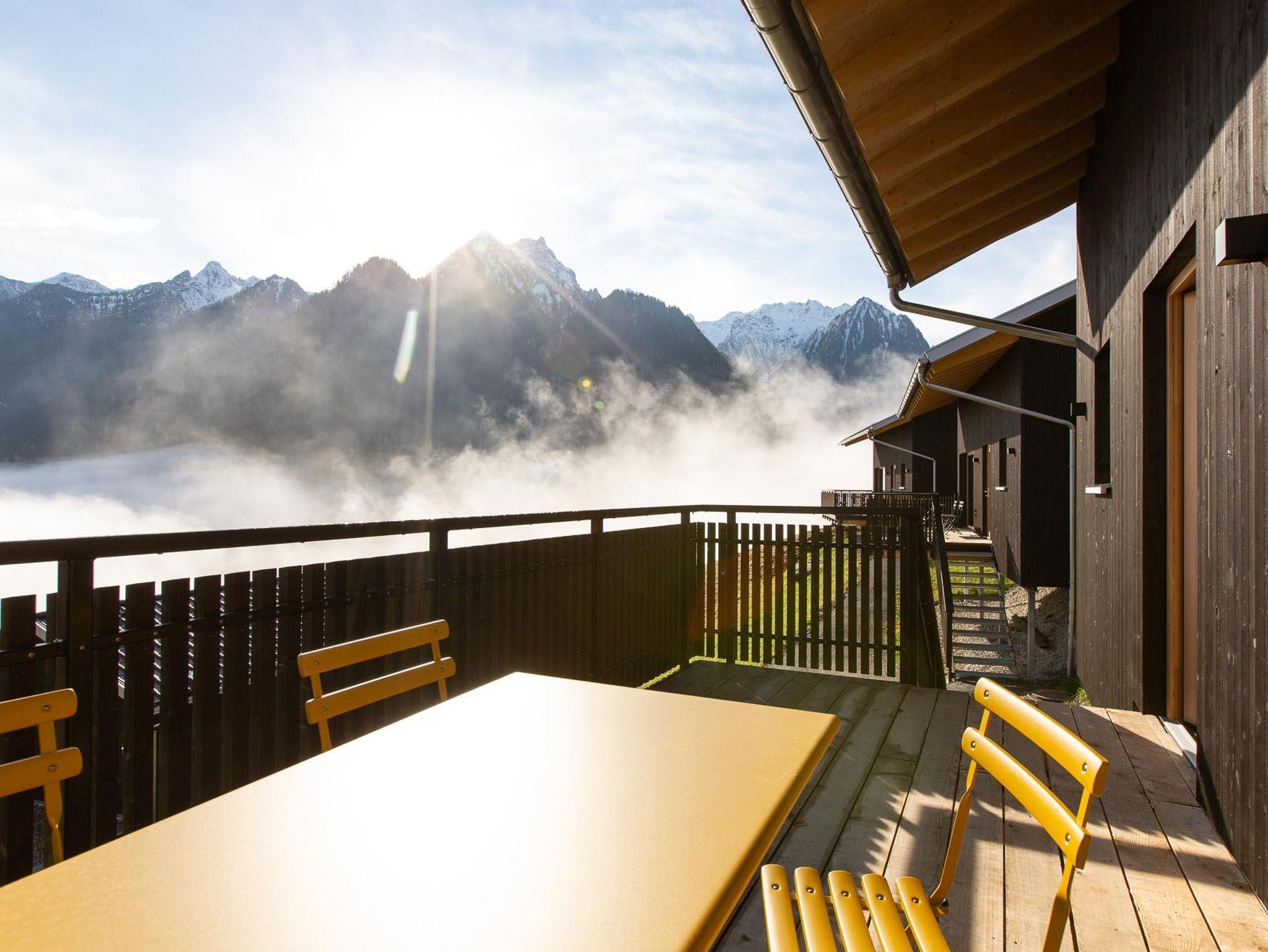 Cabin Valbona ist das Chalet mit Panoramafenster in Richtung Norden mit Blick auf den Wald und die Berge des Walgau. Ausblick von der Terrasse auf das Brandnertal und Weitblick bis ins Klostertal.