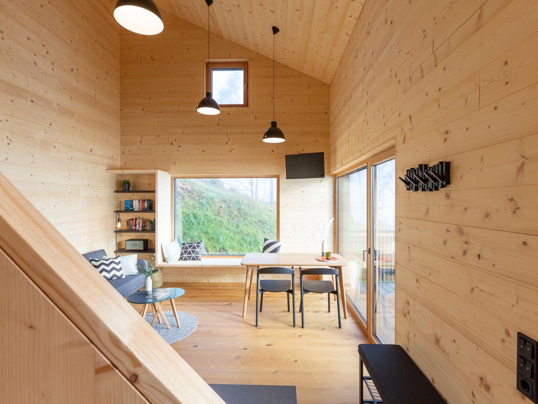Im Erdgeschoss befindet sich in dem modern ausgestatteten Wohnbereich eine Küchenzeile, ein Esstisch mit Stühlen, ein TV, sowie eine gemütliche Couch. Am Panoramafenster kannst du es dir auf der Sitzbank gemütlich machen.
