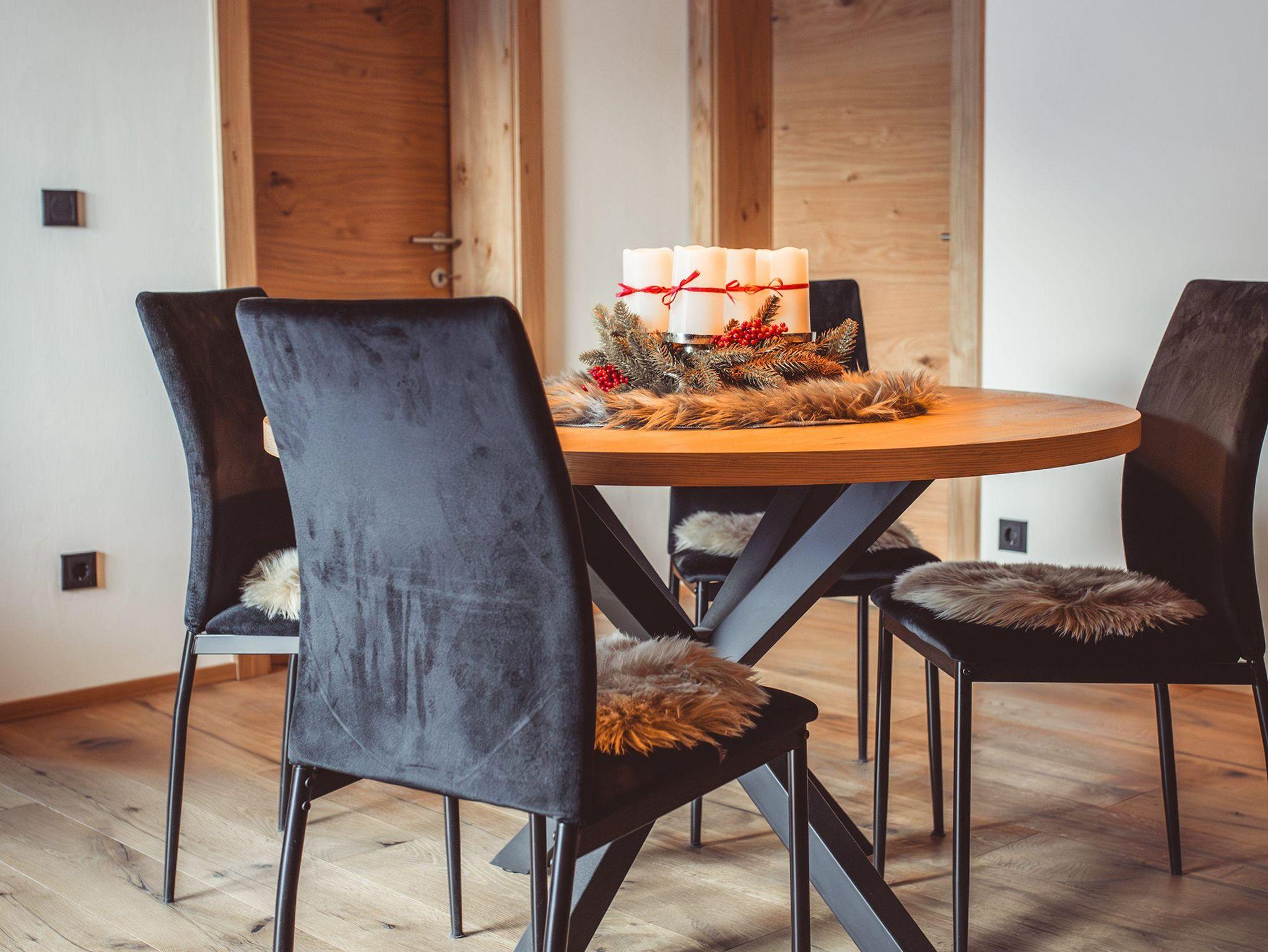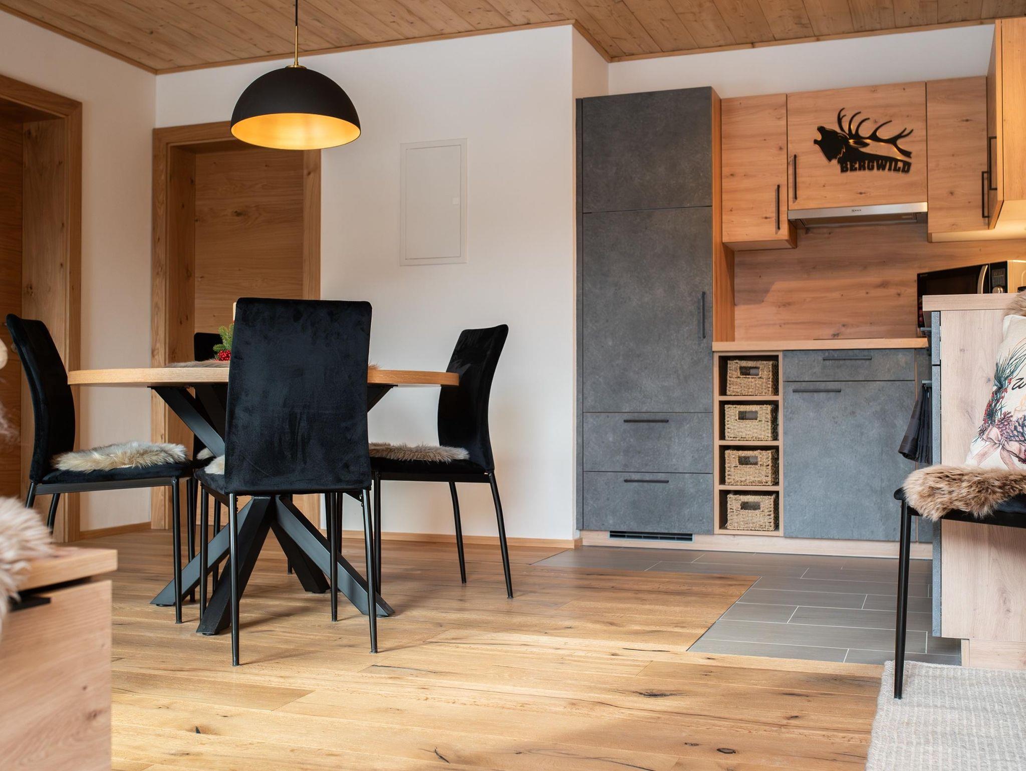 Der einladende Essbereich mit der anthrazitfarbenen Küche ist das behagliche Herz des gemütlichen Appartements Bergwild. Hier finden unter einem feinen hausgemachten Essen und bei einem guten Glas Wein schöne Gespräche statt, die Familie und Freunde einander näherbringen.