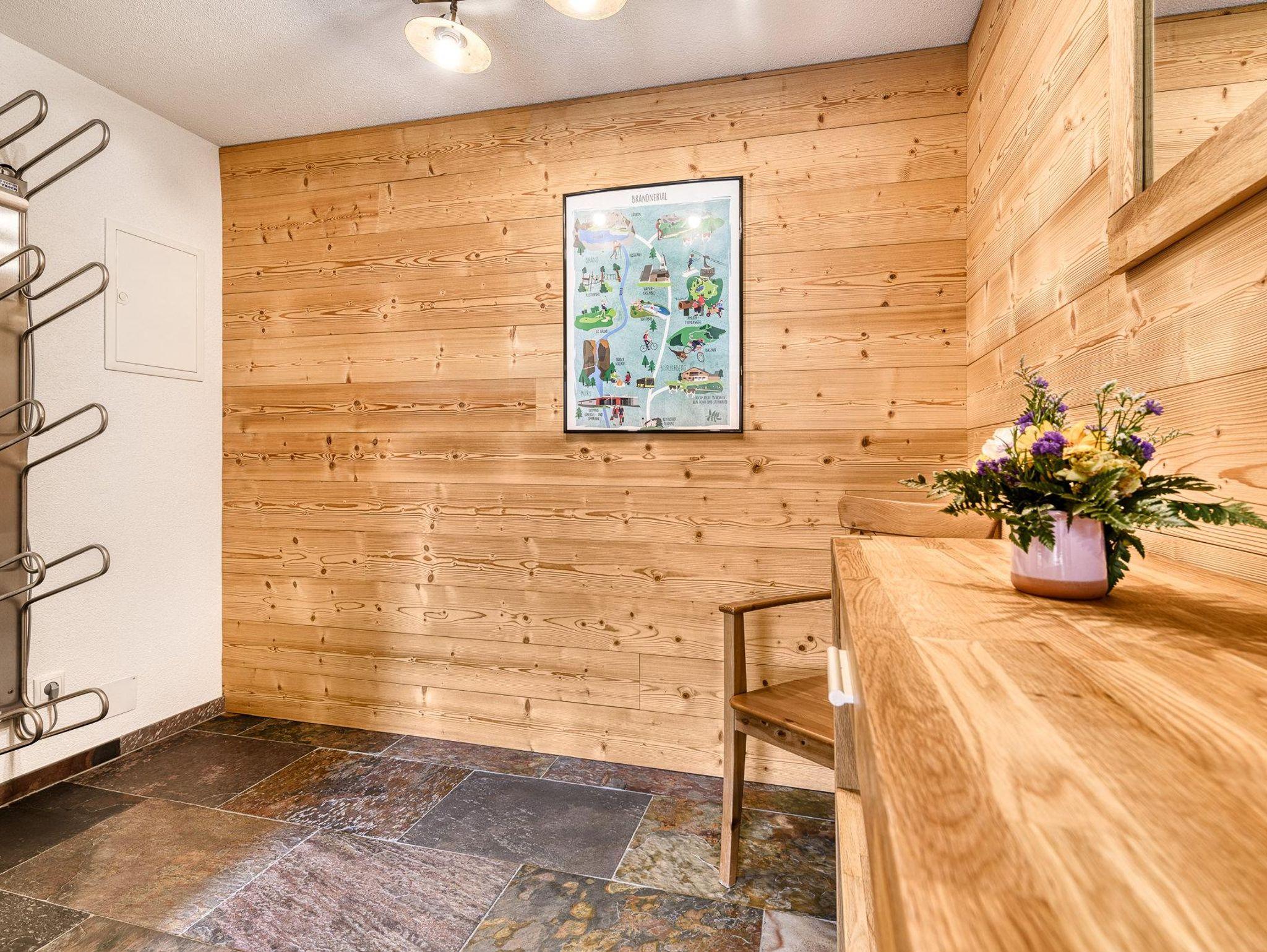 Das Appartement verfügt über einen praktischen Eingangsbereich mit Garderobe und Schuhablage sowie eine Ski-Ecke mit Skischuhwärmer. Der Wohnraum ist offen gestaltet mit einer voll ausgestatteten Küche, einem Essplatz für sechs Personen und einem gemütlichen Wohnzimmer, komplett mit TV-SAT und WLAN.