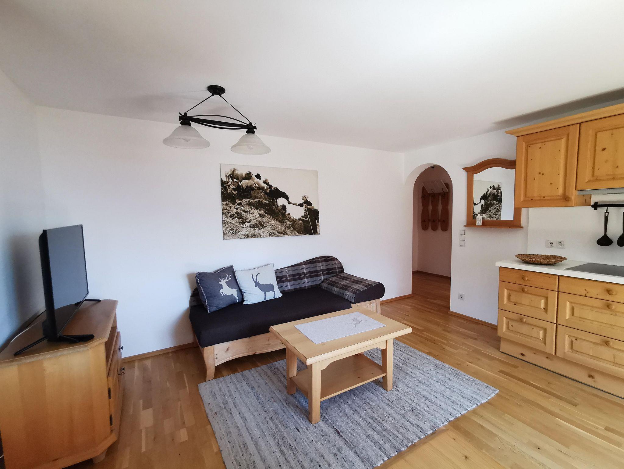 Das Appartement mit der berauschenden Aussicht sowohl auf die Berge als auch ins Tal, die Sie auf einem großen Balkon genießen können.
