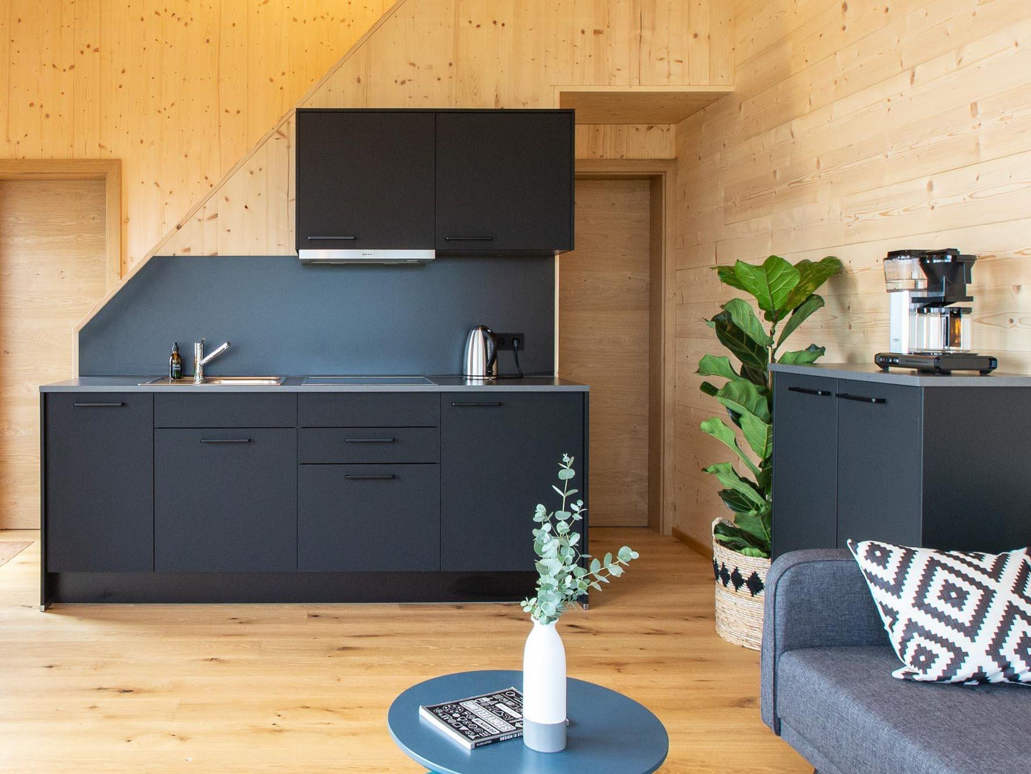 Im Erdgeschoss befindet sich in dem modern ausgestatteten Wohnbereich eine Küchenzeile, ein Esstisch mit Stühlen, ein TV, sowie eine gemütliche Couch. Am Panoramafenster kannst du es dir auf der Sitzbank gemütlich machen.
