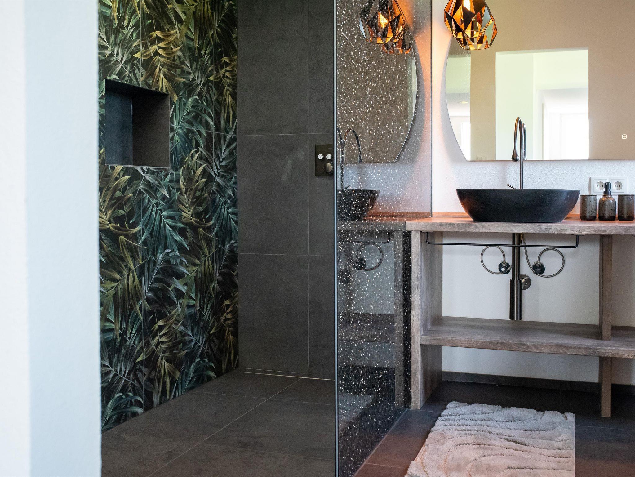 Großes offenes Badezimmer mit Dusche und Doppelwaschbecken. Separates WC.