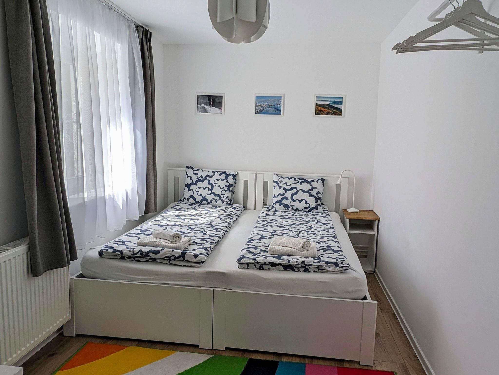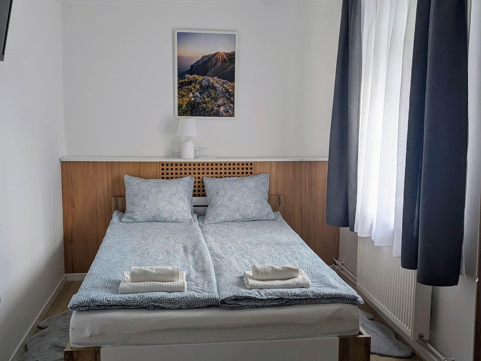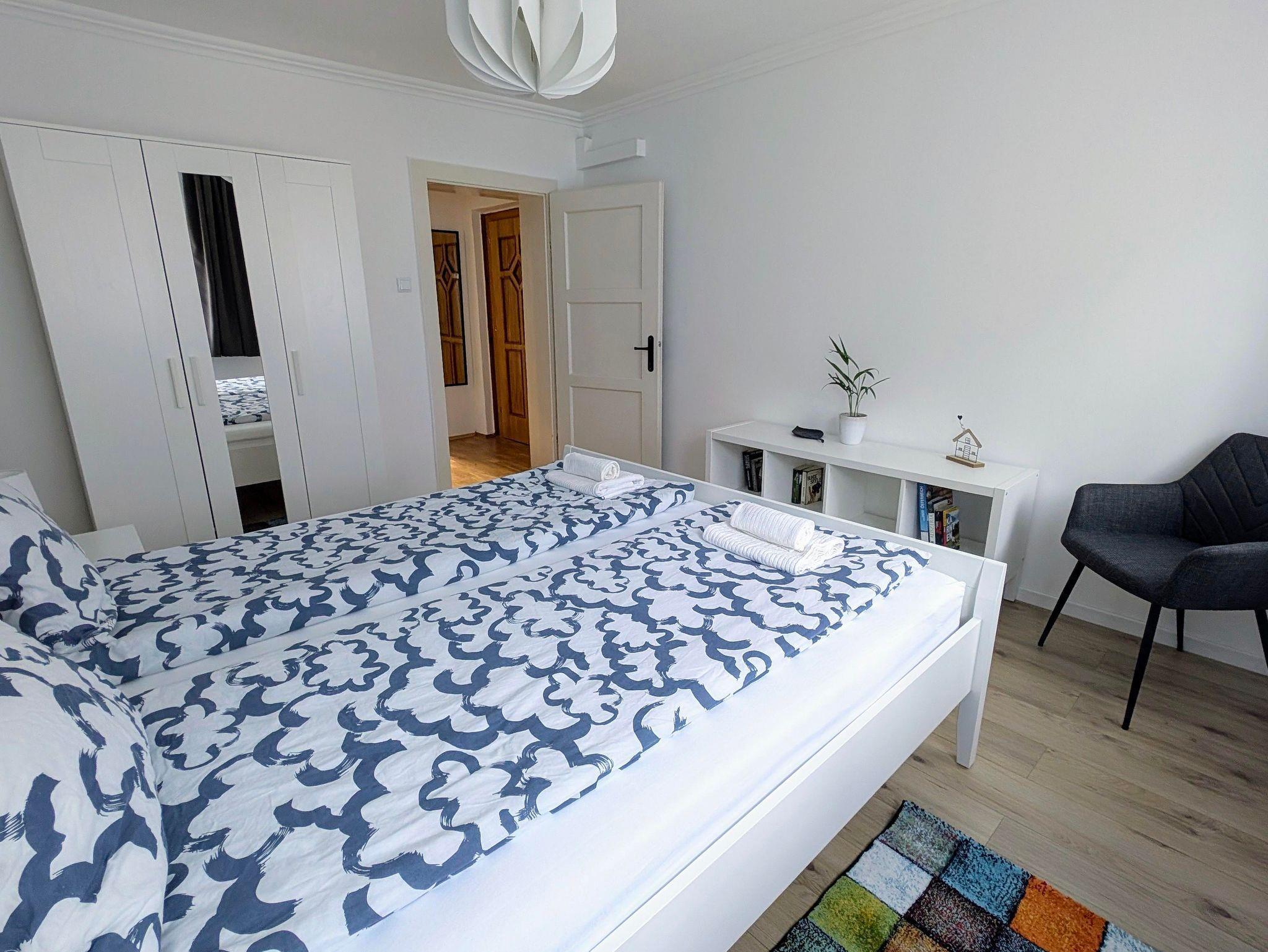 Das große Schlafzimmer hat ein Doppelbett von 180 cm, das kleine Schlafzimmer hat 2 Betten von 90 cm, die auf Wunsch zusammengeschoben werden können.