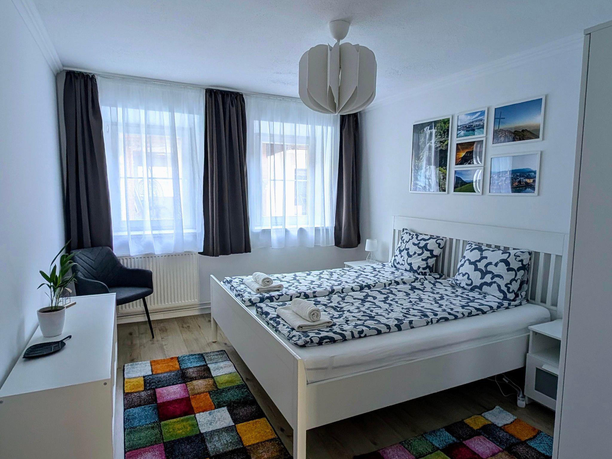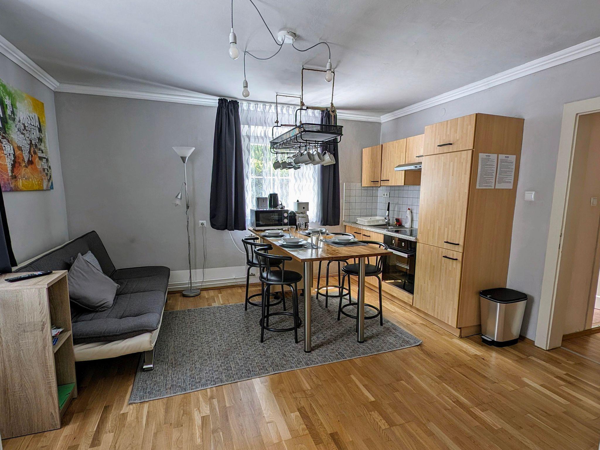 Die Wohnung verfügt über eine voll ausgestattete Küche mit Elektroherd, Backofen, Mikrowelle, Nespresso-Kaffeemaschine, Filterkaffeemaschine, Toaster, Wasserkocher und Kühlschrank, Bad mit Dusche und WC.
