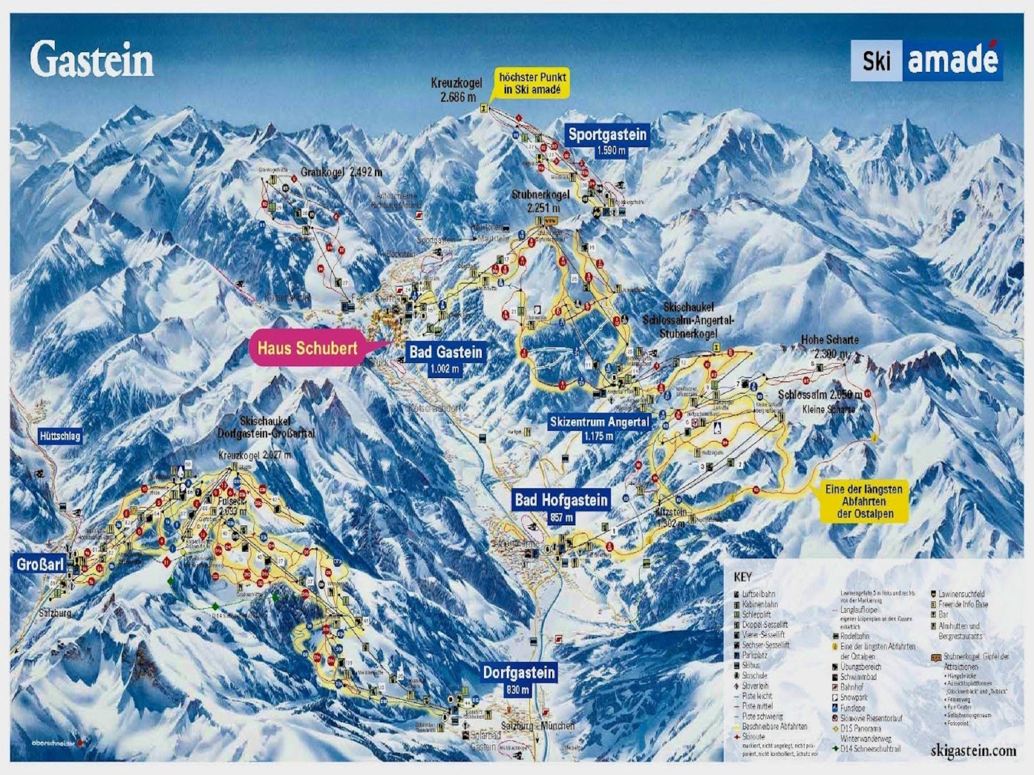Large apartment block "Schubert", 4 storeys. In the centre of Bad Gastein, 3.5 km from the lake, 900 m from the skiing area. In the house: lift, storage room for skis, central heating system, ski boot dryer. Public car park at 700 m. Grocery 100 m, restaurant, bakery, café 500 m, 5 minute walk to the centre, bus stop "Mozartplatz" 10 m, thermal baths "Felsentherme" 1 km, bathing lake 3.5 km. Golf course (18 hole) 2 km, gondola lift 900 m, skisport facilities, slopes. Nearby attractions: Gasteiner Heilstollen Radon 5 km. Well-known ski regions can easily be reached: Bad Gastein Stubnerkogel u.Graukogel, Sportgastein, Bad Hofgastein, Dorfgastein. Hiking paths: Nationalpark Hohe Tauern. Please note: lift to 3rd floor. Ski bus (free of charge). Additional accommodations can be booked.