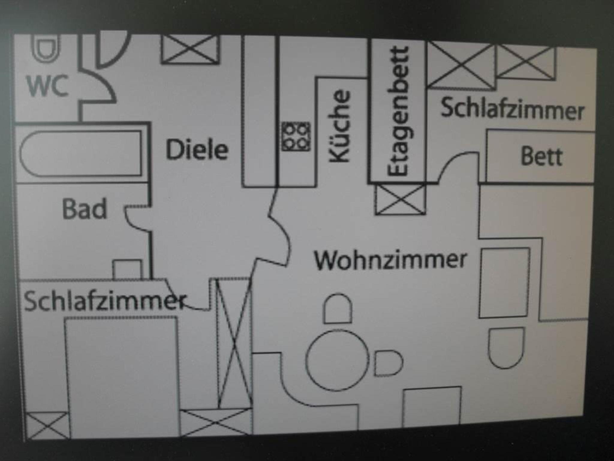 3 Zimmerwohnung (65qm)mit Diele, Dusche, WC, Küche (Spülmaschine), Eßecke, Schlafzimmer Doppelbett, Schlafzimmer Einzelbett und Stockbett, Wohnschlafraum und sonniger Balkon.