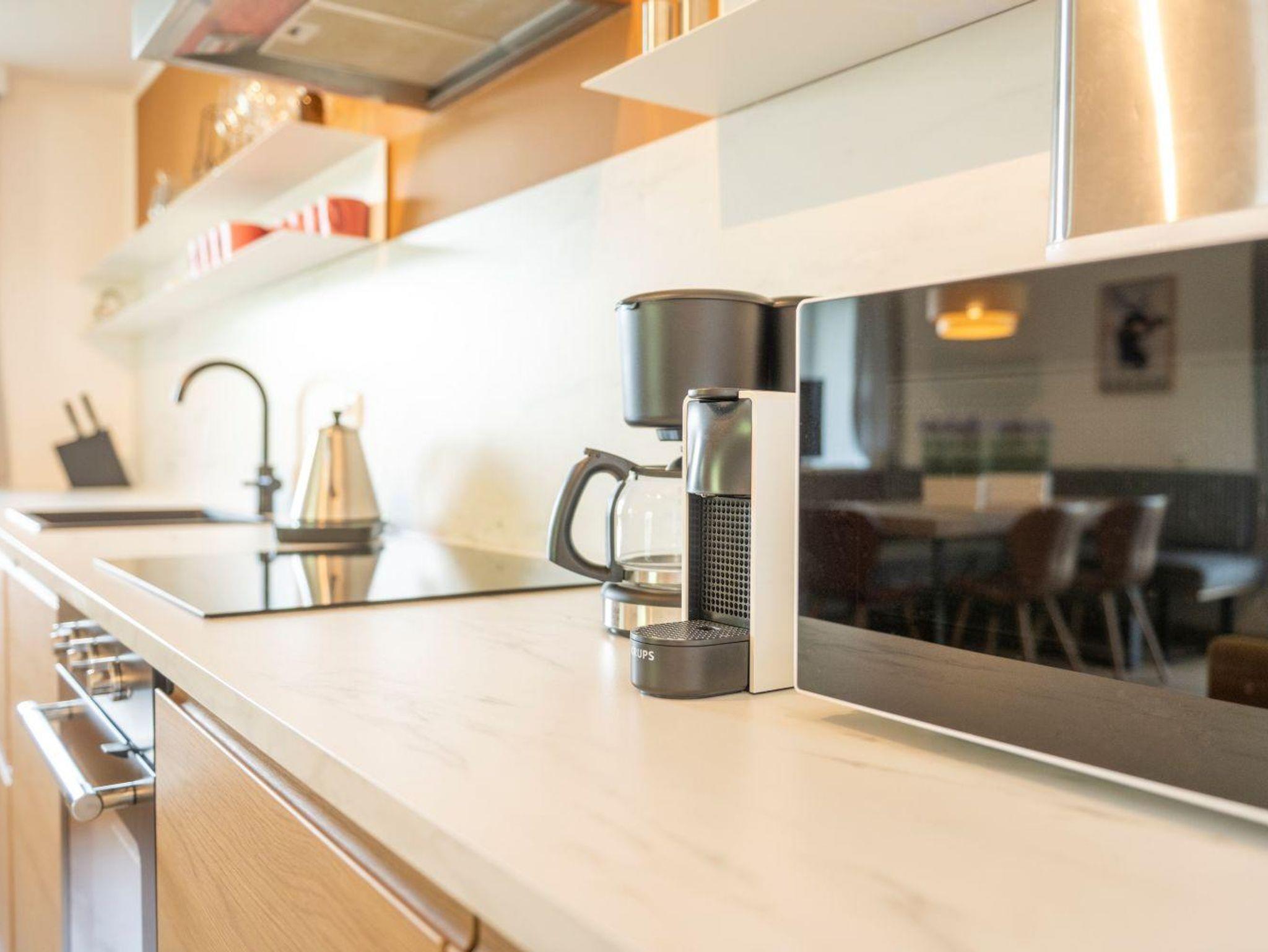 • voll ausgestattete Küche mit Kühlschrank (inkl. Gefrierfach), Herd, Backofen, Mikrowelle, Filter Cafemaschine, Geschirrspülmaschine
