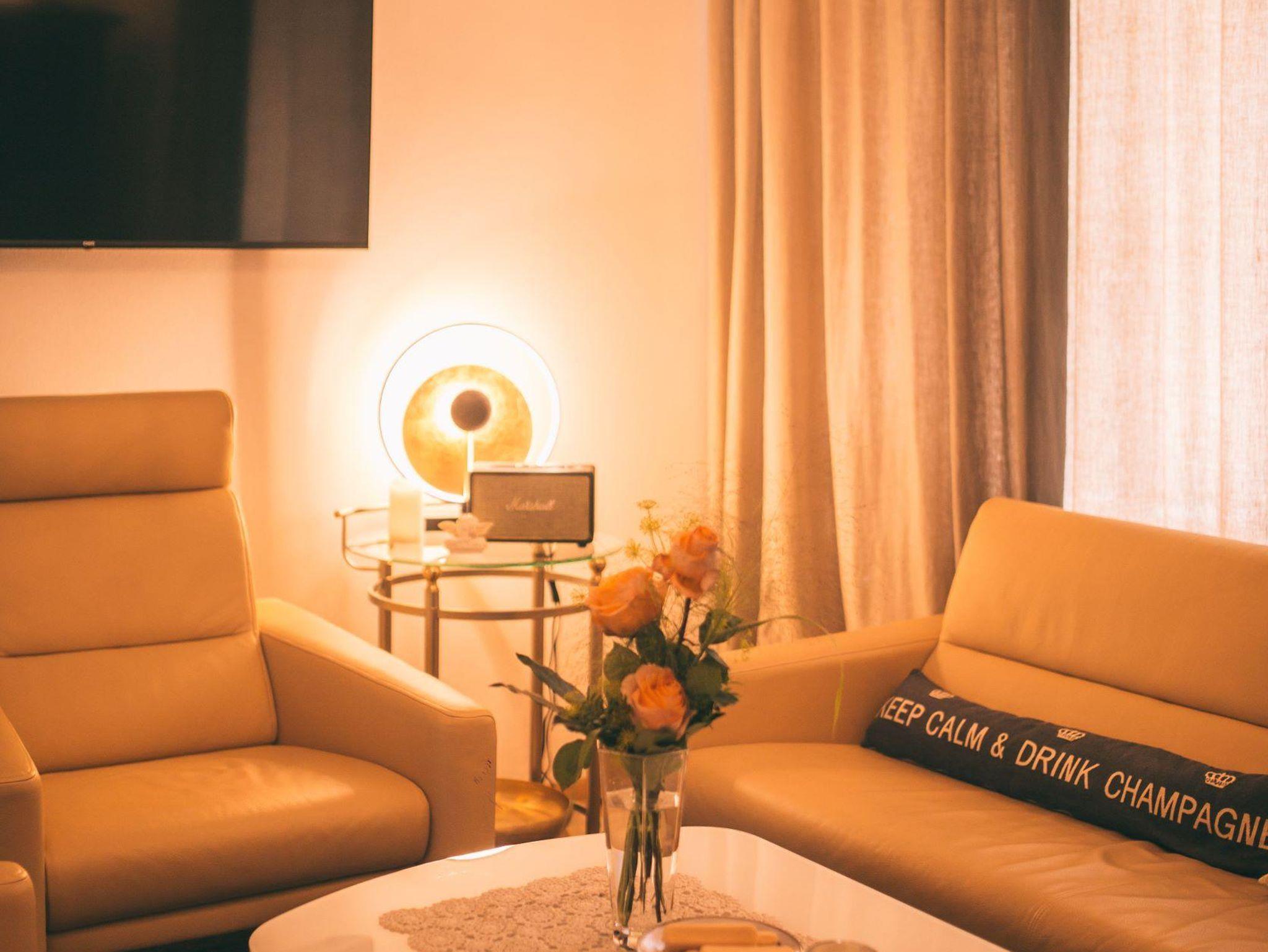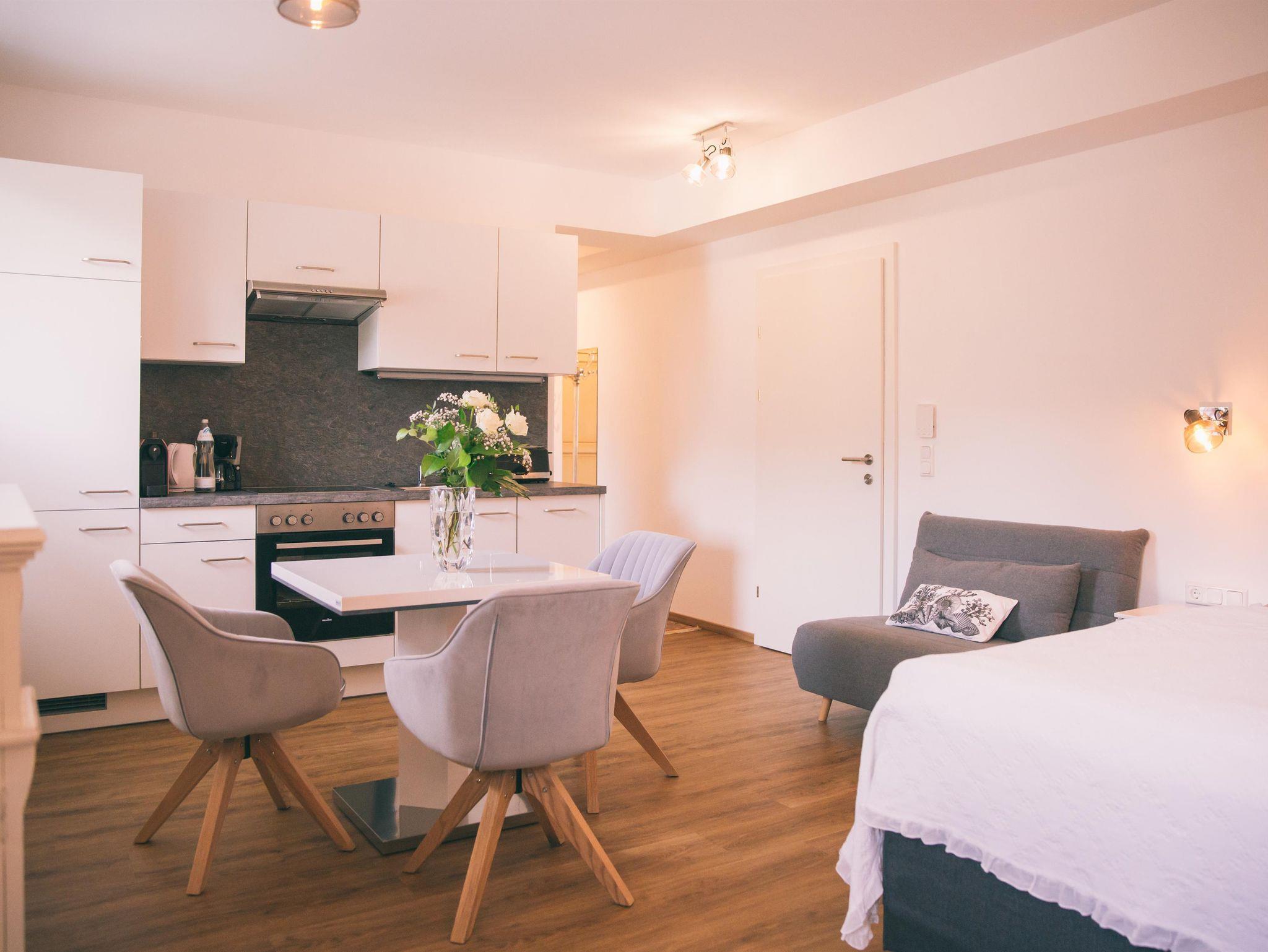 Unser 35qm Apartment (ab 112 €/Nacht und Apartment) ist hell und freundlich gestaltet. Es ist für maximal 3 Personen geeignet (Zustellbett). Es besitzt ein geräumiges Duschbad mit einer großen Dusche, WC und Waschtrockner. Die Gäste haben eine eigene Küche inkl. Backofen, Kühl- und Gefrierschrank, Ceran-Kochfeld und Kapsel-Kaffeemaschine.