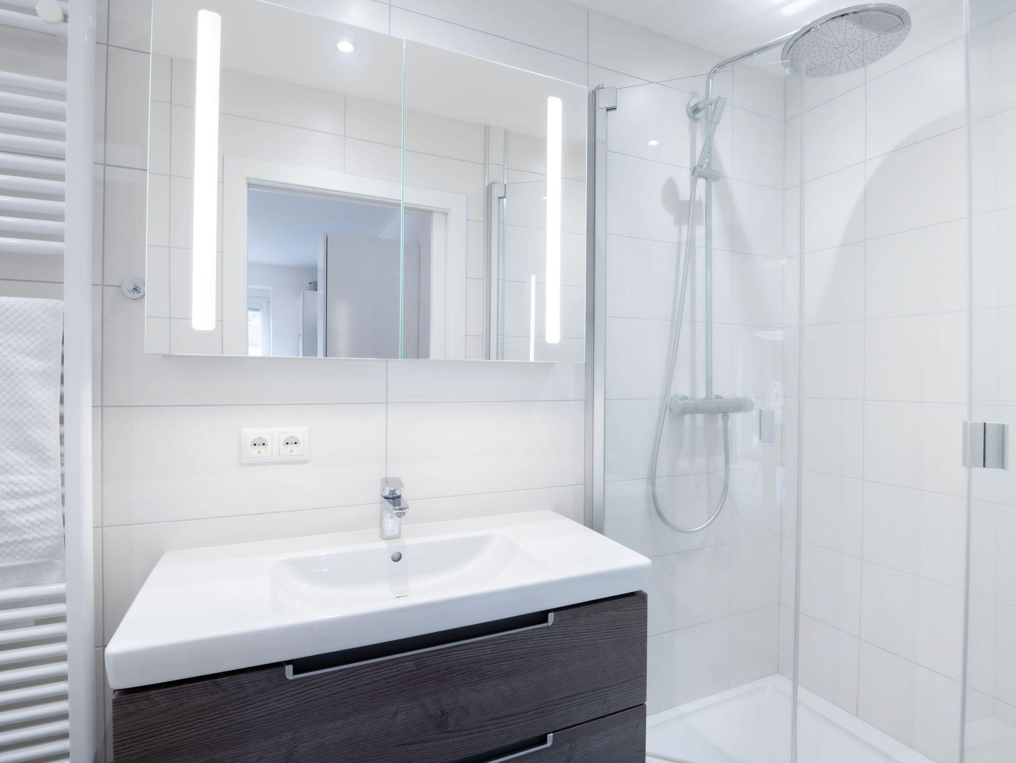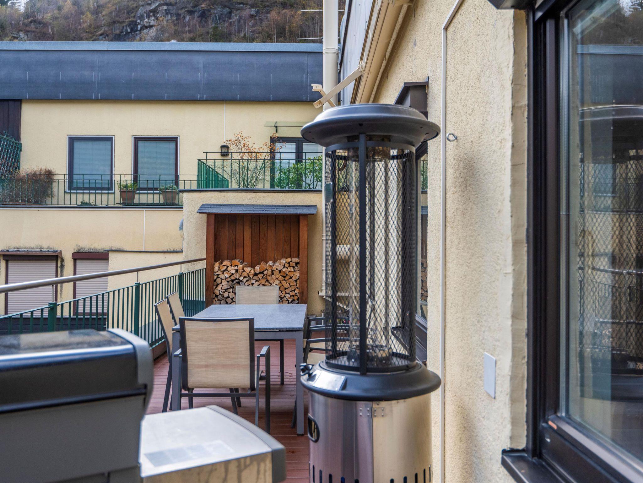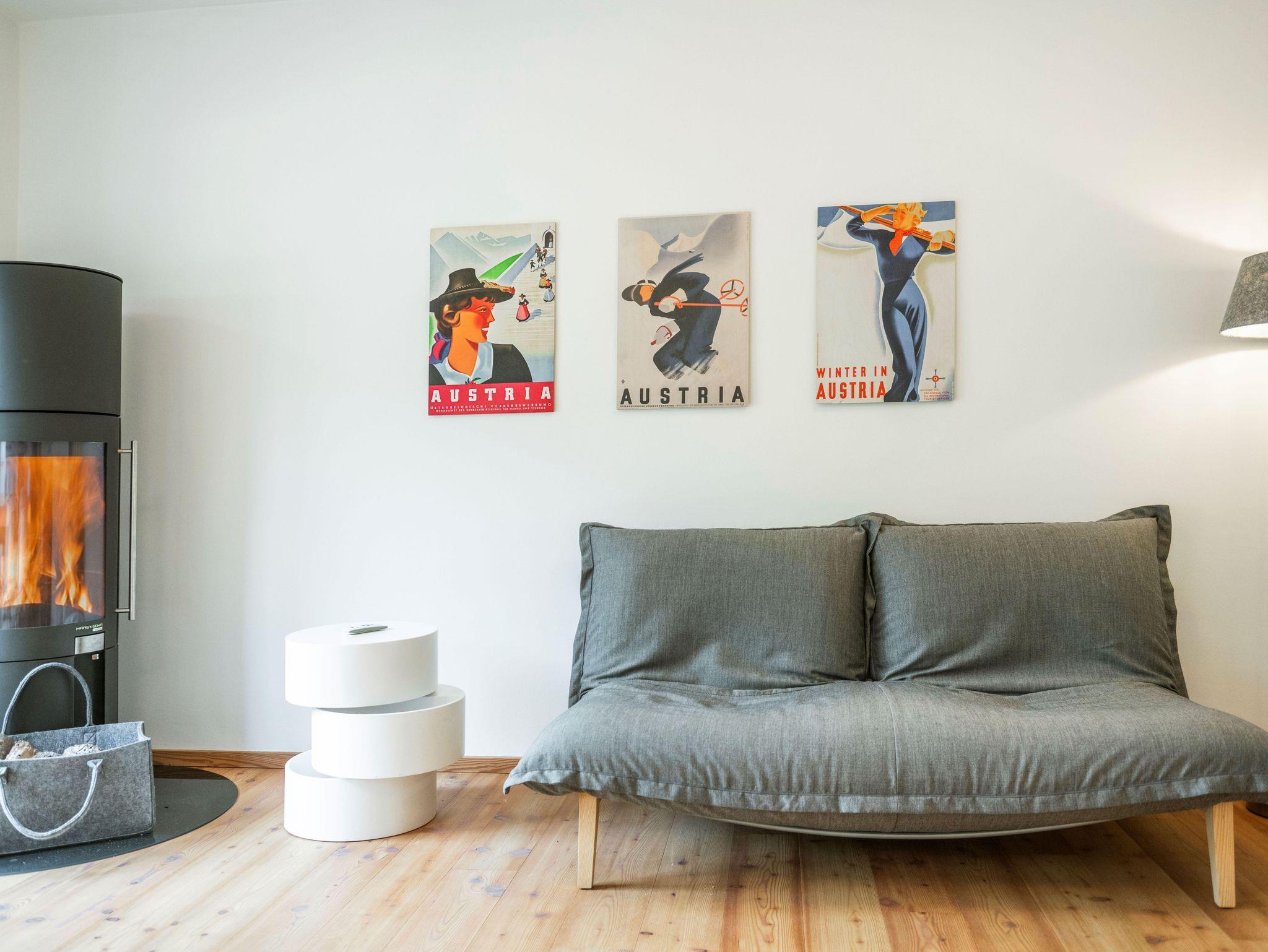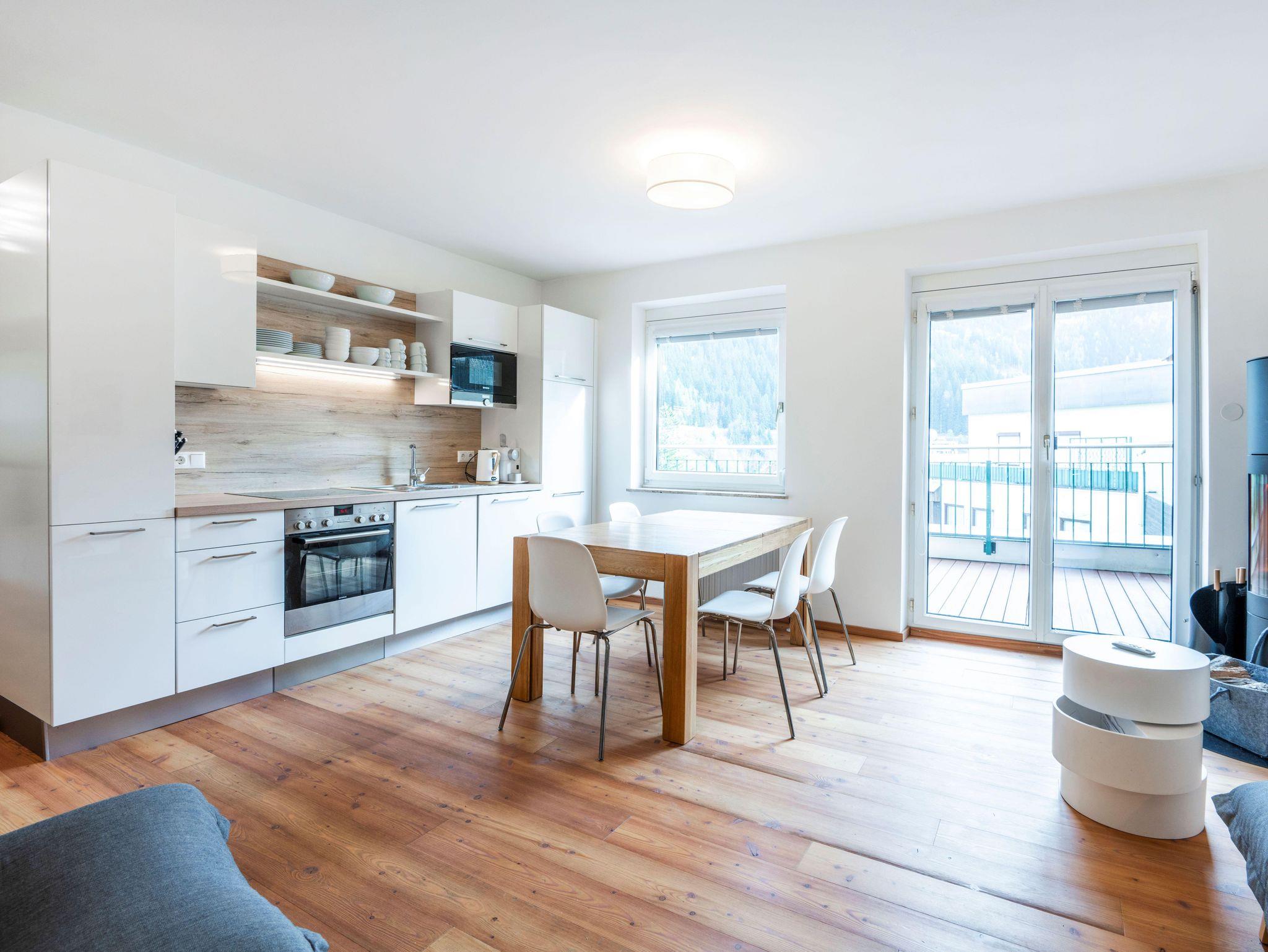 Das Apartment verfügt über 2 Schlafzimmer, 2 Badezimmer, ein Wohnzimmer mit offener Küche, Essbereich und einem Kaminofen.