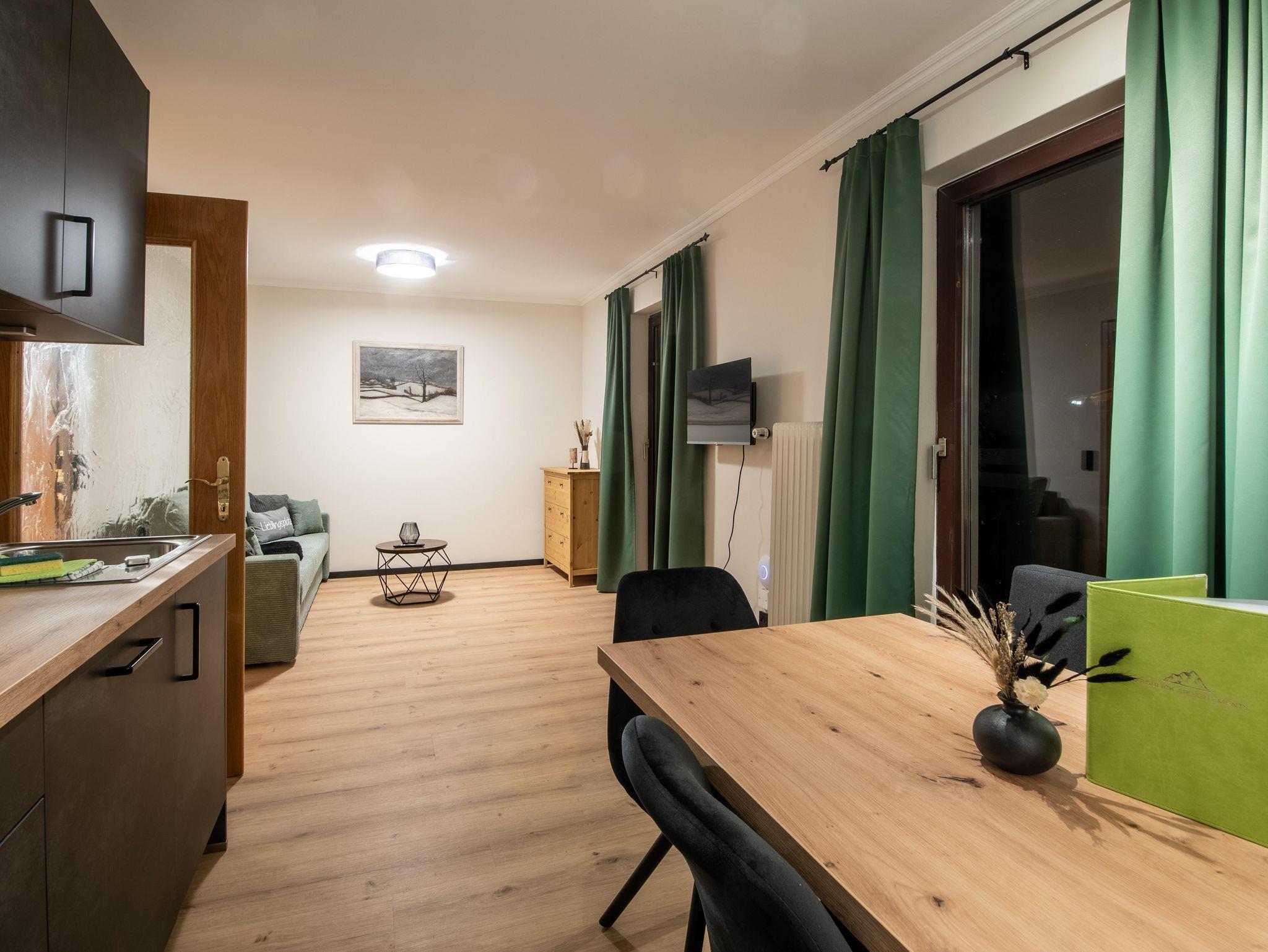 NATURNAHER KOMFORT FÜR BESONDERE MOMENTE Das Schareck Appartement, geeignet für 2 bis 4 Personen, bietet eine vollausgestattete Küche, ein gemütliches Doppelzimmer mit Bad/Dusche und einen Balkon. Die moderne Einrichtung mit lebendigem Moos und natürlichen Farben schafft eine Atmosphäre der Ruhe. Eine gemütliche Sitzecke und eine Schlafcouch runden das Angebot ab. Genießen Sie moderne Annehmlichkeiten wie SAT/TV, WLAN und Minibar in einem umweltbewussten Ambiente.