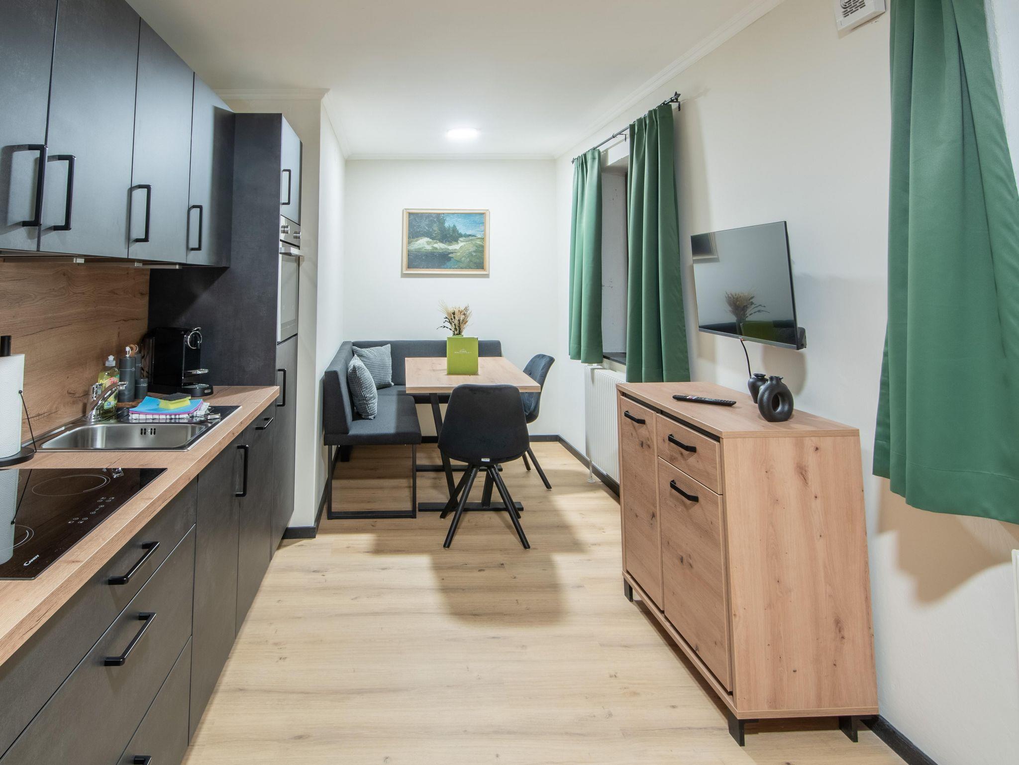 KLEINE AUSZEIT MIT GROSSEM CHARM Das Ankogel Appartement, ideal für 2 bis 3 Personen, bietet ein gemütliches Doppelbett, eine kleine Schlafcouch für Kinder, eine gemütliche Sitzecke, eine vollausgestattete Küche sowie ein modernes Bad. Das Appartement vereint Funktionalität und Wohlfühlatmosphäre, umrahmt von natürlichen Grüntönen und Moosdekorationen, die Sie die Nähe zur Natur spüren lassen.