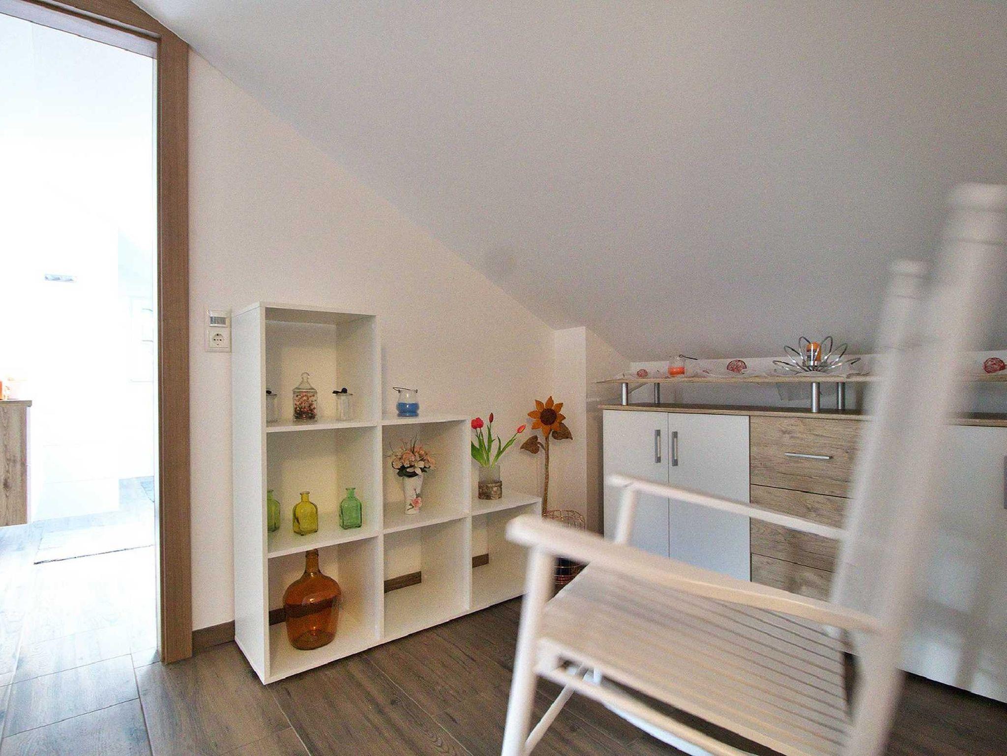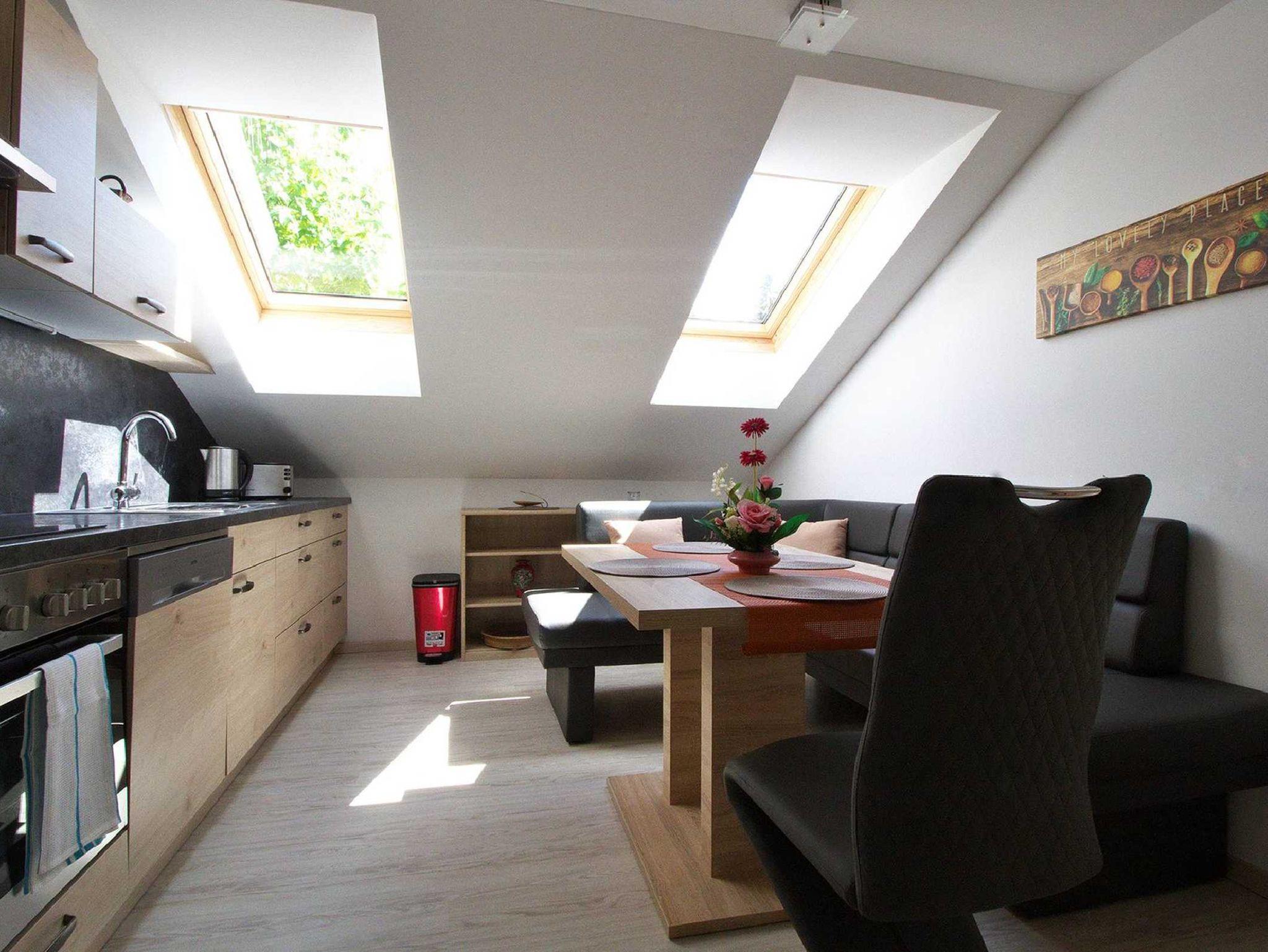Das Apartment ist 70m² groß und befindet sich im 1. Stock über dem Erdgeschoß und bietet Platz für 1-4 Personen. und ist mit einer Außenstiege durch einen eigenen Eingang zu erreichen. Die Wohnküche ist komplett eingerichtet und mit einem Ceranofen, Kühlschrank und Gefrierfach ausgestattet. Eine gemütliche Sitzecke und ein Fernseher laden zum Wohlfühlen und entspannen ein. Alle Zimmer und Nebenräume sind mit einer Fußbodenheizung ausgestattet. Bettwäsche, Bade- , Hand- und Geschirrtücher sind im Preis inkludiert.