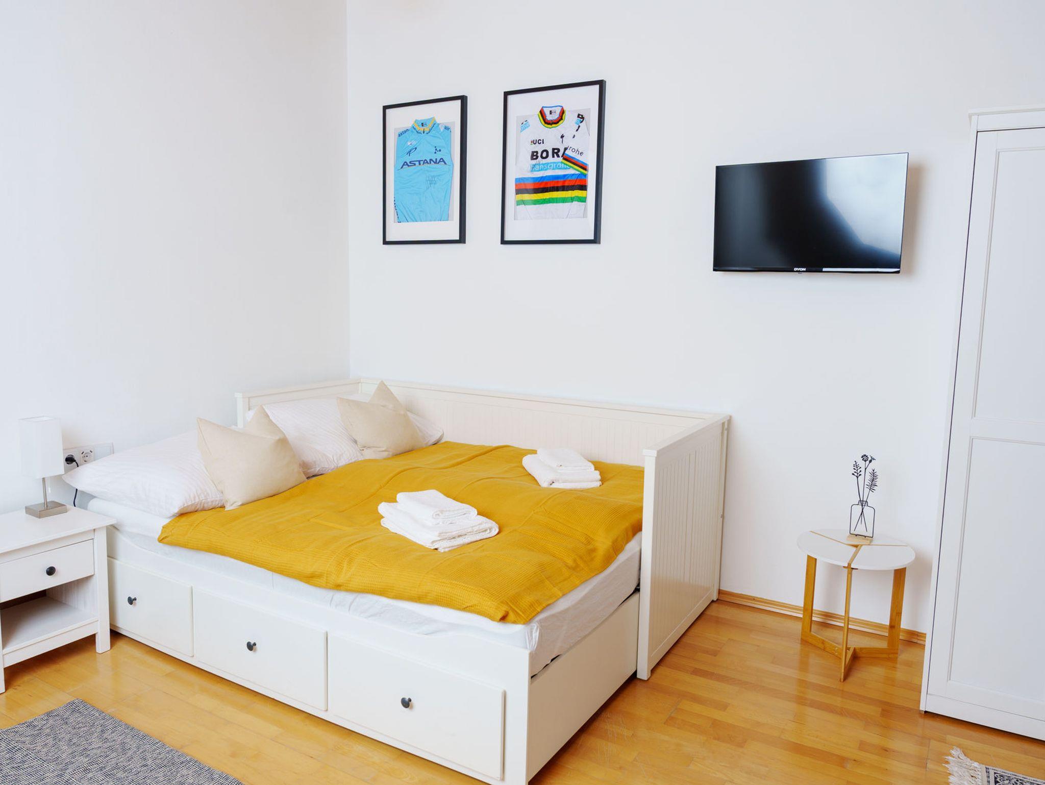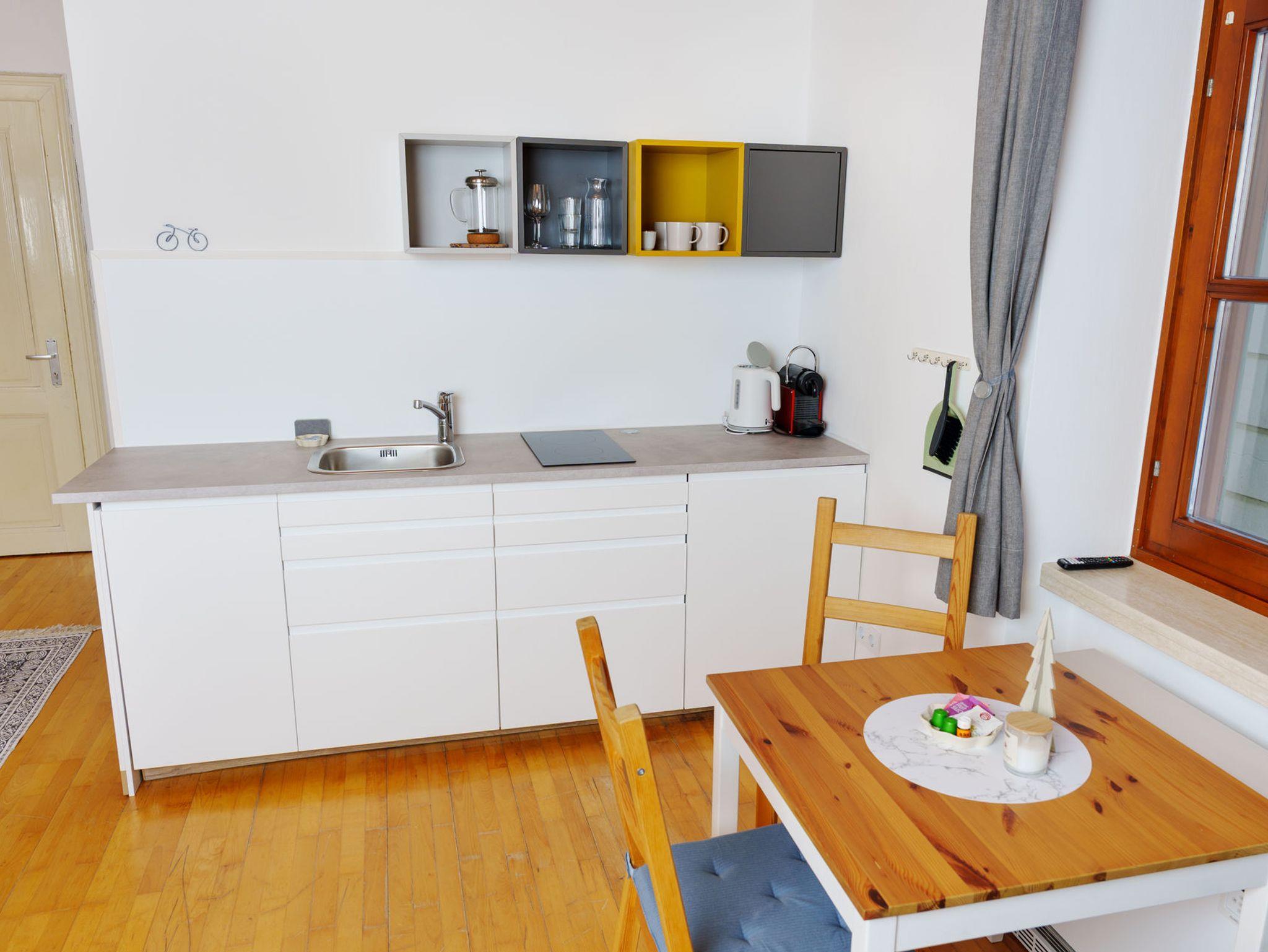 Das Studio ist eine gemütliche Garconniere mit einem kombinierten Wohn- und Schlafraum sowie einem separaten Badezimmer im 1. Stock eines Wohnhauses.