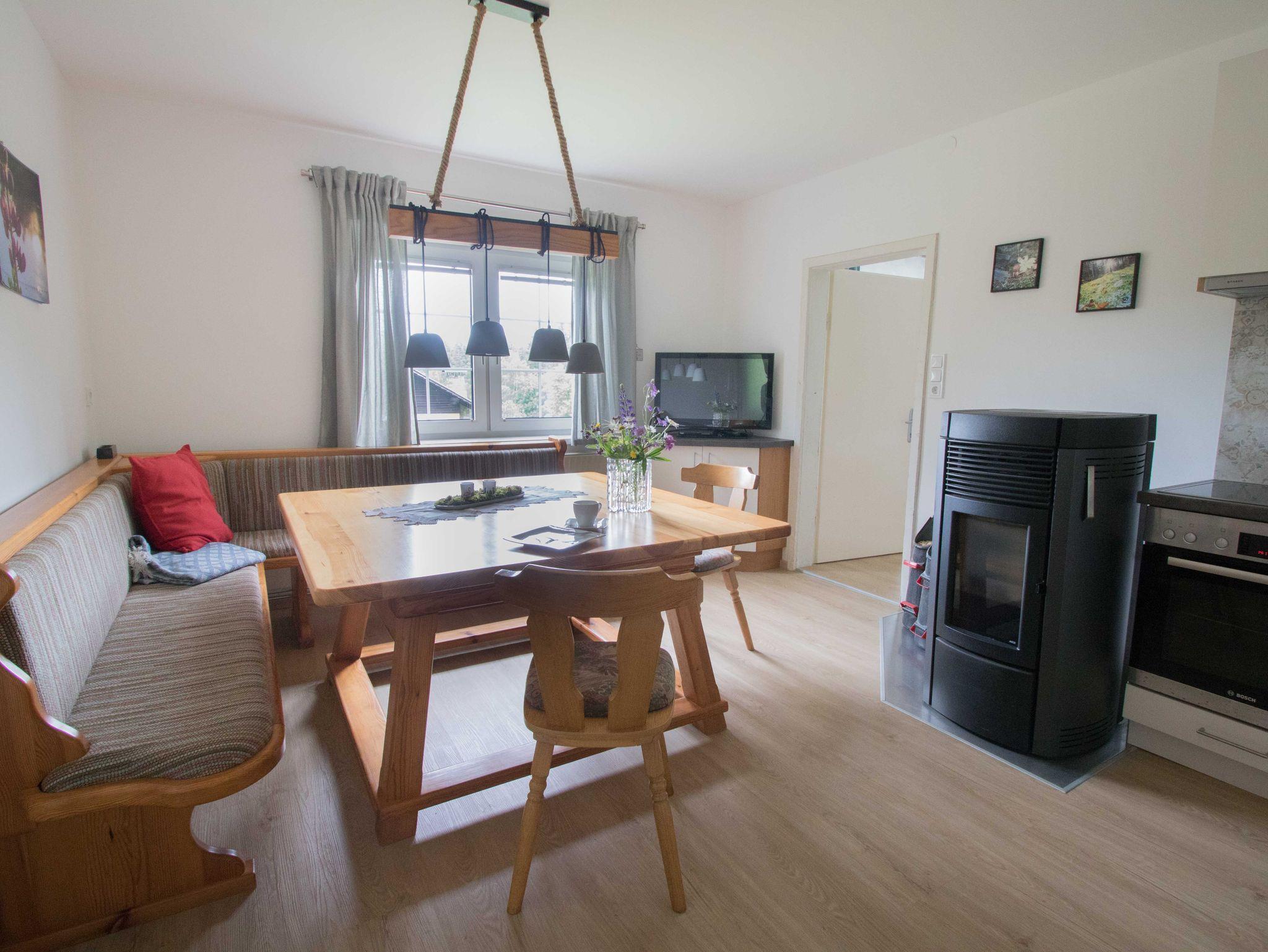 Eine große Stube mit gut eingerichteter Küche (Geschirrspüler, Backofen und Tschibo Kaffeemaschine) ist der zentrale Raum. Ein Pellets Ofen sorgt für gemütliche Wärme im Haus. 2 Schlafzimmer bieten Platz für 4 Personen.
