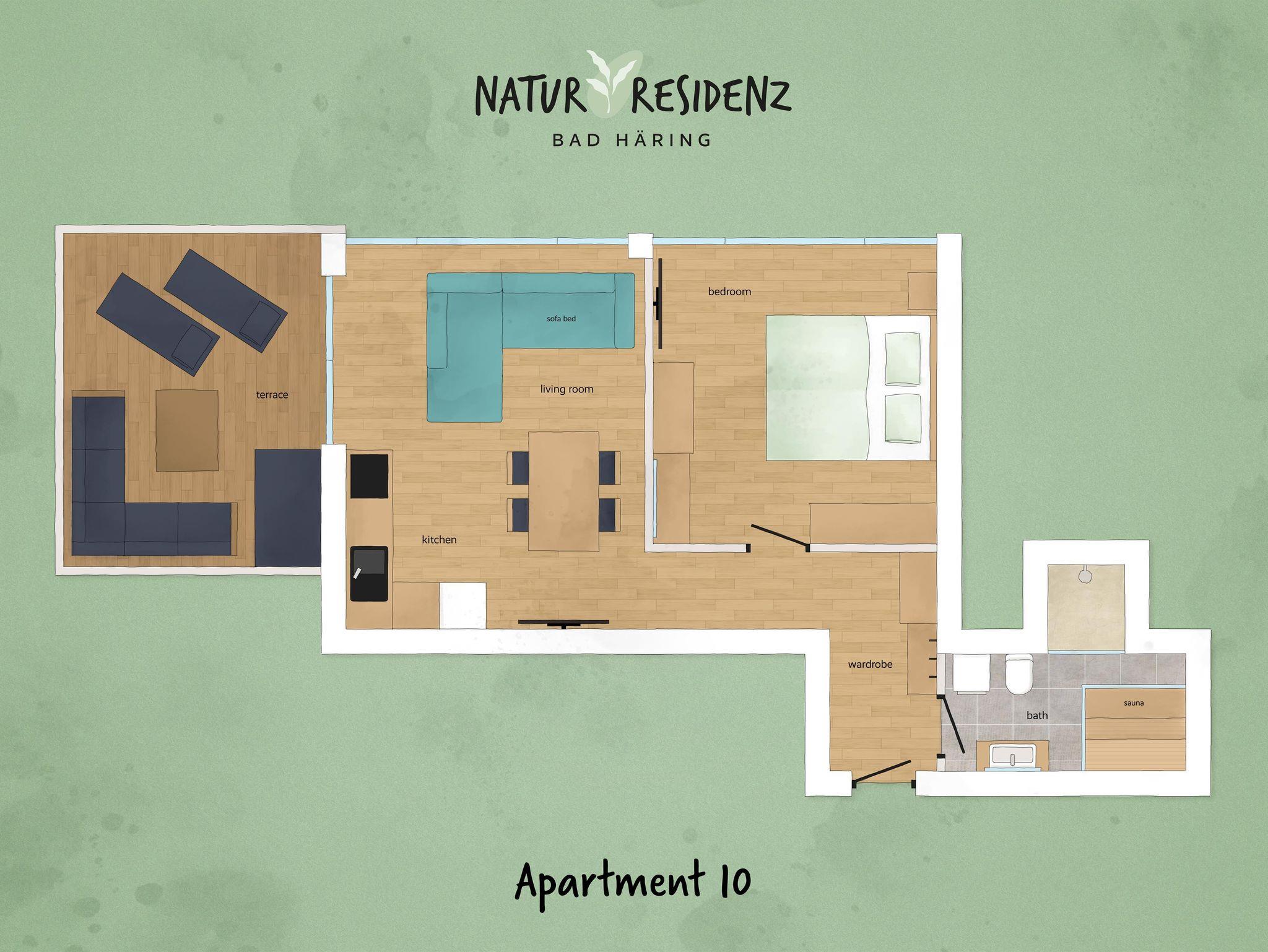 Herzlich willkommen in den gemütlichen und stilvoll eingerichteten Apartments von der Natur Residenz Bad Häring. Das Apartment 10 ist Dein zu Hause auf Zeit im malerischen Bad Häring. Großzügige 51m² warten darauf von dir bewohnt zu werden. Es gibt einen geräumigen Wohn- und Schlafbereich mit Doppelbett und Schlafcouch, sodass bis zu 4 Personen im Apartment 10 wohnen können. Die Küchenzeile lädt zu gemütlichen Kochabenden aller Art ein. Weiters verfügt der Wohnraum über eine komfortable Couch auf welcher man entspannen und auf dem großen Smart-TV fernsehen kann. Einfach zurücklehnen und das herrliche Ambiente genießen, eine warme Dusche im angrenzenden Badezimmer nehmen oder auf dem ebenfalls angrenzenden Terasse die letzten Sonnenstrahlen des Tages einfangen. Das alles ist möglich in Deiner Natur Residenz Bad Häring. Das - und noch vieles mehr - also nichts wie los und ab in die Berge Tirols!