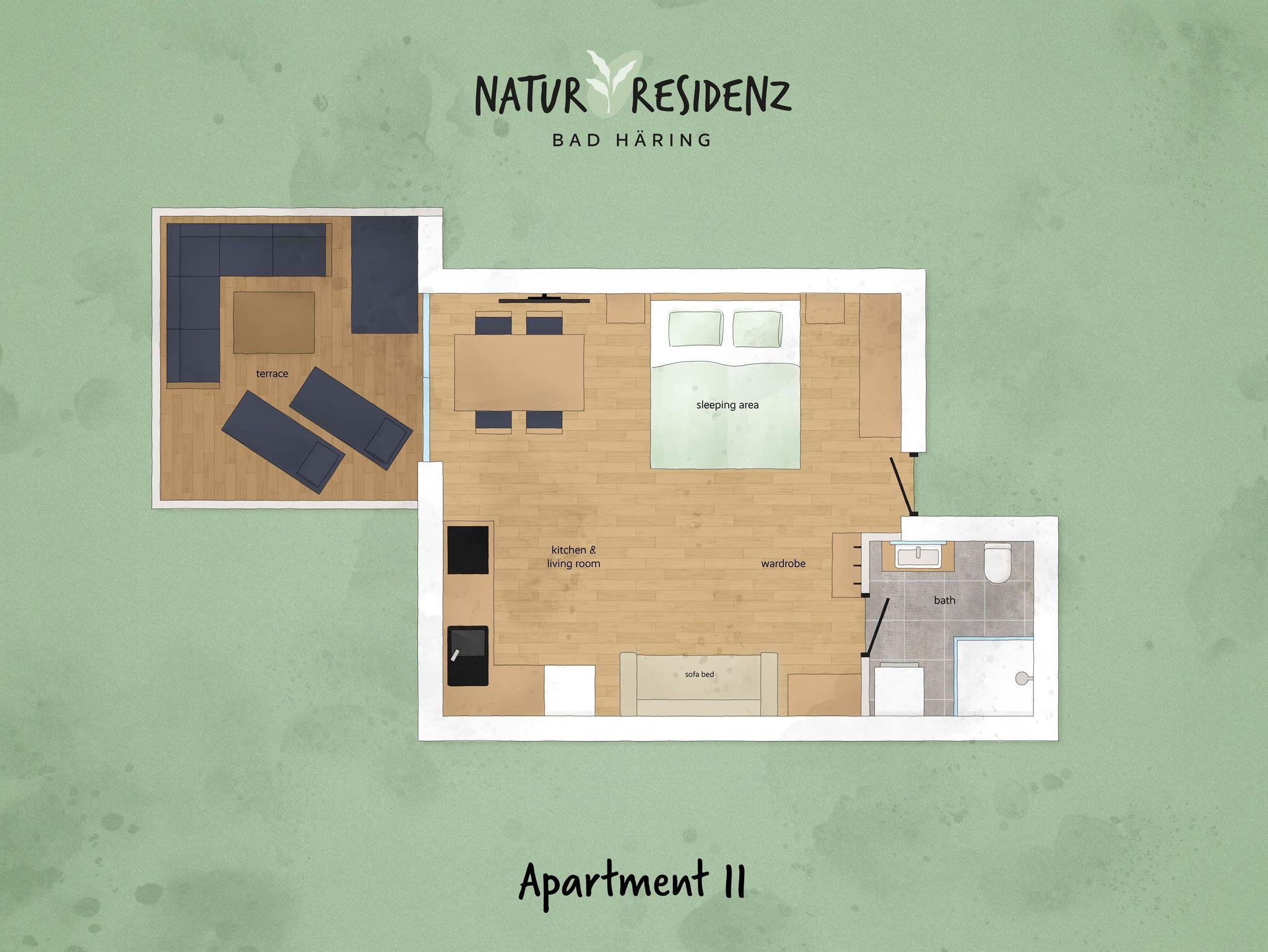 Herzlich willkommen in den gemütlichen und stilvoll eingerichteten Apartments von der Natur Residenz Bad Häring. Das Apartment 11 ist Dein zu Hause auf Zeit im malerischen Bad Häring. Großzügige 43m² warten darauf von dir bewohnt zu werden. Es gibt einen geräumigen Wohn- und Schlafbereich mit Doppelbett und Schlafcouch, sodass bis zu 4 Personen im Apartment 11 wohnen können. Die Küchenzeile lädt zu gemütlichen Kochabenden aller Art ein. Weiters verfügt der Wohnraum über eine komfortable Couch auf welcher man entspannen und auf dem großen Smart-TV fernsehen kann. Einfach zurücklehnen und das herrliche Ambiente genießen, eine warme Dusche im angrenzenden Badezimmer nehmen oder auf dem ebenfalls angrenzenden Terasse die letzten Sonnenstrahlen des Tages einfangen. Das alles ist möglich in Deiner Natur Residenz Bad Häring. Das - und noch vieles mehr - also nichts wie los und ab in die Berge Tirols!