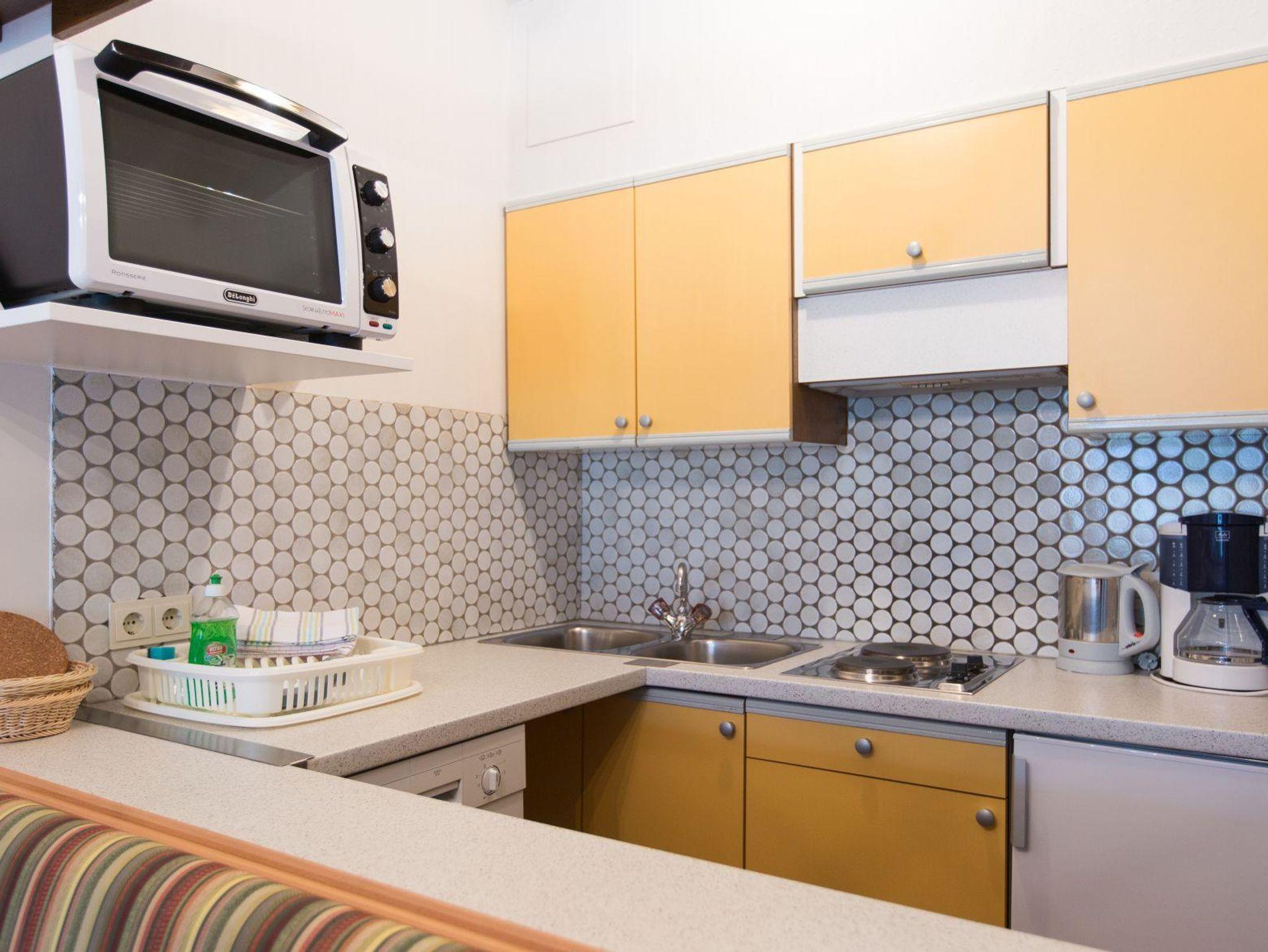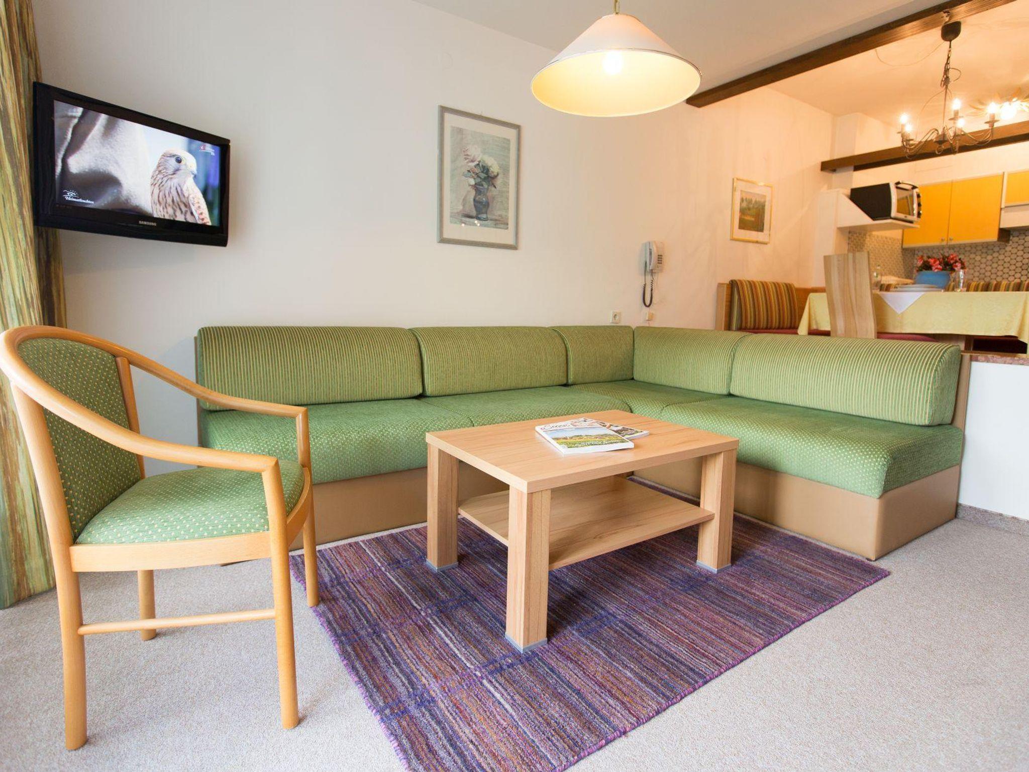 Typ A (42m²) ist ein Studioappartement mit geräumigem Wohnschlafraum mit Doppelbett hinter einem Vorhang, gemütliche Sofaecke (2 Betten), Dusche/WC (Haarföhn) und seperates WC, großer Balkon oder Terrasse in Südlage, integrierte Küchenzeile mit 2 Plattenherd, Geschirrspüler, Kaffeemaschine, Kühlschrank (mit Gefierfach), Backrohr, Wasserkocher, und auf Wunsch auch eine Mikrowelle und Toaster. Eßeckbank mit großem Tisch, Flat-TV mit internationalen Programmen, Safebox, Telefon und gratis WLAN.