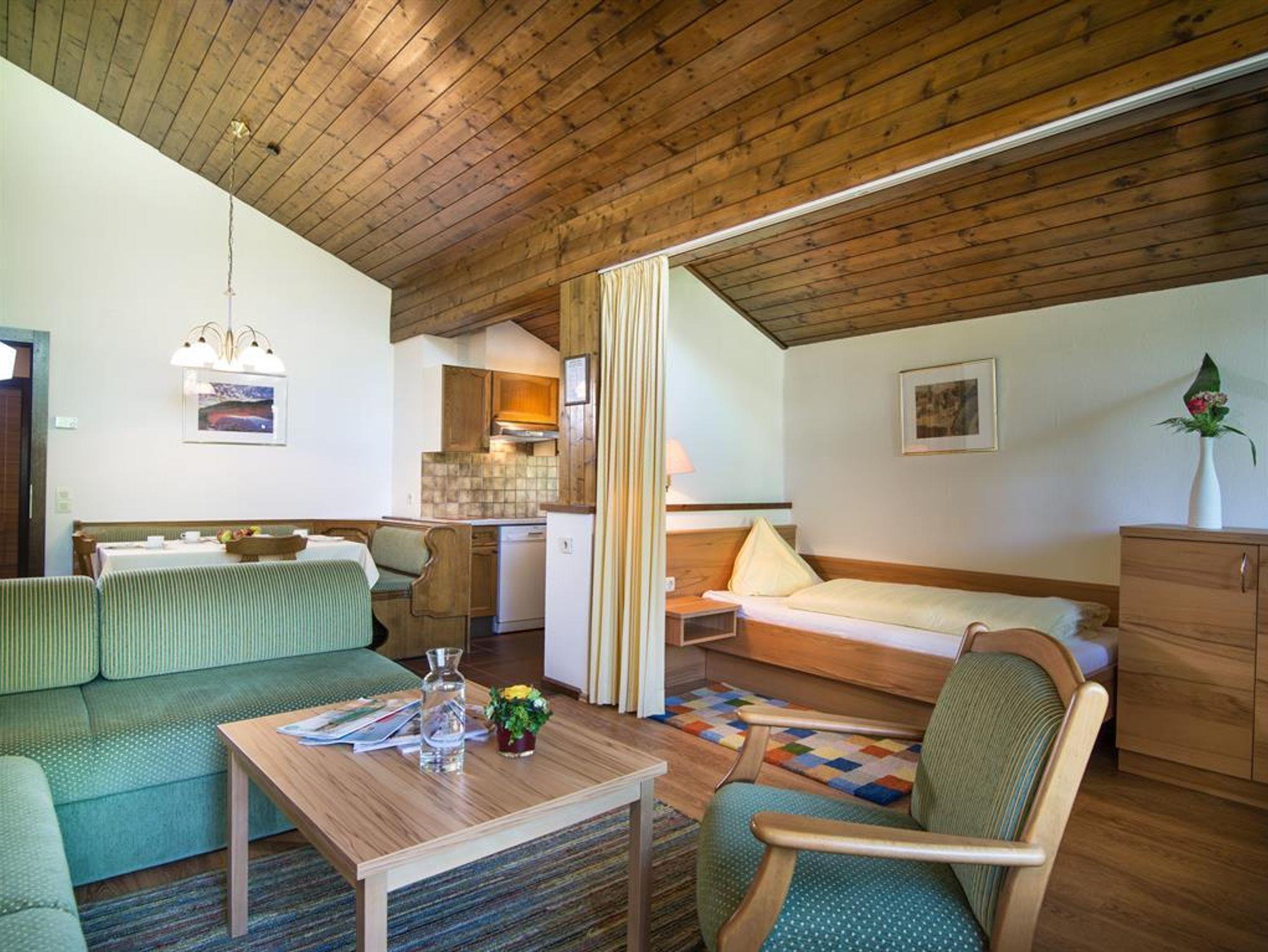 Gemütliches Appartement mit 47 m² in der obersten Etage mit herrlichem Ausblick. Separates Schlafzimmer mit 2 getrennten Einzelbetten, Doppelbett und Schlafcouch (nur für 1 Kind) sind im Wohnzimmer, Küche mit Geschirrspüler, Essecke, Badezimmer u. extra WC, möblierter, großer Balkon (nordseitig). Der Lift reicht bis zum 3. Stock, dieses Appartemet ist im 4. Stock und über eine Stiege erreichbar.