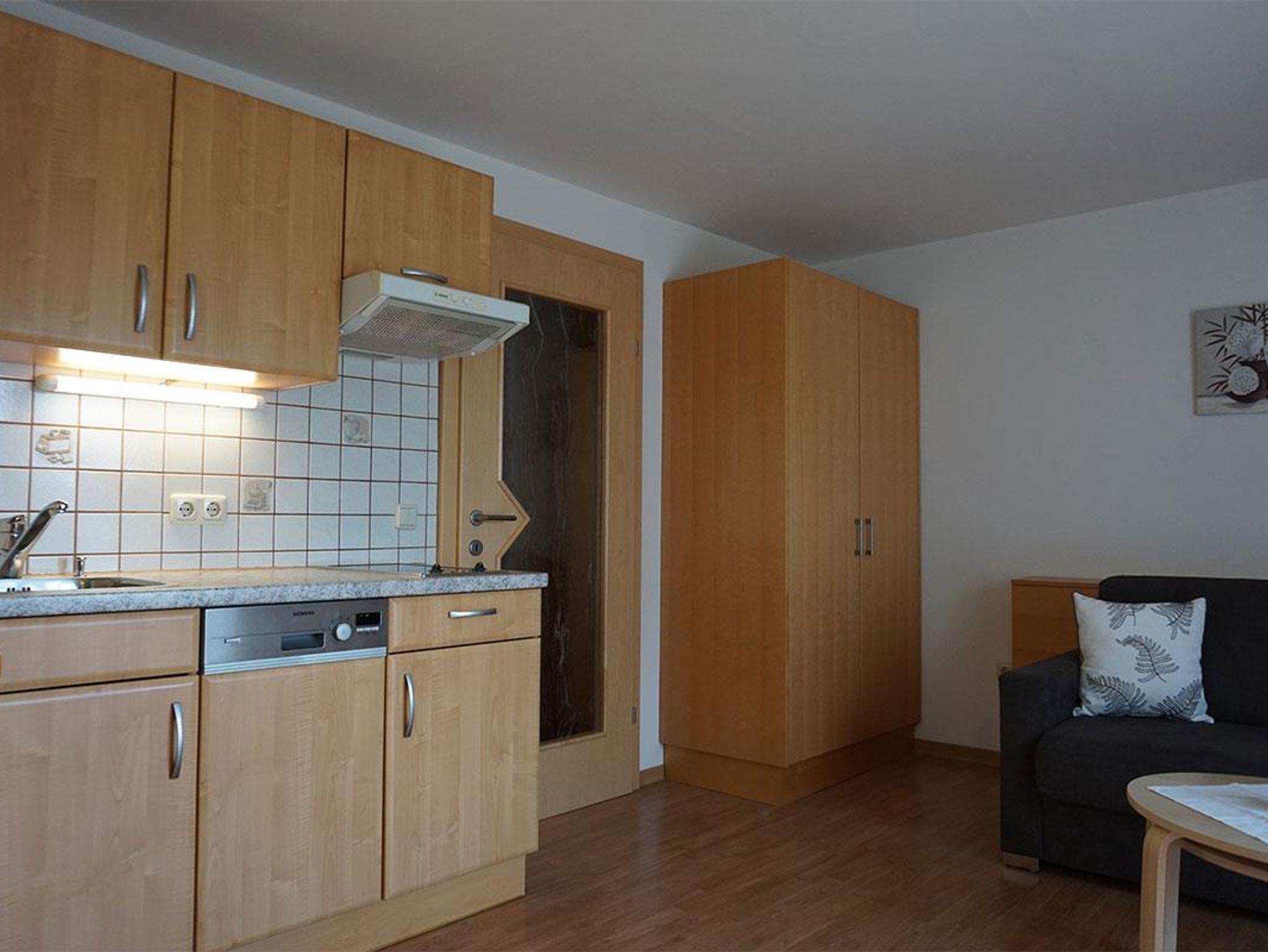 Dieses Appartement besteht aus einer Wohnküche mit Esstisch und Couch, Küchenzeile (voll ausgestattet), 1 kleines Schlafzimmer mit 2 Einzelbetten auch zum zusammenschieben, Dusche und WC. TV und CD-Player mit Radio und Haarföhn sind vorhanden. Der Balkon ist südseitig mit wunderschönen Ausblick auf die Gasteiner Bergwelt. Bettwäsche, Bade-und Handtücher sowie Geschirrtücher sind vorhanden. W-Lananschluss ist im Haus, hier wird ein einmaliger Betrag von Euro 5,00 verrechnet. Dieses Appartement wird im Sommer, Frühjahr und im Herbst auch als Einzelbelegungen für Stollengäste vergeben
